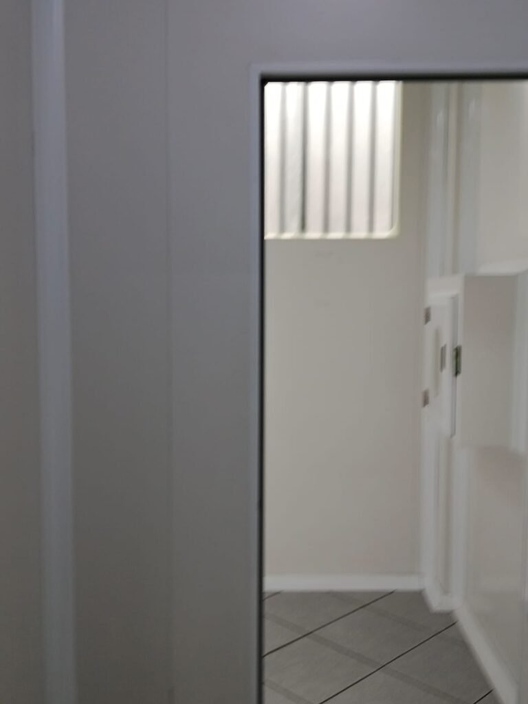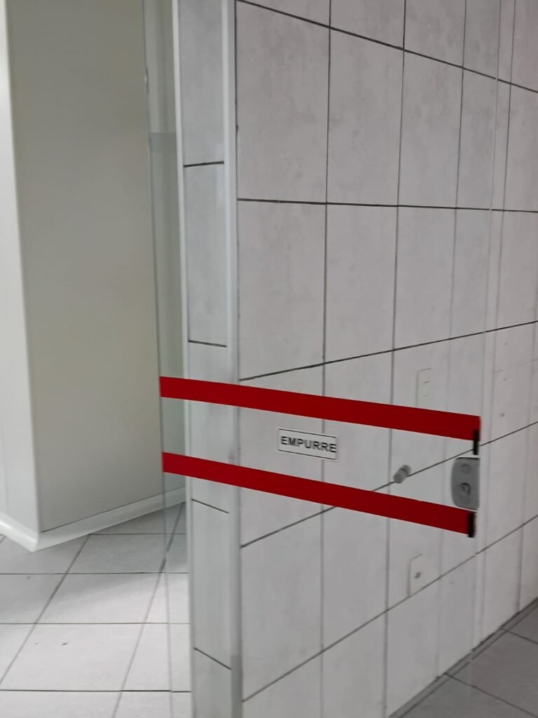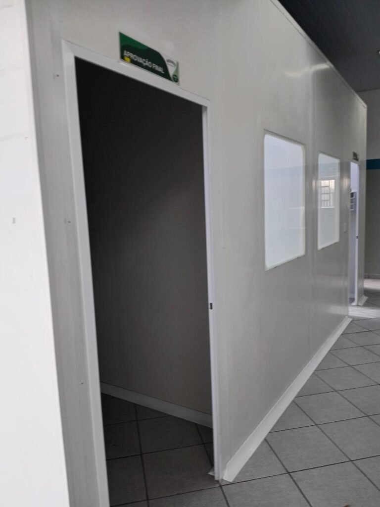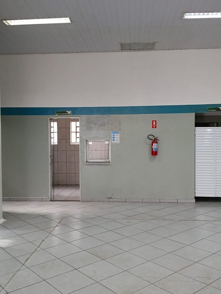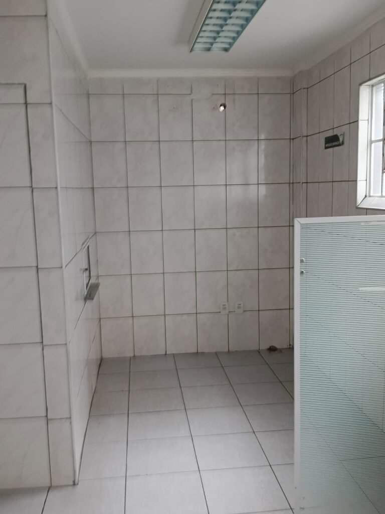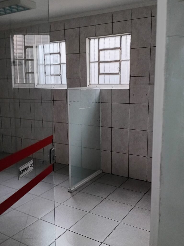 SALA 01 GALPÃO:- 01 Porta de vidro com puxador e fechadura em ordem, piso revestido de frio cerâmico cinza em ordem, parede revestida de frio cerâmico na cor branco em ordem com alguns buracos com bucha e buraco para instalação de ar-condicionado, 03 espelhos com 01 tomada 127V em cada não testada, 01 ralo de inox em ordem 01 divisória de vidro com esquadrias branca em ordem, 02 vitrô basculantes com 08 vidros em ordem em cada um deles, 01 luminária calha com 16 lâmpadas de led sendo que 03 estão queimadas, 01 torneira de inox com 2 saídas em ordem, 01 encanamento para pia em ordem, 01 espelhos de energia com 01 interruptor em ordem.