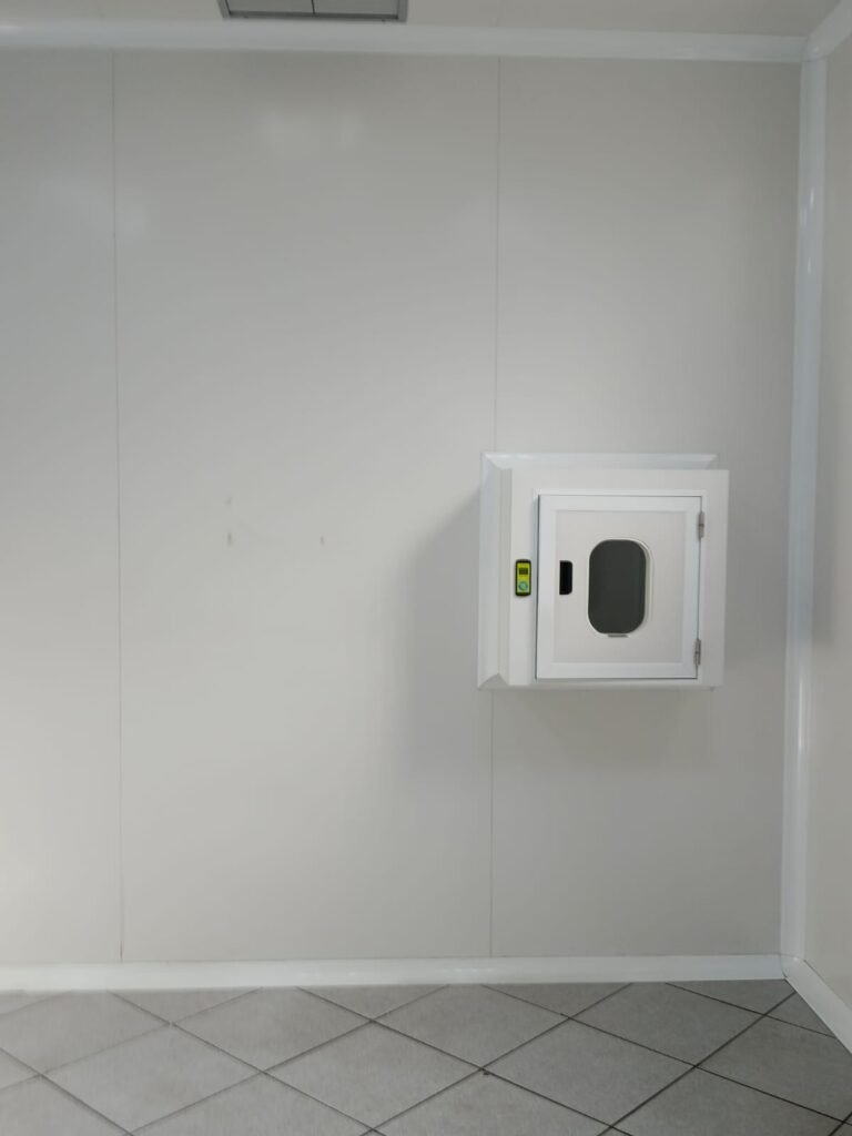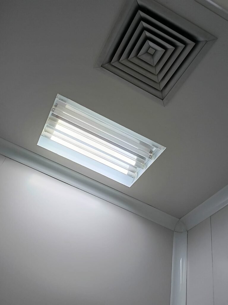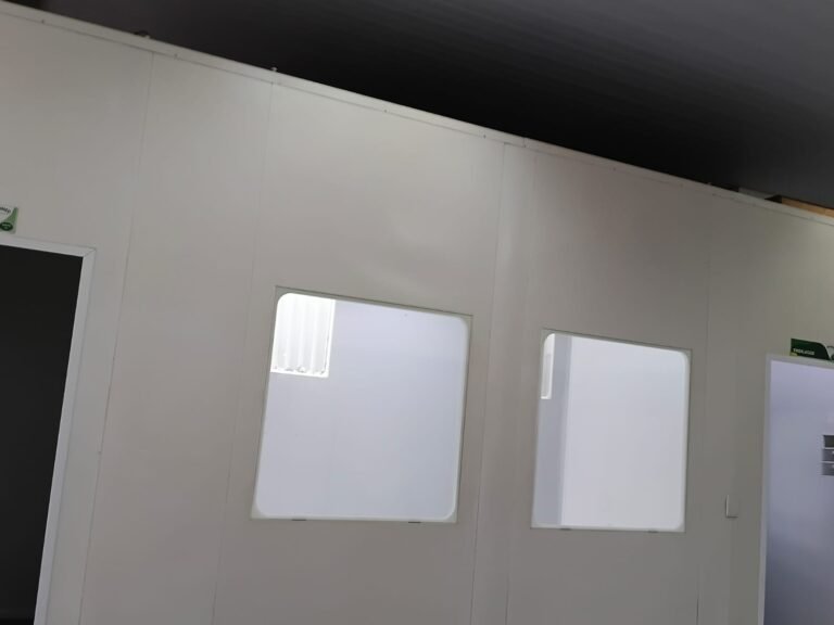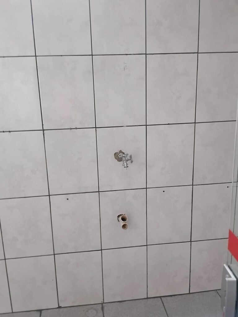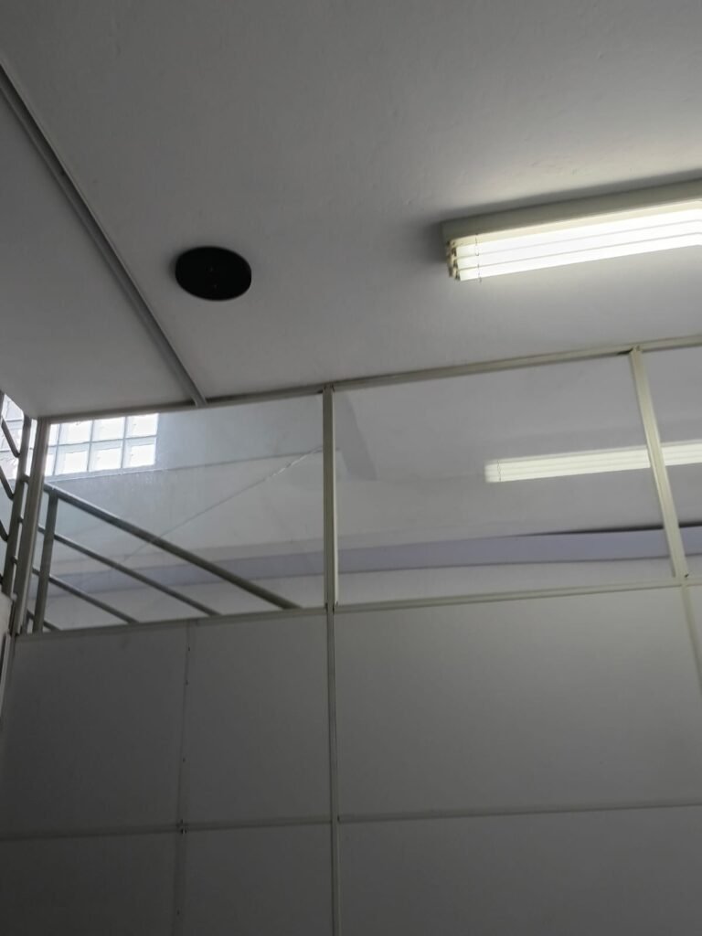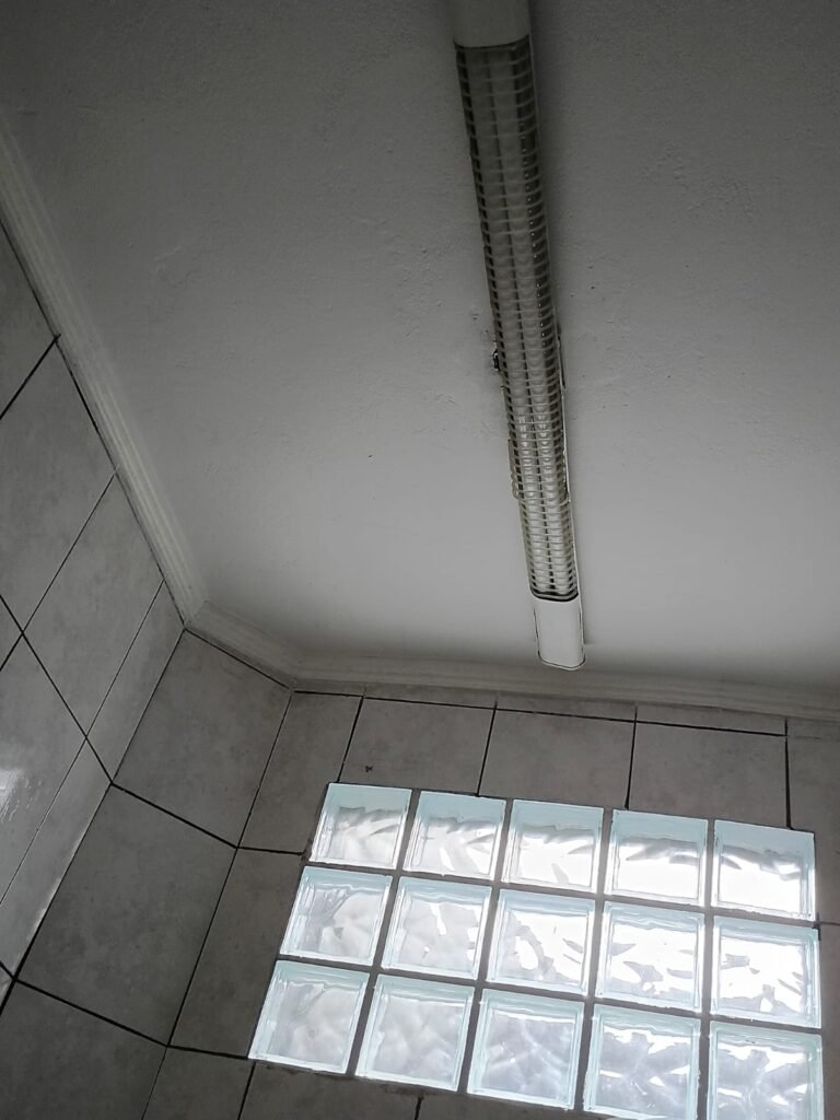 SALA 01 GALPÃO:- 01 Porta de vidro com puxador e fechadura em ordem, piso revestido de frio cerâmico cinza em ordem, parede revestida de frio cerâmico na cor branco em ordem com alguns buracos com bucha e buraco para instalação de ar-condicionado, 03 espelhos com 01 tomada 127V em cada não testada, 01 ralo de inox em ordem 01 divisória de vidro com esquadrias branca em ordem, 02 vitrô basculantes com 08 vidros em ordem em cada um deles, 01 luminária calha com 16 lâmpadas de led sendo que 03 estão queimadas, 01 torneira de inox com 2 saídas em ordem, 01 encanamento para pia em ordem, 01 espelhos de energia com 01 interruptor em ordem.