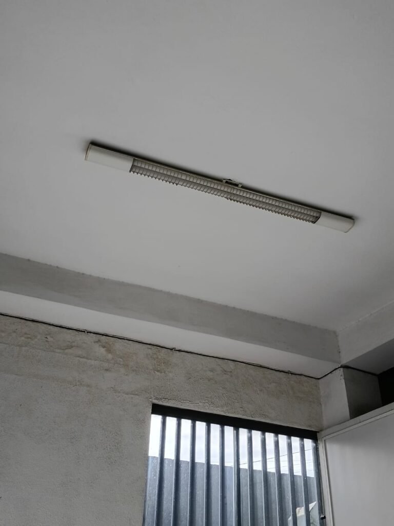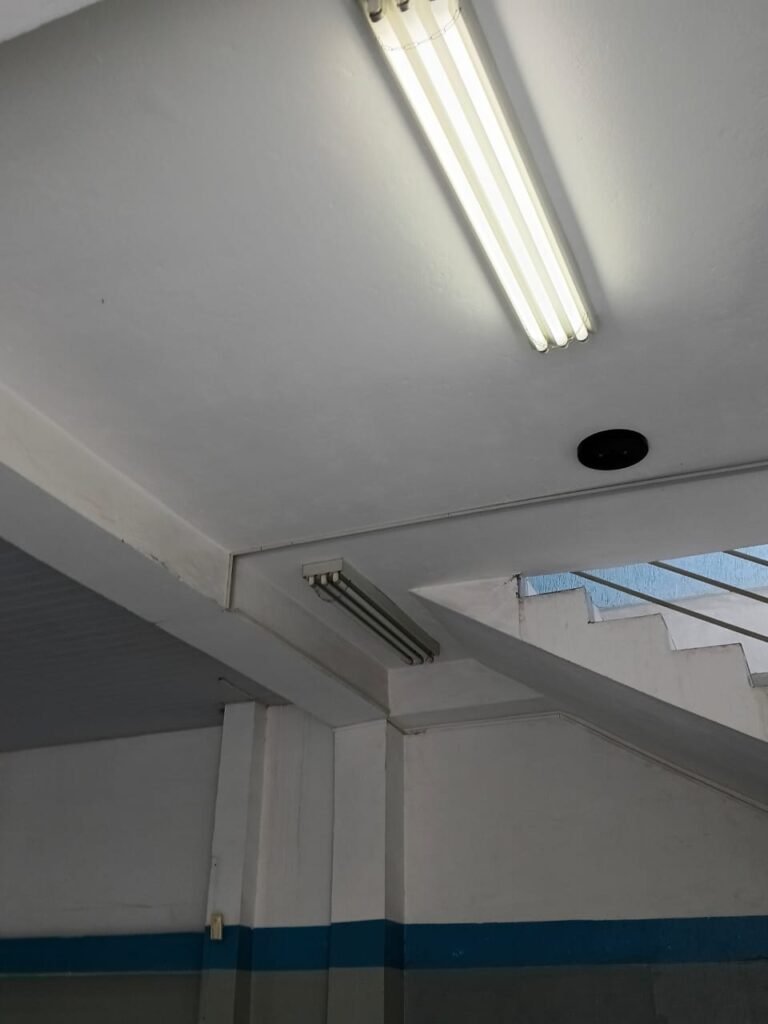 GALPÃO:- 01 porta de enrolar em ordem, paredes com pintura na cor cinza , azul e branco com algumas marcas de cola e restante em ordem, Piso revestido de frio cerâmico branco com algumas manchas, furos com buchas e restante em ordem, 01 sensor não testado, 01 espelho com 01 interruptor em ordem, 09 luminárias calha de embutir com 19 lâmpadas fluorescentes sendo que 05 estão queimadas, 01 luminária linear com led em ordem e funcionando.