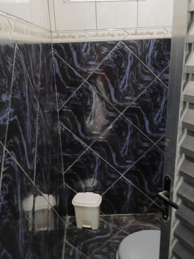 WC FEMININO:- 01 porta vai e vem de alumínio com 02 partes em ordem, 01 porta de inox com fechadura em ordem, parede revestida de frio cerâmico ½ branco em ordem e restante marmorizado azul com preto em ordem e faixa de divisória dos revestimentos branco com desenho beges em ordem, 01 ralo inox não testado, 01 conjunto sanitário cerâmico na cor cinza em ordem, 01 ascendo de privada na cor branco com tampa em ordem, 01 descarga embutida em ordem, 01 pia com coluna na cor cinza em ordem, 01 torneira em ordem, 01 luminárias com 02 lâmpadas led em ordem, 01 espelho com 01 interruptor em ordem, 15 tijolos de vidro para iluminação, 01 poste de energia padrão cpfl com grades em ordem.