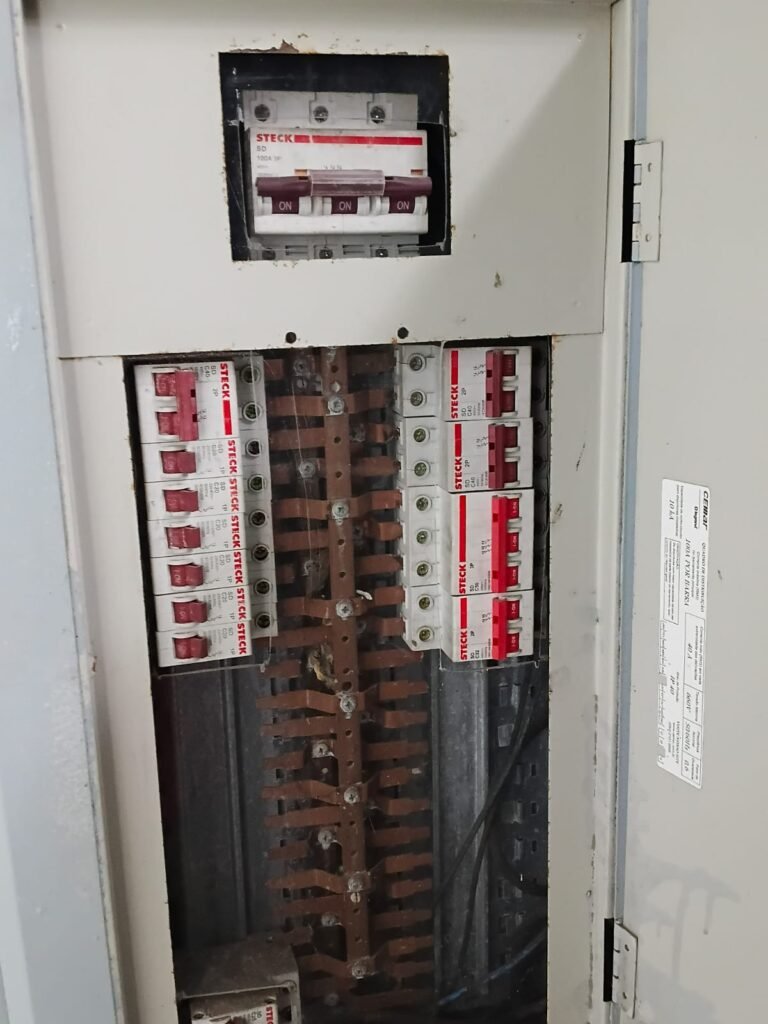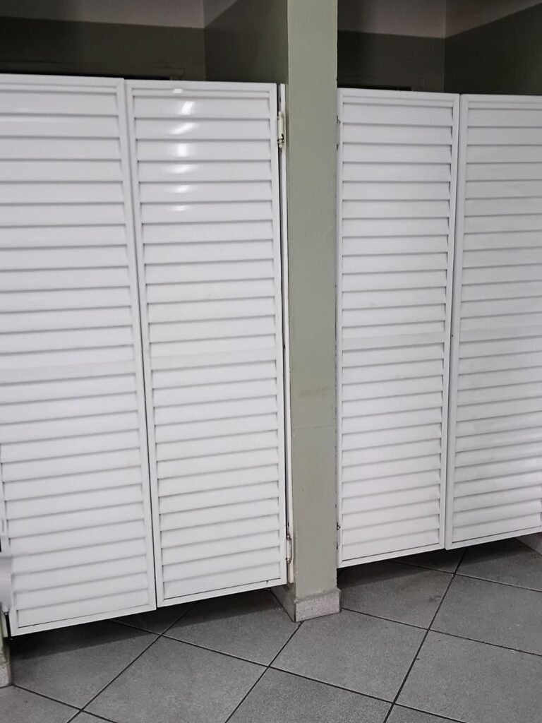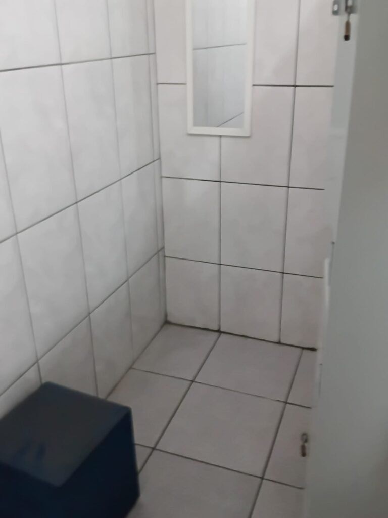 VESTIÀRIO:- 01 Porta, 01 armário de ferro em ordem, 01 espelho com moldura branca em ordem, 01 banco na cor azul em ordem, paredes revestidas de frio cerâmico na cor branca com alguns furos com bucha e restante em ordem, caixa de energia com disjuntores marca STECK em ordem