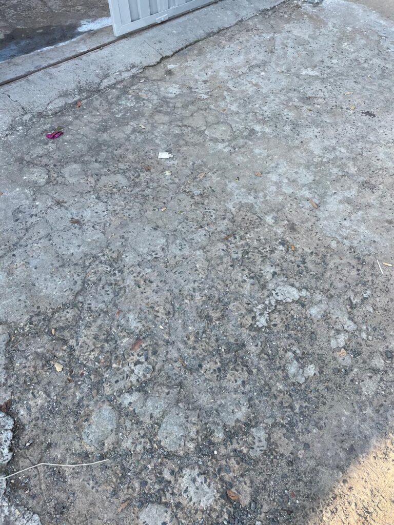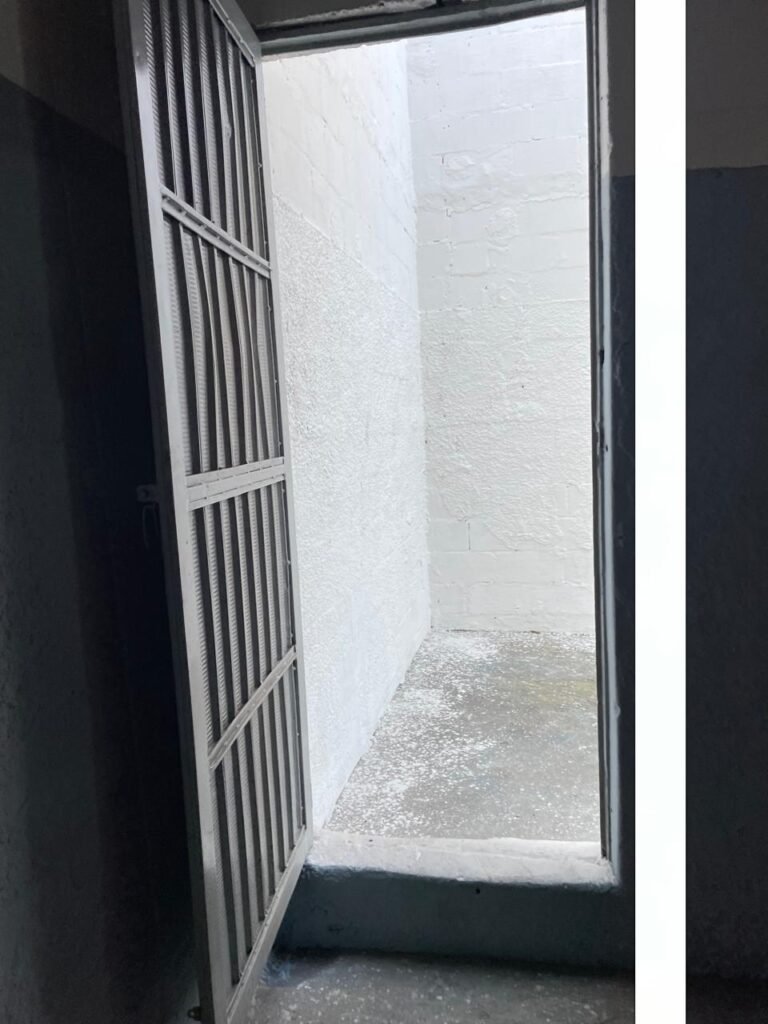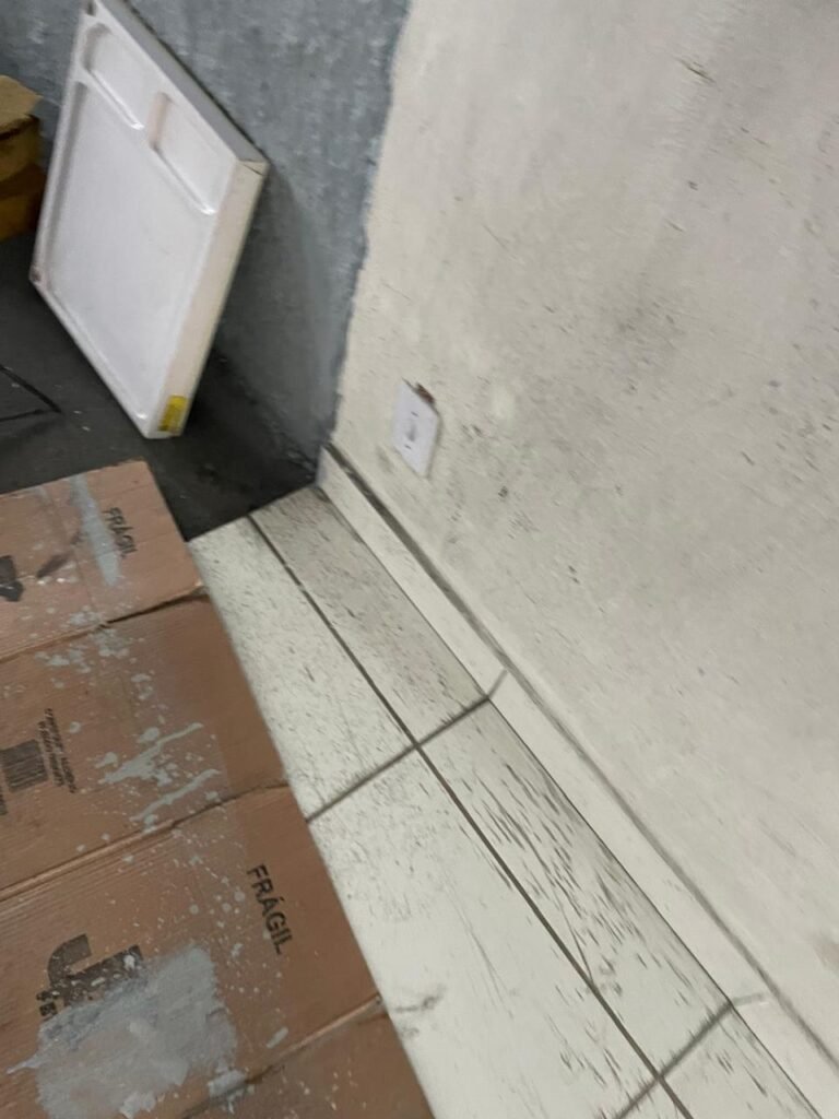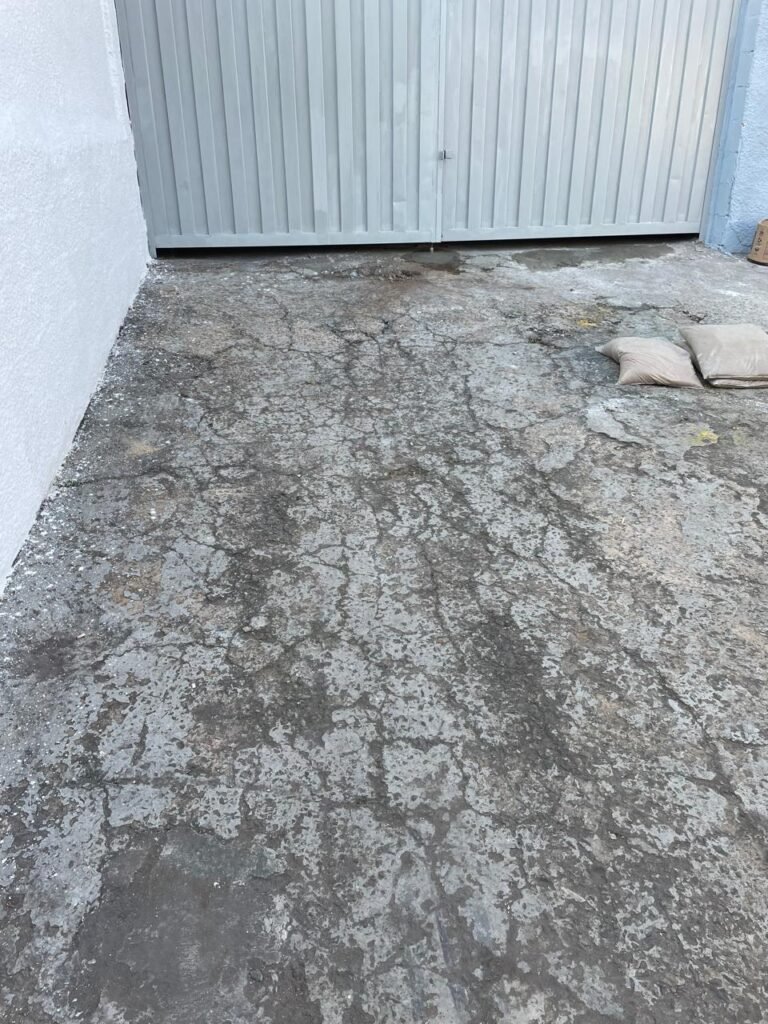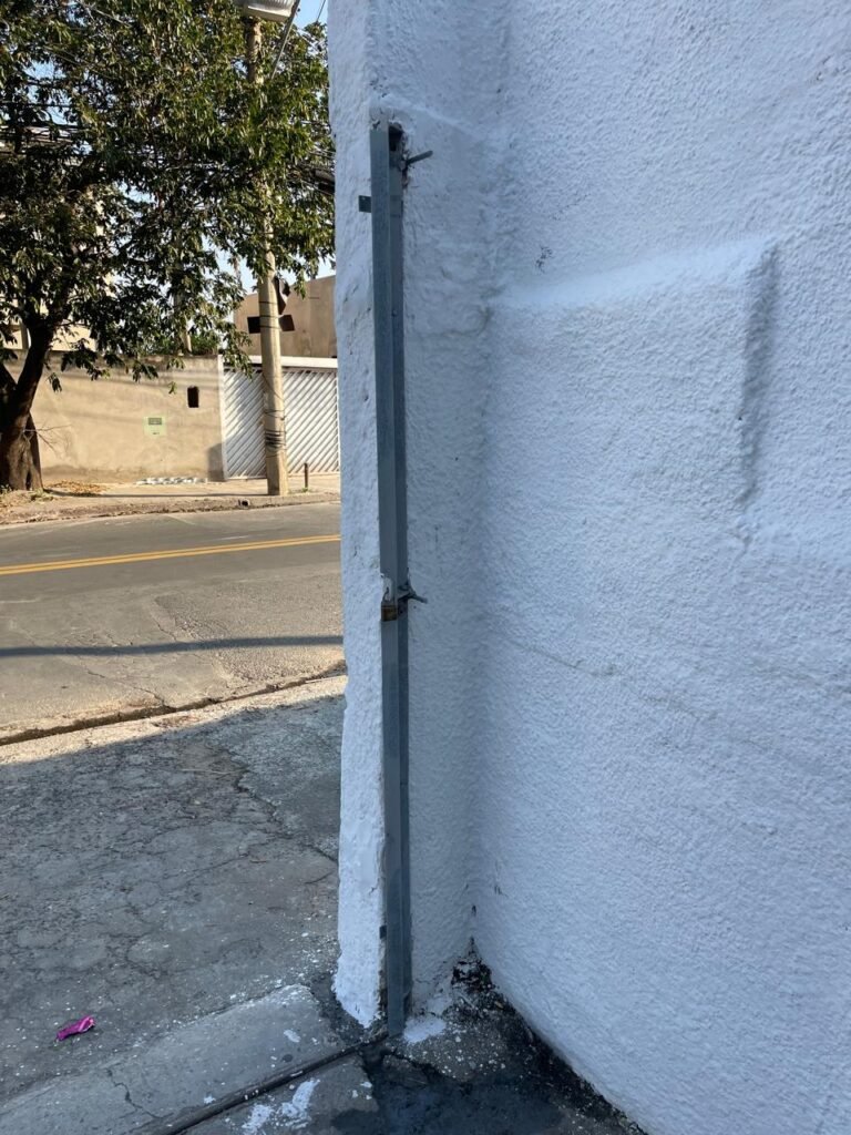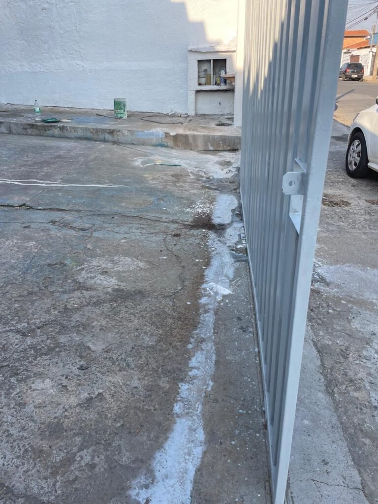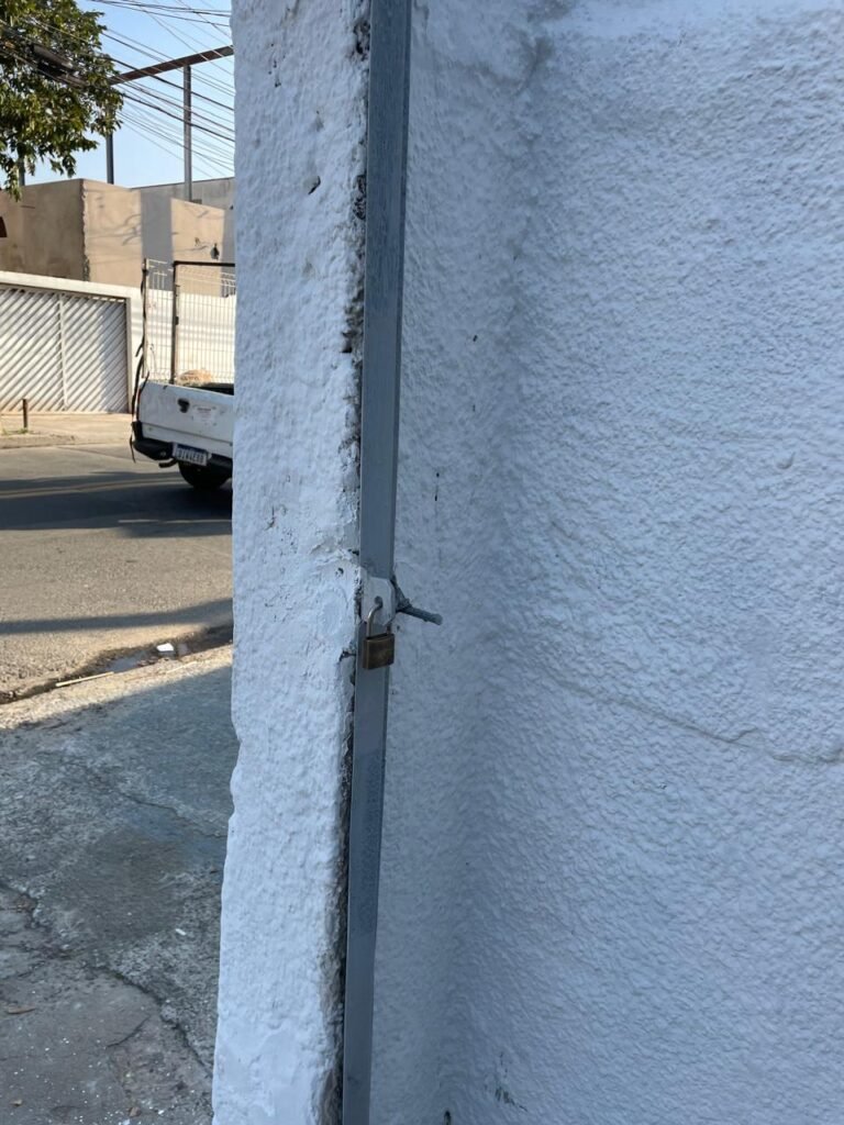 GARAGEM-: Piso de concreto desempenado com pintura desgastada, com rachaduras e manchas de tinta pela extensão, 01 portão de ferro com pintura na cor cinza em ordem e com fechadura com 01 cadeado Marca Pado, muros com pintura na cor branco neve nova e em ordem, 01 poste padrão Concrefer com disjuntor e fiação aparente, 01 construção de alvenaria com pintura na cor branco e 02 caixas de ferro sem tampa, 01 tanque de plástico desgastado e sujo de tinta, 01 torneira de jardim marca Samer, 02 grades de ferro de proteção com pintura na cor cinza de vitrôs, 01 degrau revestido de piso cerâmico sujo de tinta, parede barracão com pintura barrado na cor azul e restante na cor branco neve com respingos de tinta e marcação de dígitos “8-1” restante em ordem, 01 bocal de lâmpada, braquete com 04 polos isoladores de porcelana, 08 janelas de alvenaria em formato de cubos