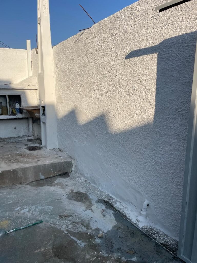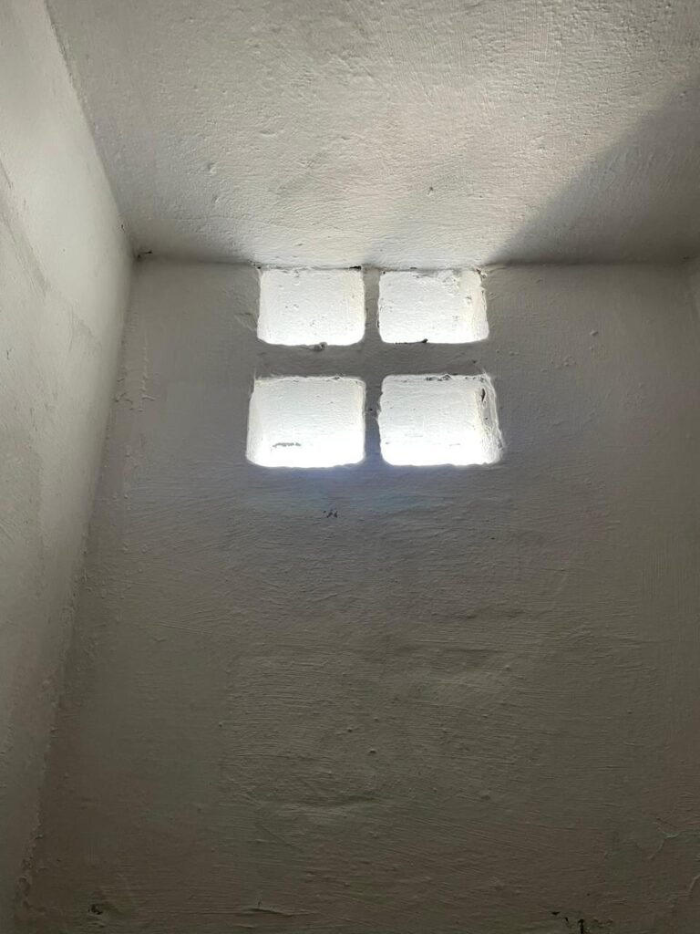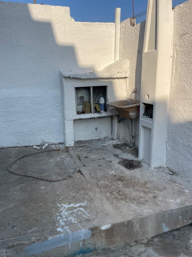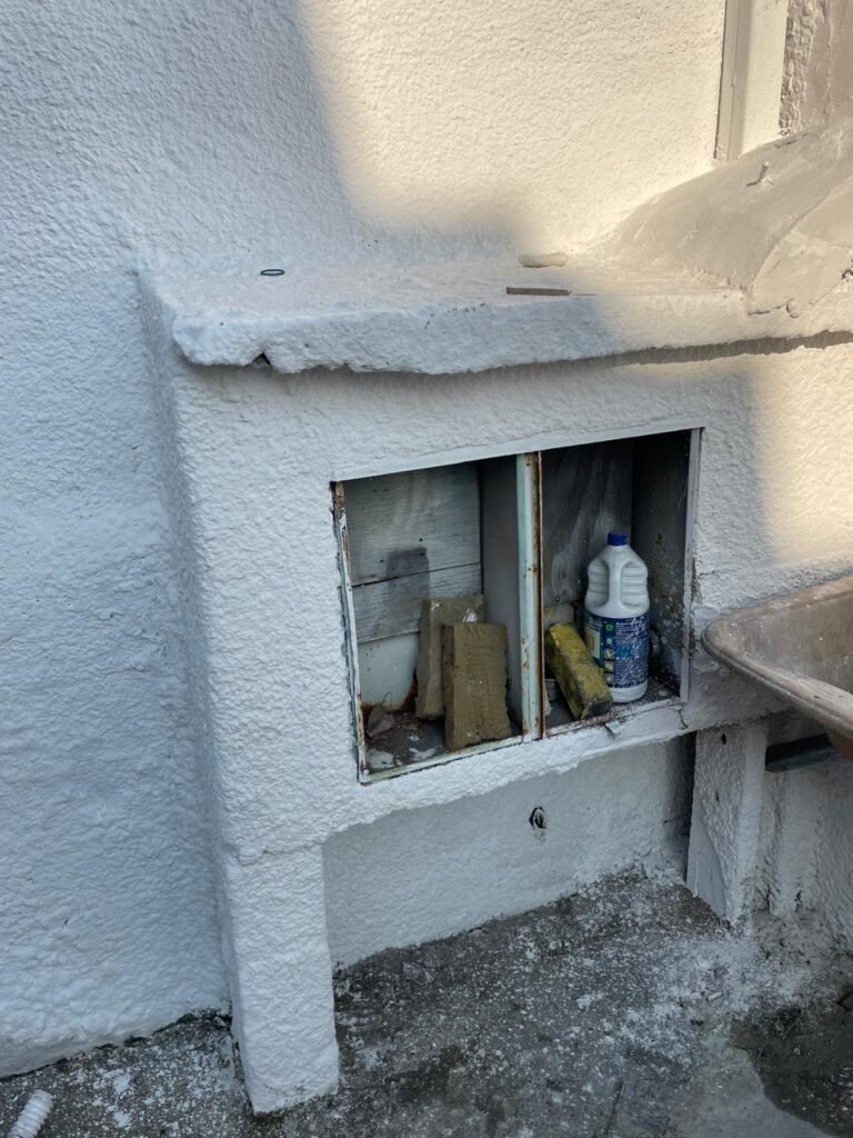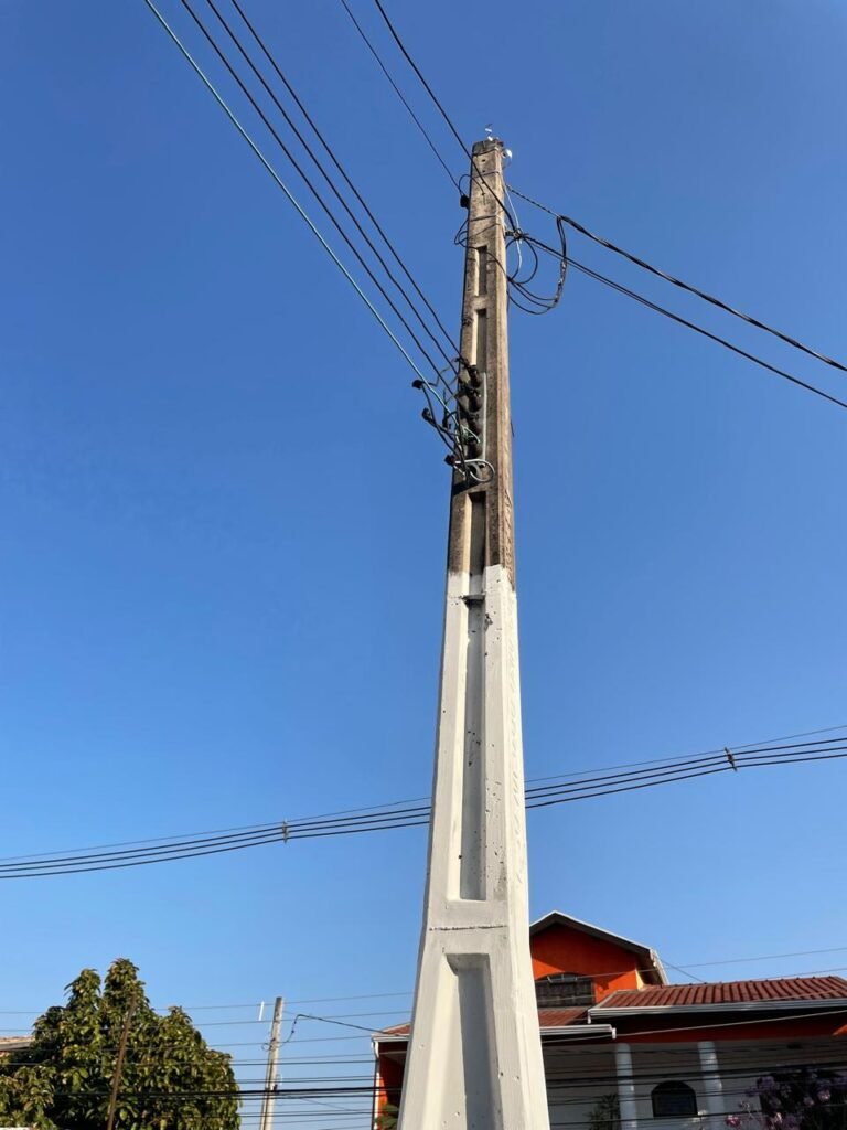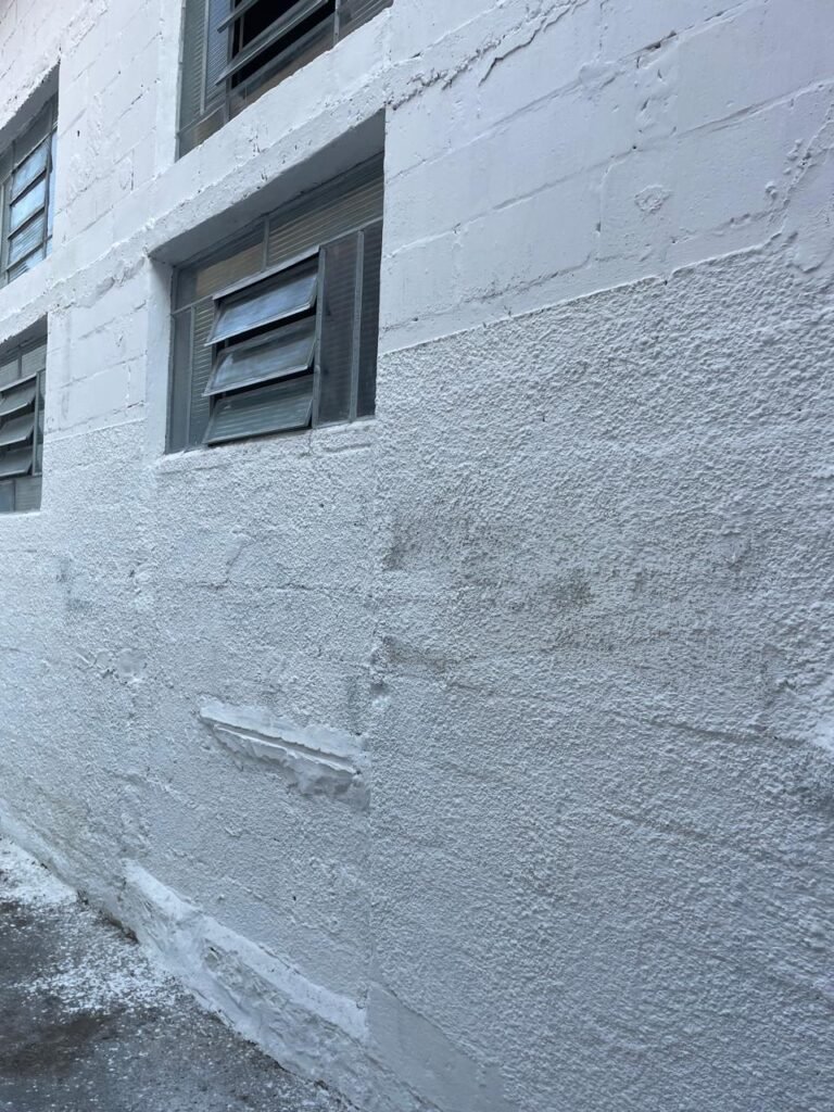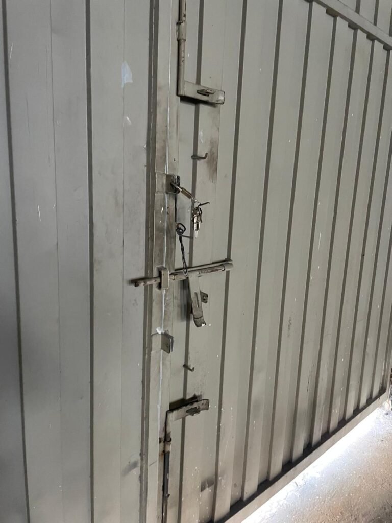 GARAGEM-: Piso de concreto desempenado com pintura desgastada, com rachaduras e manchas de tinta pela extensão, 01 portão de ferro com pintura na cor cinza em ordem e com fechadura com 01 cadeado Marca Pado, muros com pintura na cor branco neve nova e em ordem, 01 poste padrão Concrefer com disjuntor e fiação aparente, 01 construção de alvenaria com pintura na cor branco e 02 caixas de ferro sem tampa, 01 tanque de plástico desgastado e sujo de tinta, 01 torneira de jardim marca Samer, 02 grades de ferro de proteção com pintura na cor cinza de vitrôs, 01 degrau revestido de piso cerâmico sujo de tinta, parede barracão com pintura barrado na cor azul e restante na cor branco neve com respingos de tinta e marcação de dígitos “8-1” restante em ordem, 01 bocal de lâmpada, braquete com 04 polos isoladores de porcelana, 08 janelas de alvenaria em formato de cubos