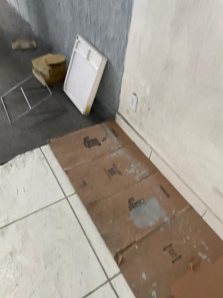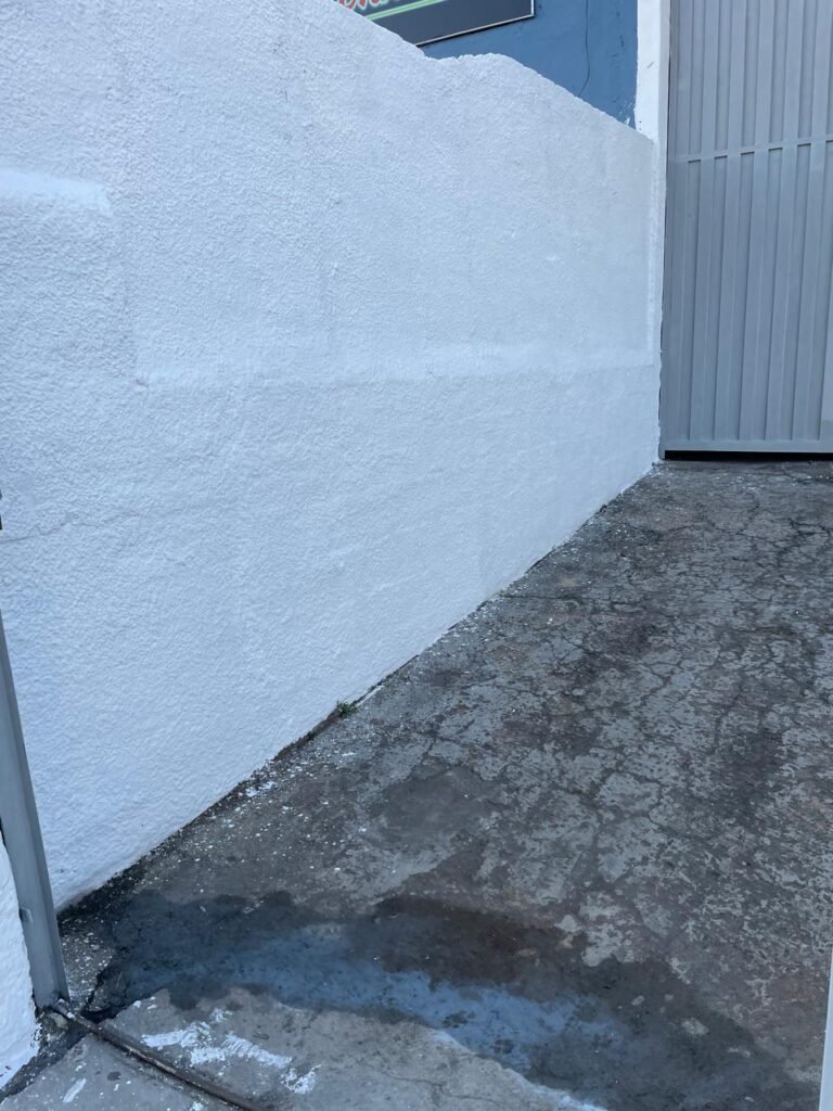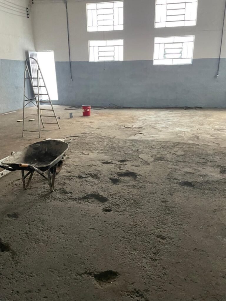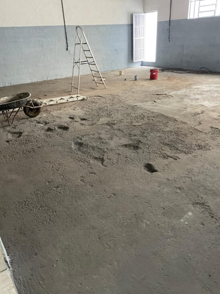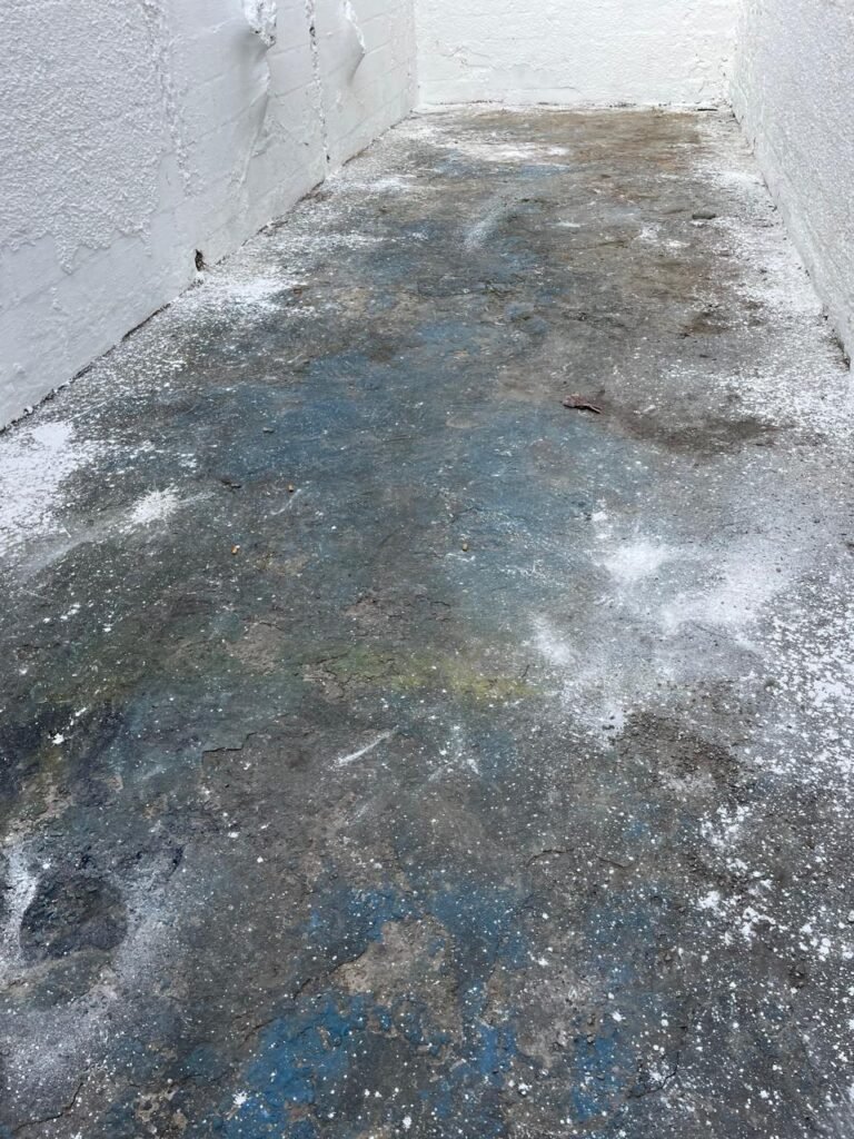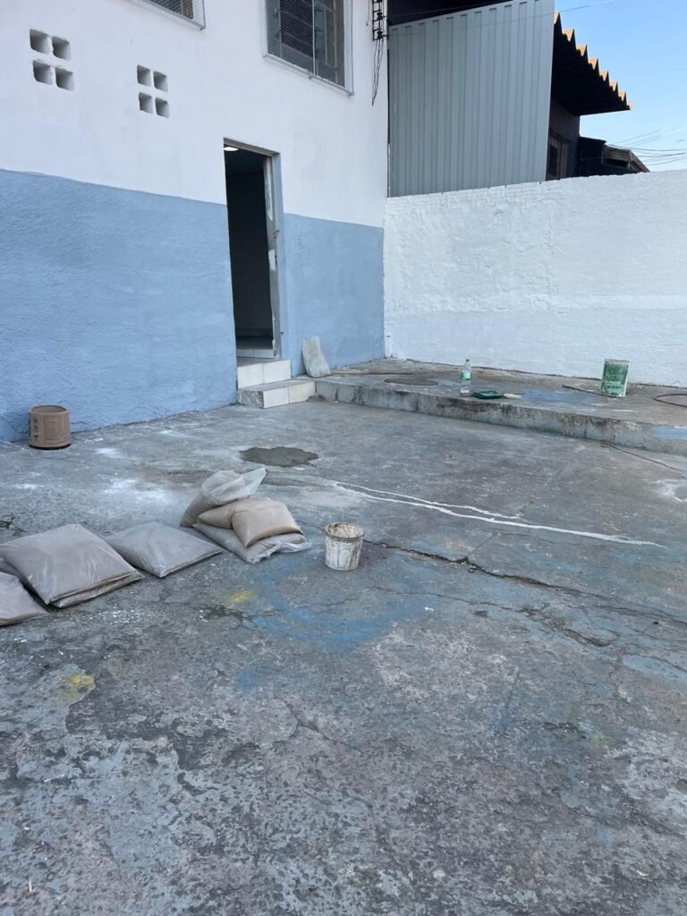 FUNDOS-: Piso de concreto sujo de tinta com desgaste natural, ralo sem tampa e entupido, paredes com pintura na cor branco neve nova e em ordem.