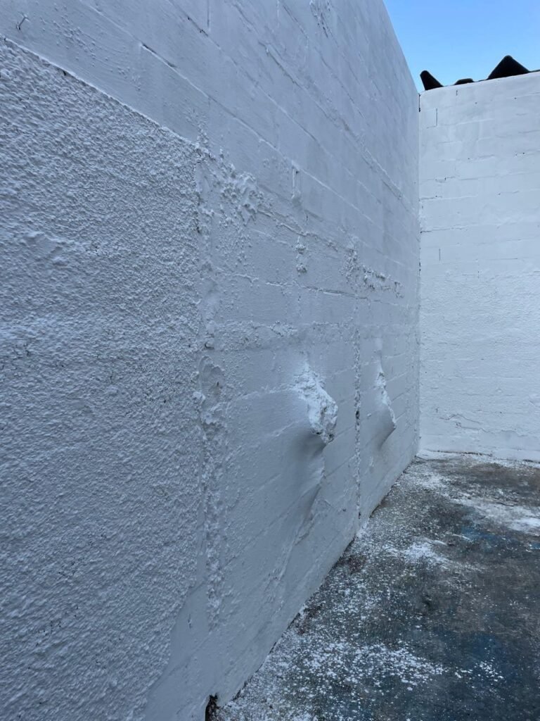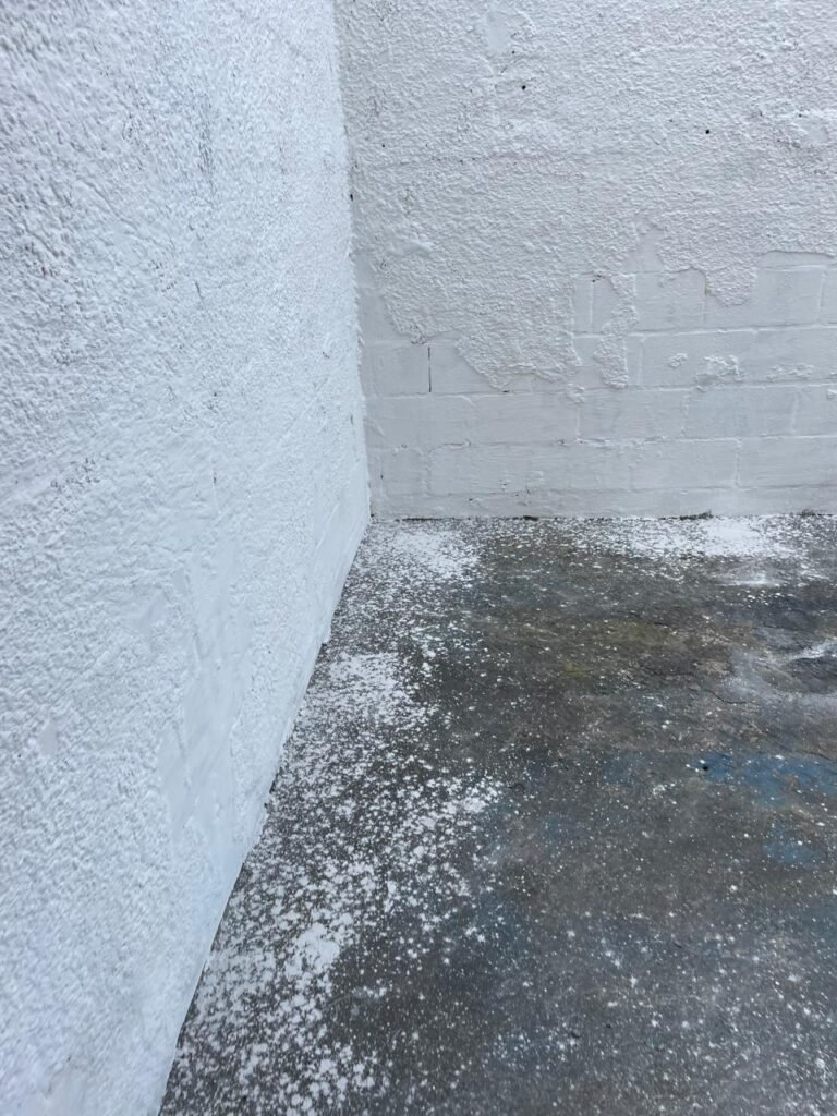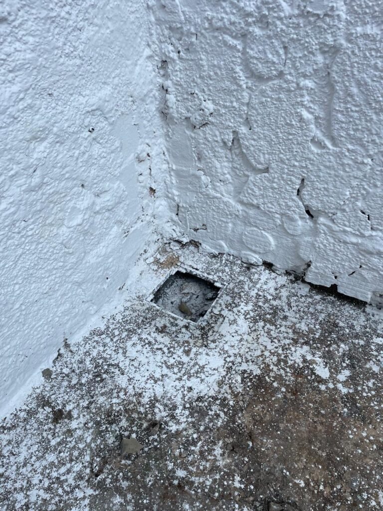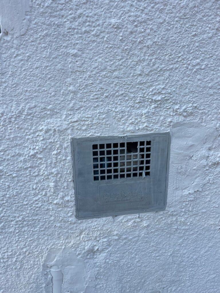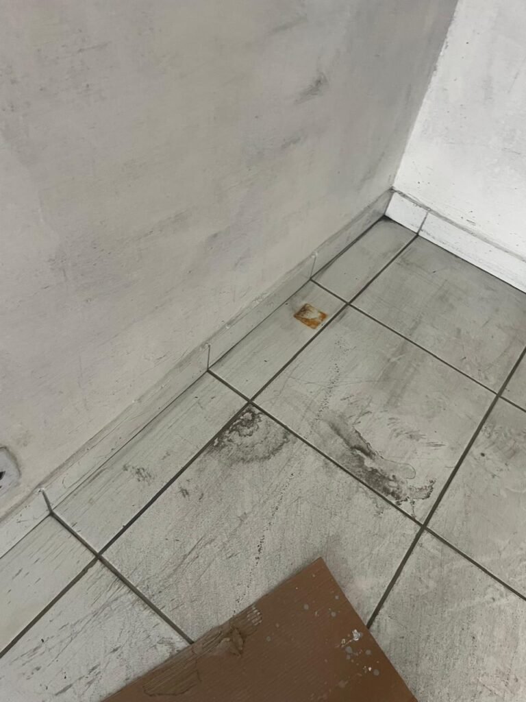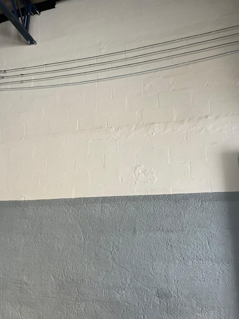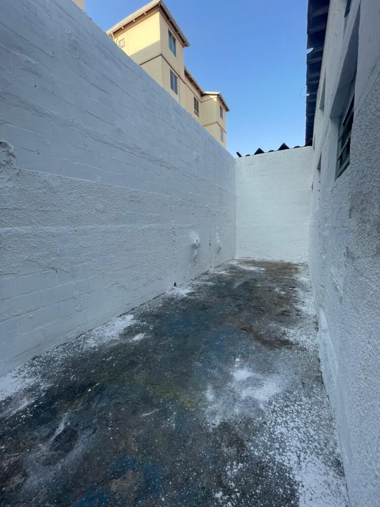 FUNDOS-: Piso de concreto sujo de tinta com desgaste natural, ralo sem tampa e entupido, paredes com pintura na cor branco neve nova e em ordem.
