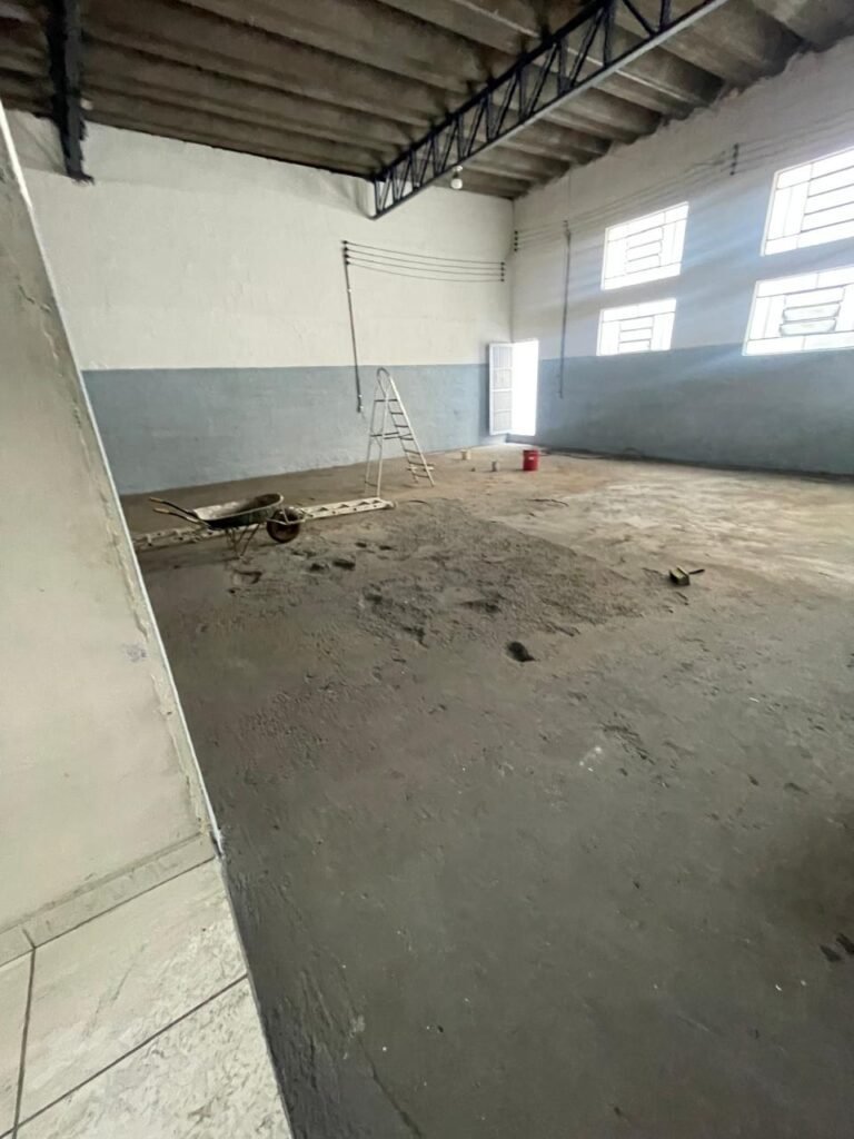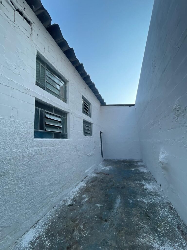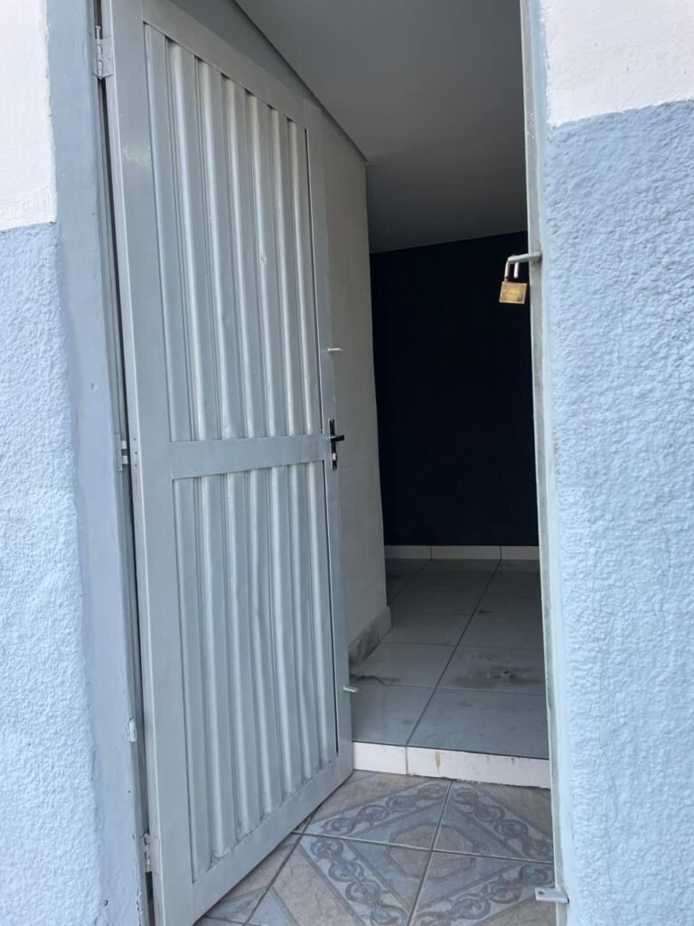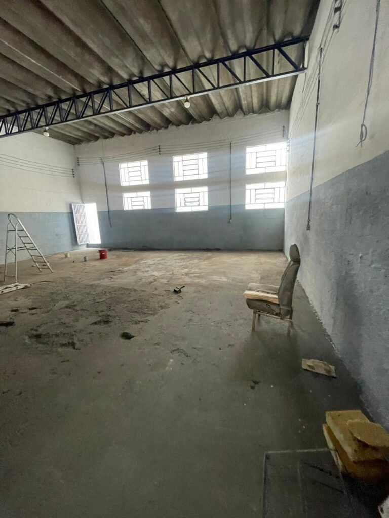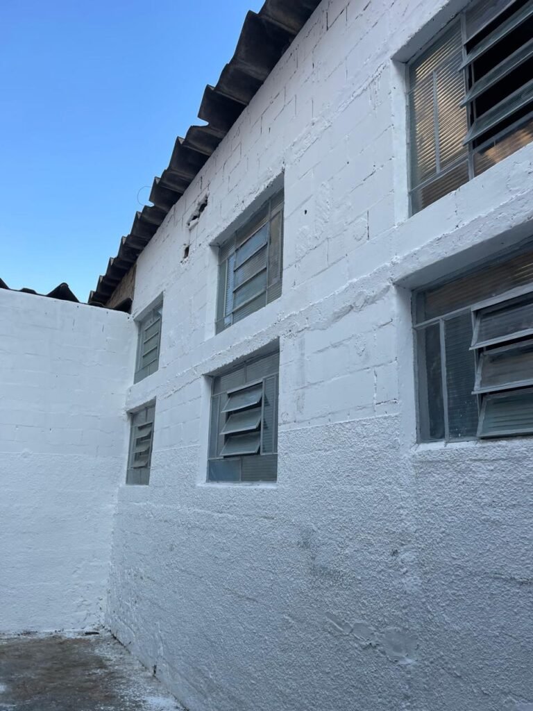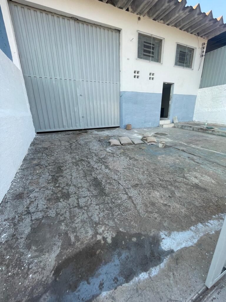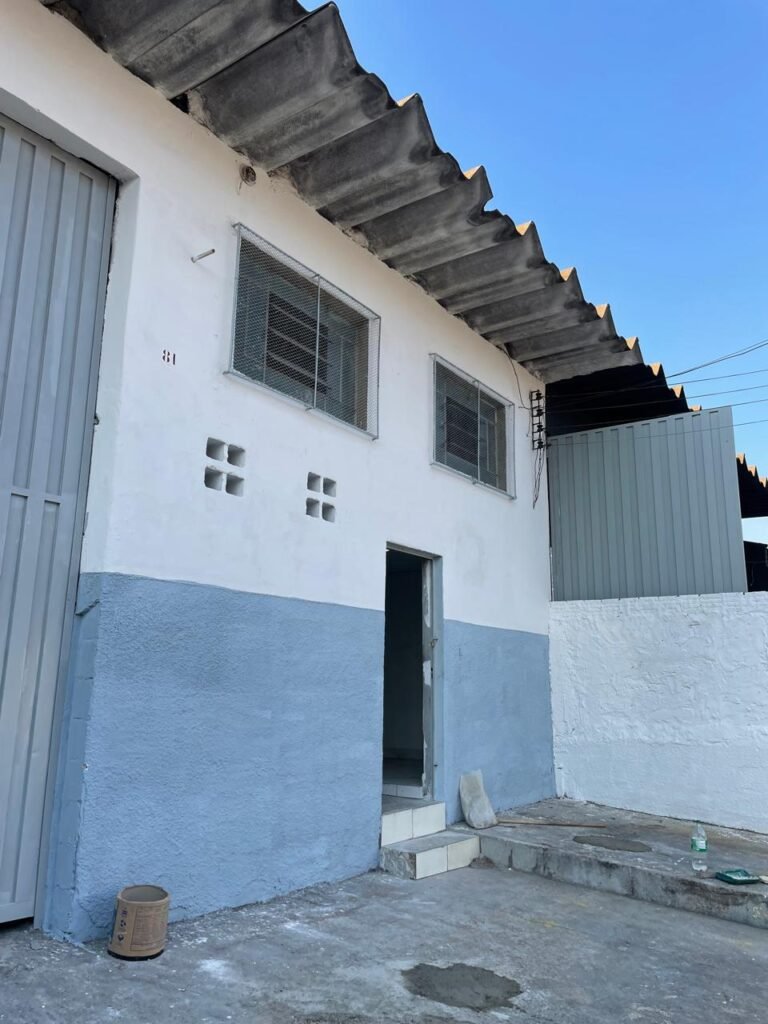 BARRACÃO-: Piso de concreto com fissuras e rachaduras pela extensão, paredes com pintura barrado na cor azul e restante na cor branco neve, ambas pinturas novas e em ordem, parede revestida de pisos decorados na cor verde, com buracos, sujos de tinta e 01 torneira de jardim, 10 tomadas por conduítes com fiação aparentes, telhado de telhas de fibrocimento, 03 estruturas de ferro com pintura na cor azul, 01 estrutura com 02 lâmpadas Led, 01 estrutura com 01 lâmpada Led, 01 estrutura com refletor 50 watts e 01 lâmpada Led e 01 estrutura com 01 bocal sem lâmpada e 01 lâmpada led, 02 vitrôs basculantes com 13 vidros canelados sujos e com respingos de tinta, 04 vitrôs basculantes com 11 vidros canelados sujos e com respingos de tinta, 02 vitro basculantes com 09 vidros canelados sujos, com respingos de tinta e 01 vidro trincado, 02 tomadas com fiação aparente, 01 suporte de alvenaria com caixa d’água, 01 portão de ferro com 03 ferrolhos em ordem e 01 cadeado, com pintura na cor cinza, com desgaste natural e suja de tinta, 01 porta social de aço com pintura na cor cinza e fechadura em ordem.