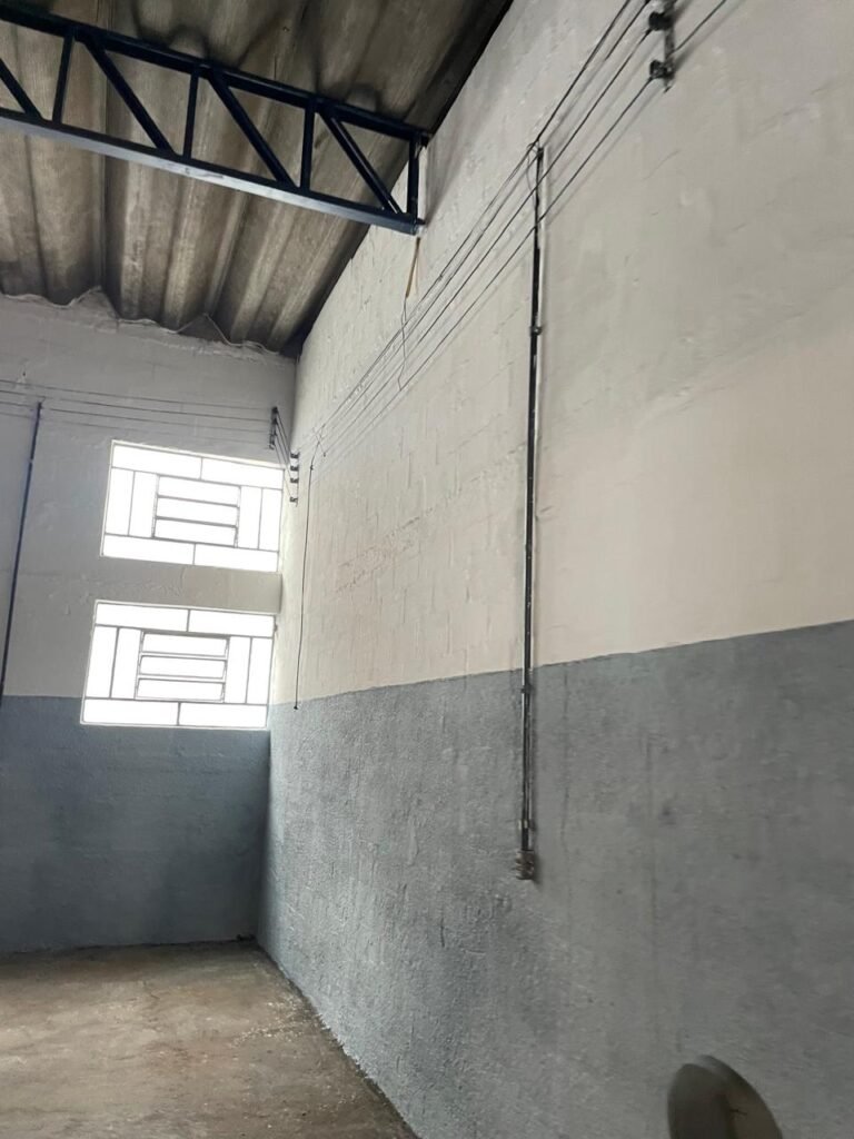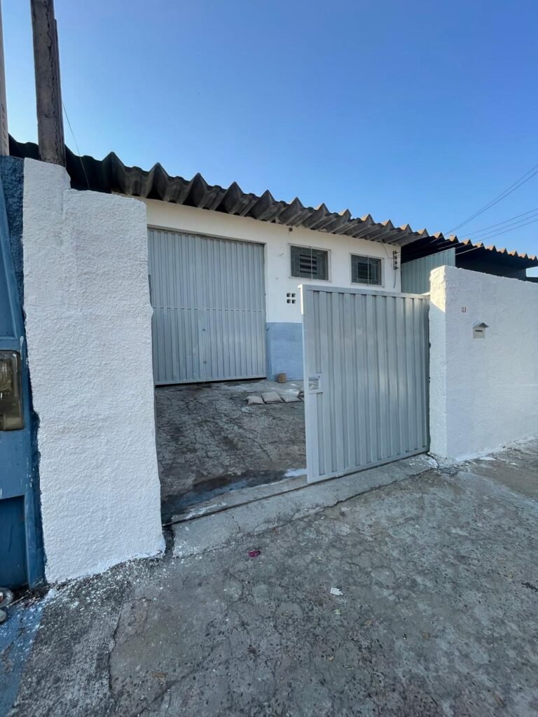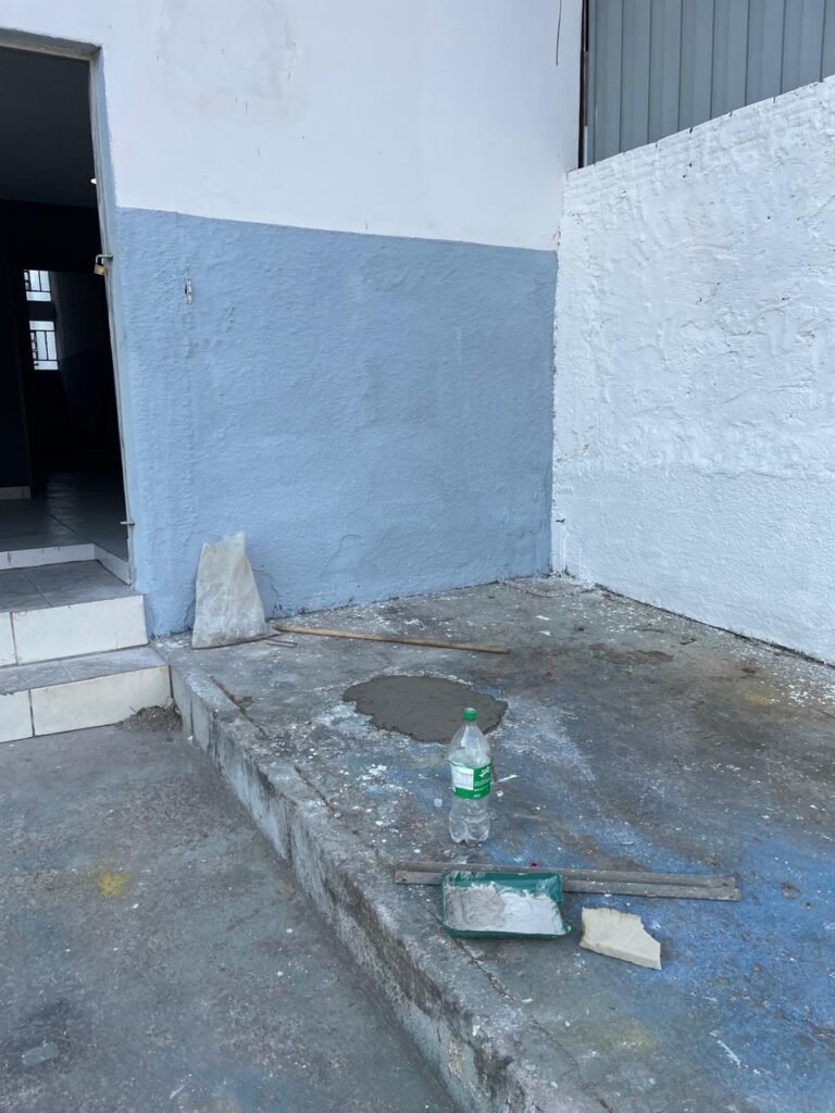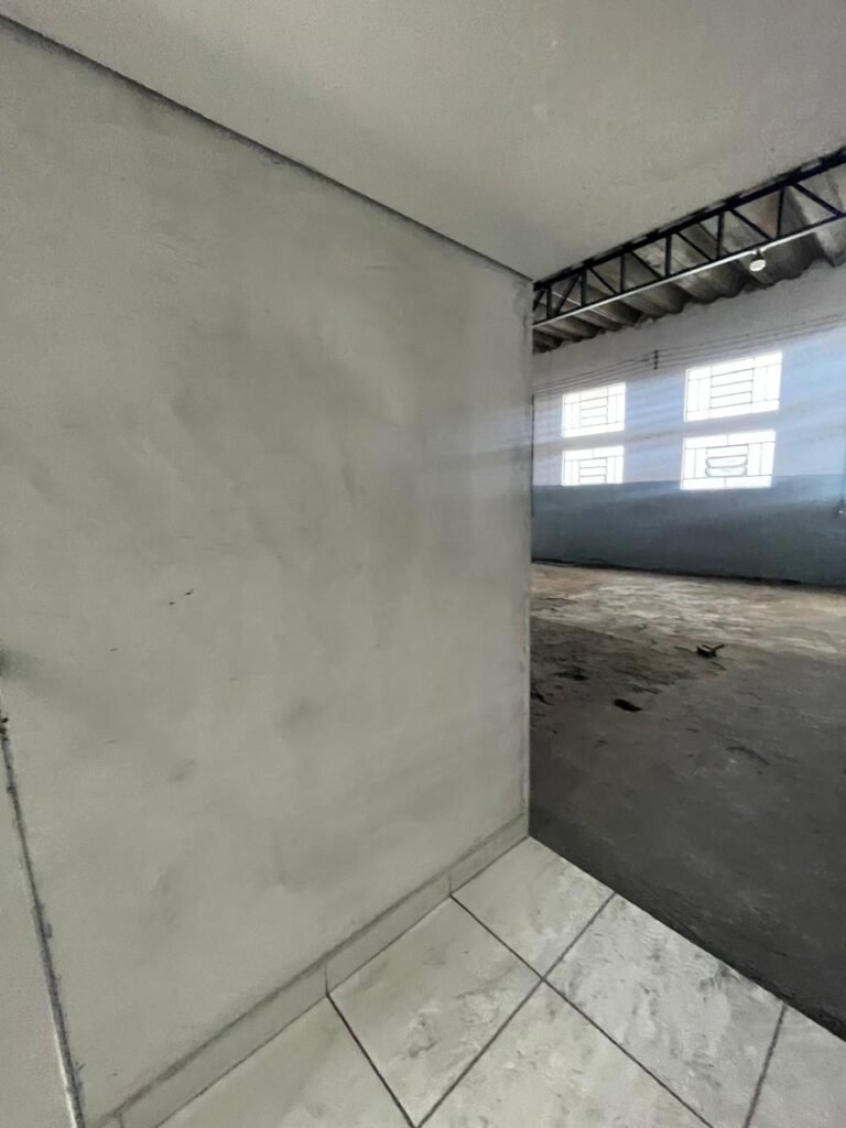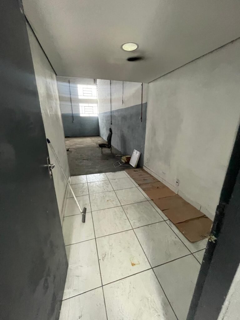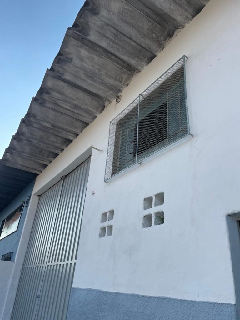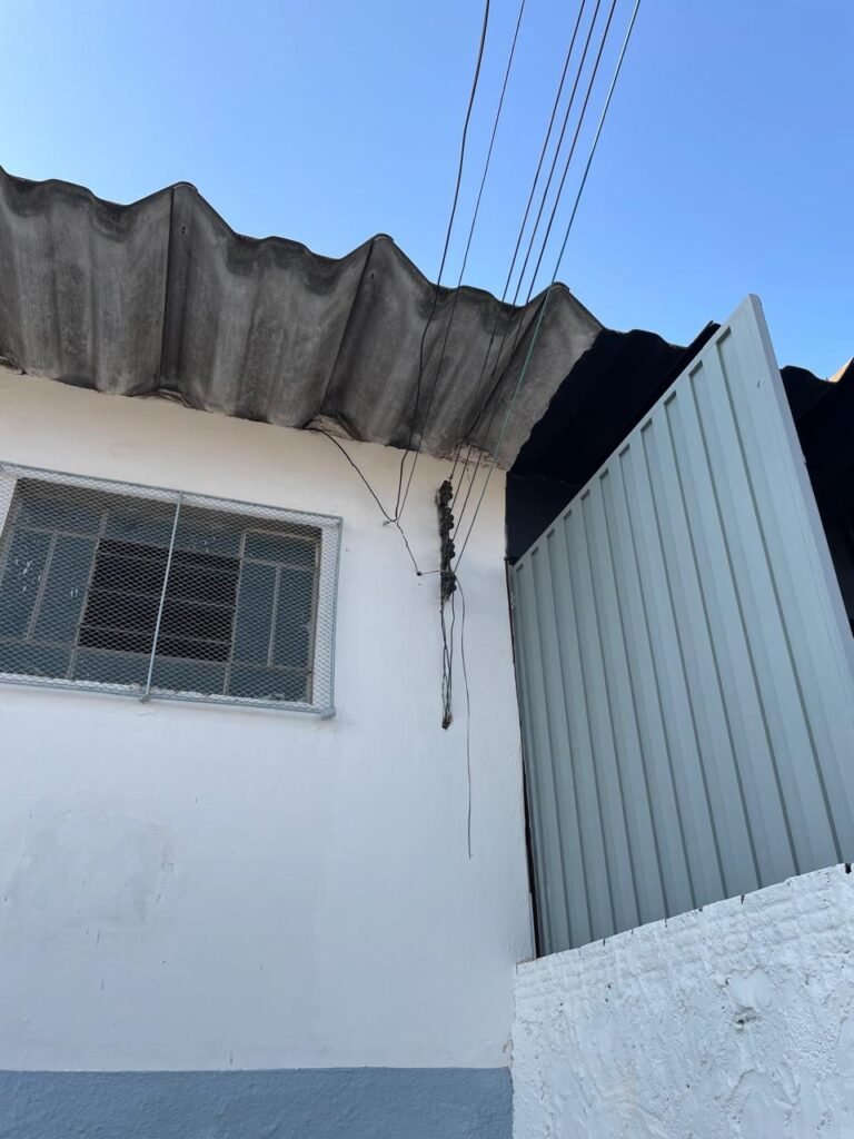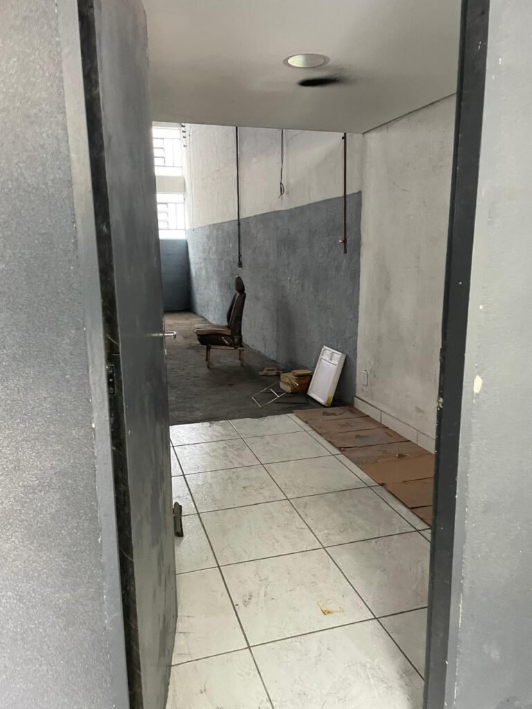 BARRACÃO-: Piso de concreto com fissuras e rachaduras pela extensão, paredes com pintura barrado na cor azul e restante na cor branco neve, ambas pinturas novas e em ordem, parede revestida de pisos decorados na cor verde, com buracos, sujos de tinta e 01 torneira de jardim, 10 tomadas por conduítes com fiação aparentes, telhado de telhas de fibrocimento, 03 estruturas de ferro com pintura na cor azul, 01 estrutura com 02 lâmpadas Led, 01 estrutura com 01 lâmpada Led, 01 estrutura com refletor 50 watts e 01 lâmpada Led e 01 estrutura com 01 bocal sem lâmpada e 01 lâmpada led, 02 vitrôs basculantes com 13 vidros canelados sujos e com respingos de tinta, 04 vitrôs basculantes com 11 vidros canelados sujos e com respingos de tinta, 02 vitro basculantes com 09 vidros canelados sujos, com respingos de tinta e 01 vidro trincado, 02 tomadas com fiação aparente, 01 suporte de alvenaria com caixa d’água, 01 portão de ferro com 03 ferrolhos em ordem e 01 cadeado, com pintura na cor cinza, com desgaste natural e suja de tinta, 01 porta social de aço com pintura na cor cinza e fechadura em ordem.