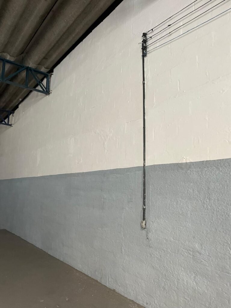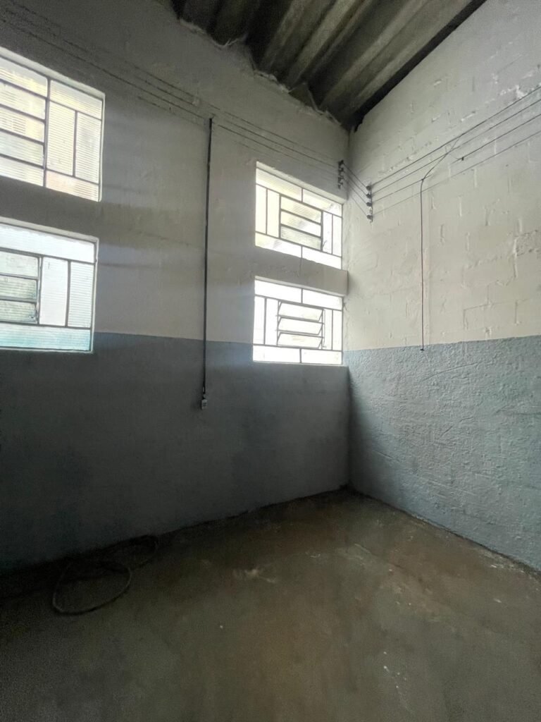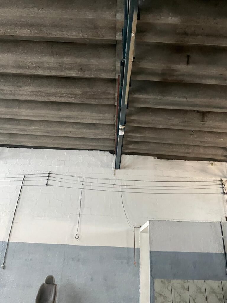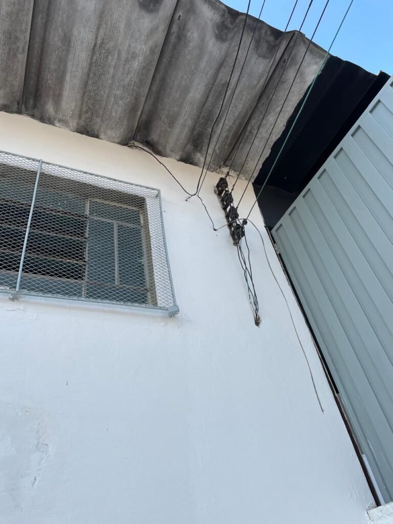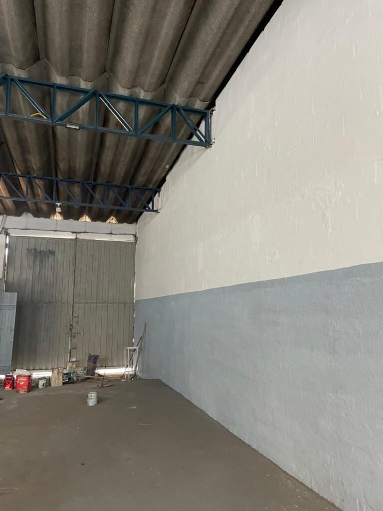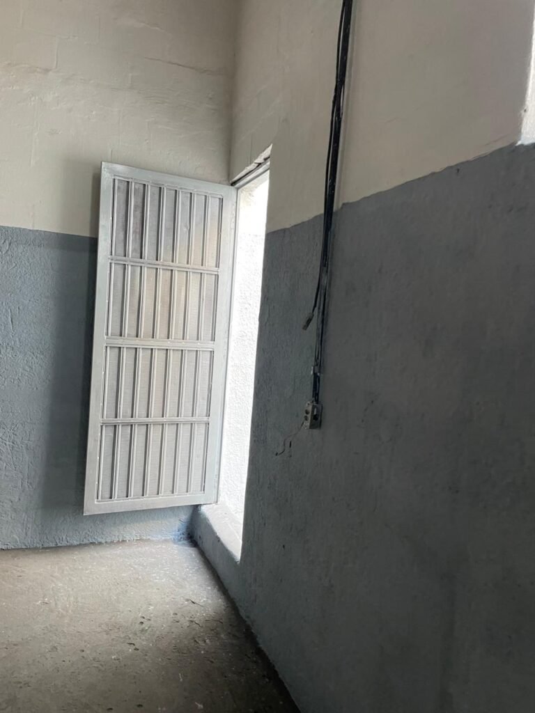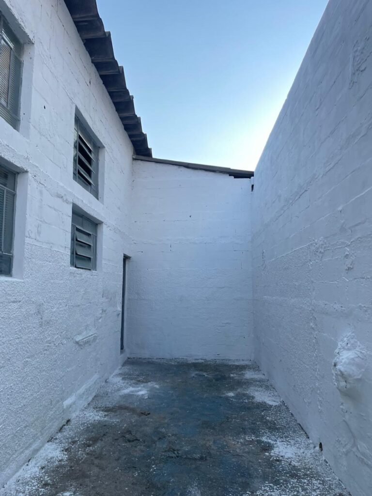 BARRACÃO-: Piso de concreto com fissuras e rachaduras pela extensão, paredes com pintura barrado na cor azul e restante na cor branco neve, ambas pinturas novas e em ordem, parede revestida de pisos decorados na cor verde, com buracos, sujos de tinta e 01 torneira de jardim, 10 tomadas por conduítes com fiação aparentes, telhado de telhas de fibrocimento, 03 estruturas de ferro com pintura na cor azul, 01 estrutura com 02 lâmpadas Led, 01 estrutura com 01 lâmpada Led, 01 estrutura com refletor 50 watts e 01 lâmpada Led e 01 estrutura com 01 bocal sem lâmpada e 01 lâmpada led, 02 vitrôs basculantes com 13 vidros canelados sujos e com respingos de tinta, 04 vitrôs basculantes com 11 vidros canelados sujos e com respingos de tinta, 02 vitro basculantes com 09 vidros canelados sujos, com respingos de tinta e 01 vidro trincado, 02 tomadas com fiação aparente, 01 suporte de alvenaria com caixa d’água, 01 portão de ferro com 03 ferrolhos em ordem e 01 cadeado, com pintura na cor cinza, com desgaste natural e suja de tinta, 01 porta social de aço com pintura na cor cinza e fechadura em ordem.