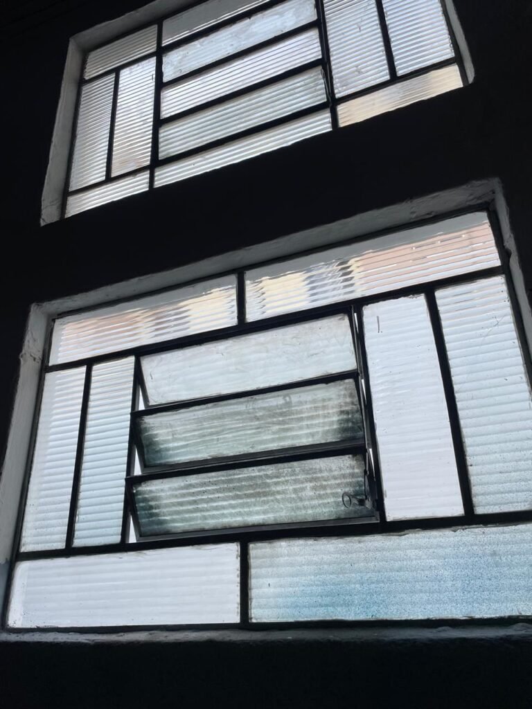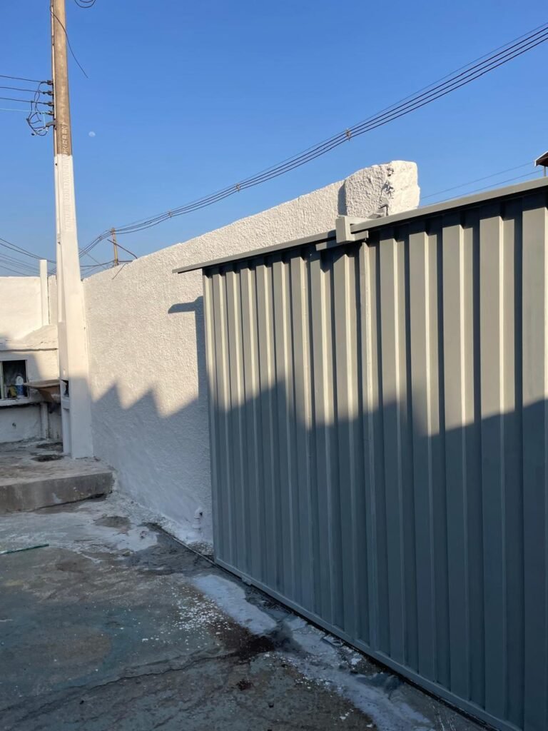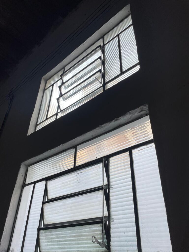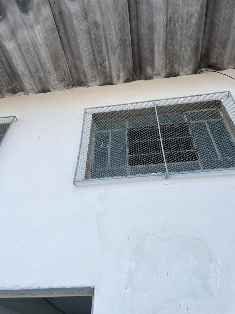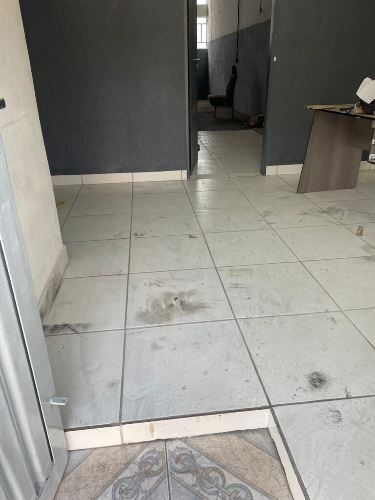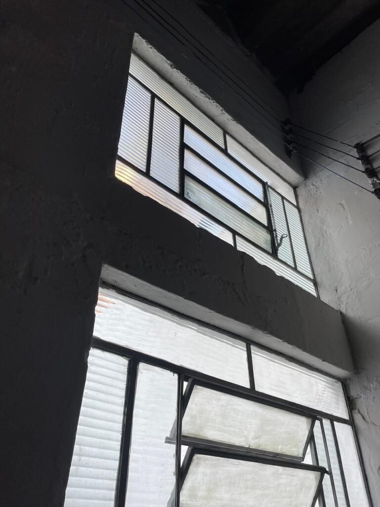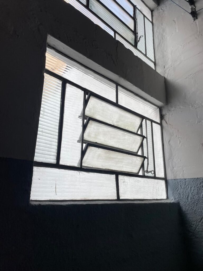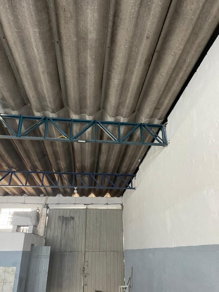 BARRACÃO-: Piso de concreto com fissuras e rachaduras pela extensão, paredes com pintura barrado na cor azul e restante na cor branco neve, ambas pinturas novas e em ordem, parede revestida de pisos decorados na cor verde, com buracos, sujos de tinta e 01 torneira de jardim, 10 tomadas por conduítes com fiação aparentes, telhado de telhas de fibrocimento, 03 estruturas de ferro com pintura na cor azul, 01 estrutura com 02 lâmpadas Led, 01 estrutura com 01 lâmpada Led, 01 estrutura com refletor 50 watts e 01 lâmpada Led e 01 estrutura com 01 bocal sem lâmpada e 01 lâmpada led, 02 vitrôs basculantes com 13 vidros canelados sujos e com respingos de tinta, 04 vitrôs basculantes com 11 vidros canelados sujos e com respingos de tinta, 02 vitro basculantes com 09 vidros canelados sujos, com respingos de tinta e 01 vidro trincado, 02 tomadas com fiação aparente, 01 suporte de alvenaria com caixa d’água, 01 portão de ferro com 03 ferrolhos em ordem e 01 cadeado, com pintura na cor cinza, com desgaste natural e suja de tinta, 01 porta social de aço com pintura na cor cinza e fechadura em ordem.