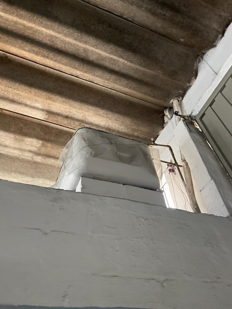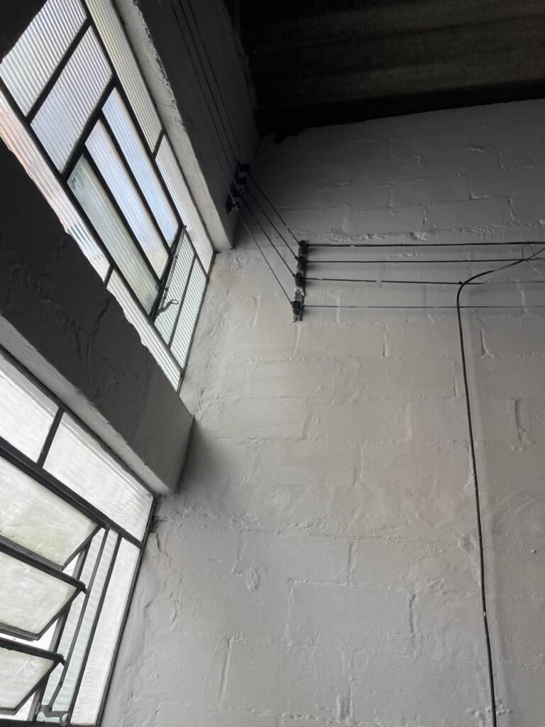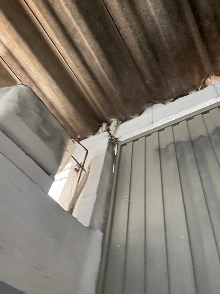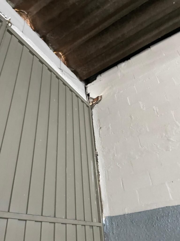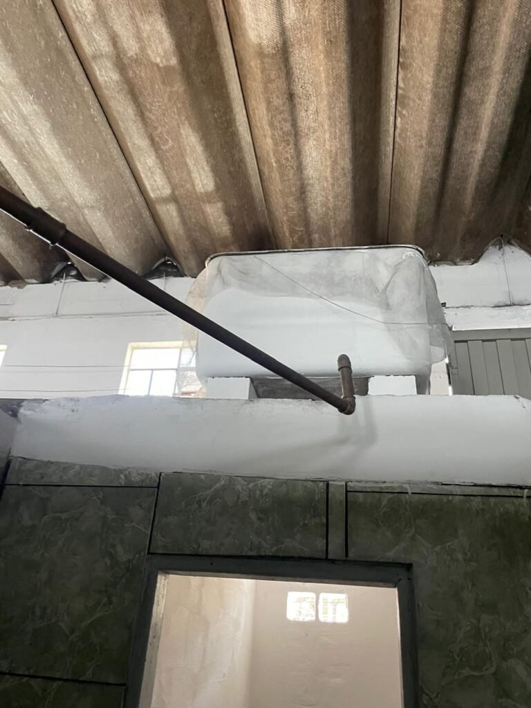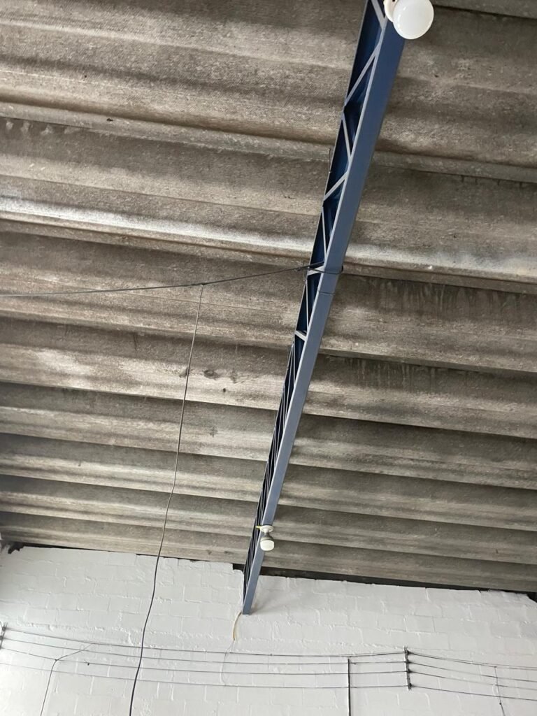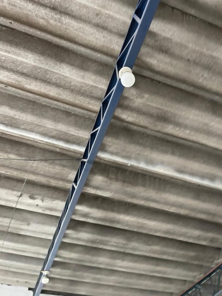 BARRACÃO-: Piso de concreto com fissuras e rachaduras pela extensão, paredes com pintura barrado na cor azul e restante na cor branco neve, ambas pinturas novas e em ordem, parede revestida de pisos decorados na cor verde, com buracos, sujos de tinta e 01 torneira de jardim, 10 tomadas por conduítes com fiação aparentes, telhado de telhas de fibrocimento, 03 estruturas de ferro com pintura na cor azul, 01 estrutura com 02 lâmpadas Led, 01 estrutura com 01 lâmpada Led, 01 estrutura com refletor 50 watts e 01 lâmpada Led e 01 estrutura com 01 bocal sem lâmpada e 01 lâmpada led, 02 vitrôs basculantes com 13 vidros canelados sujos e com respingos de tinta, 04 vitrôs basculantes com 11 vidros canelados sujos e com respingos de tinta, 02 vitro basculantes com 09 vidros canelados sujos, com respingos de tinta e 01 vidro trincado, 02 tomadas com fiação aparente, 01 suporte de alvenaria com caixa d’água, 01 portão de ferro com 03 ferrolhos em ordem e 01 cadeado, com pintura na cor cinza, com desgaste natural e suja de tinta, 01 porta social de aço com pintura na cor cinza e fechadura em ordem.