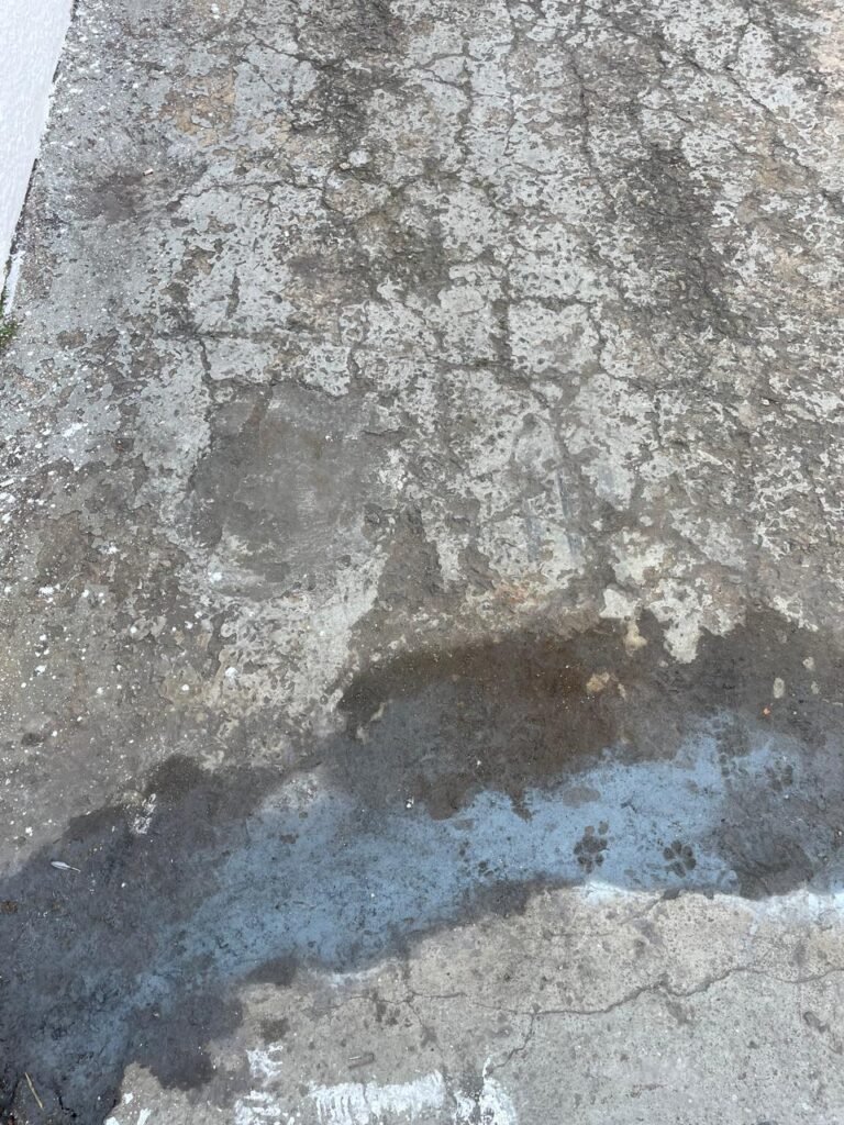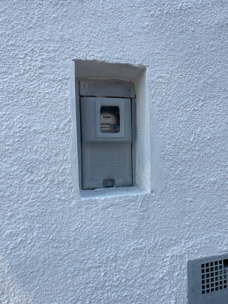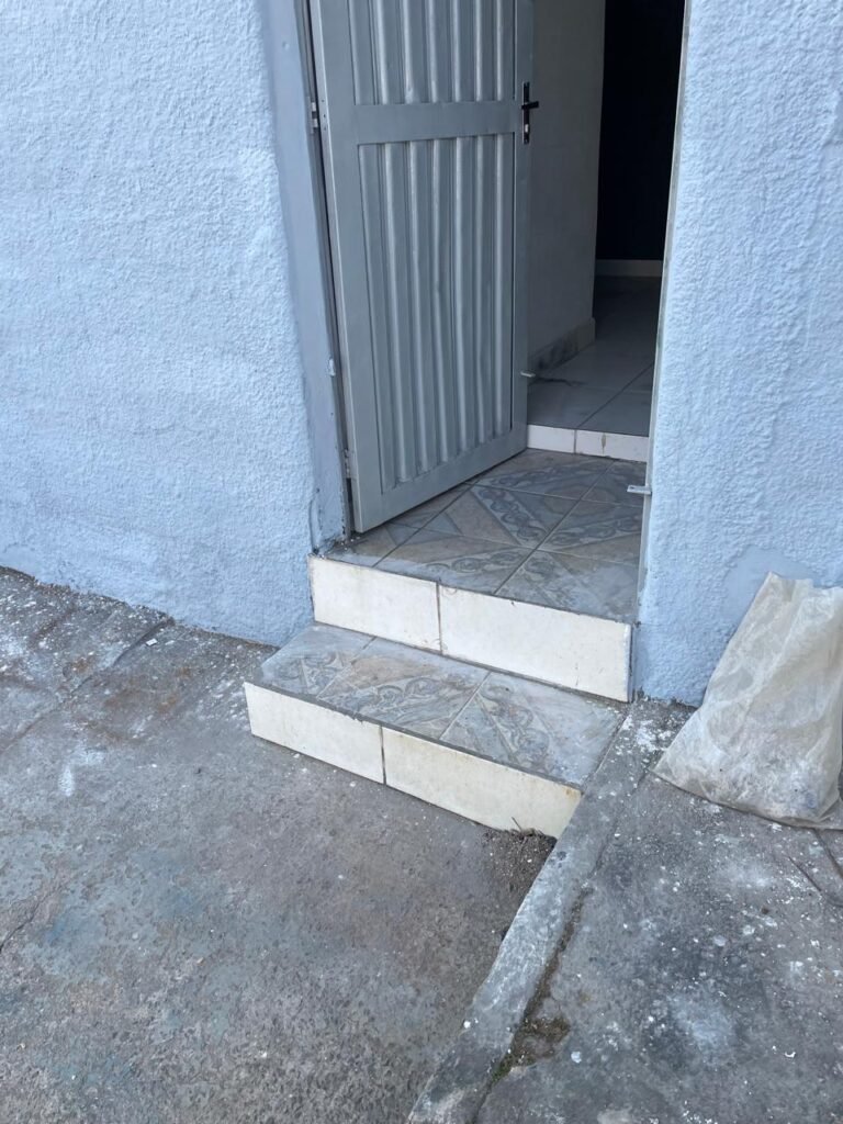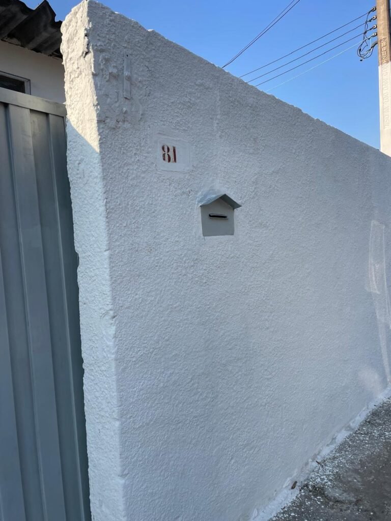 FACHADA-: Calçada piso de concreto desempenado, com rachaduras pela extensão e manchas de tinta, muro com pintura na cor branco neve nova e em ordem, caixa de correspondência de ferro com pintura na cor cinza, digito “8-1” marcado com tinta, 01 relógio medidor de energia com tampa de proteção em ordem, 01 hidrômetro Sanasa com lacre em ordem.