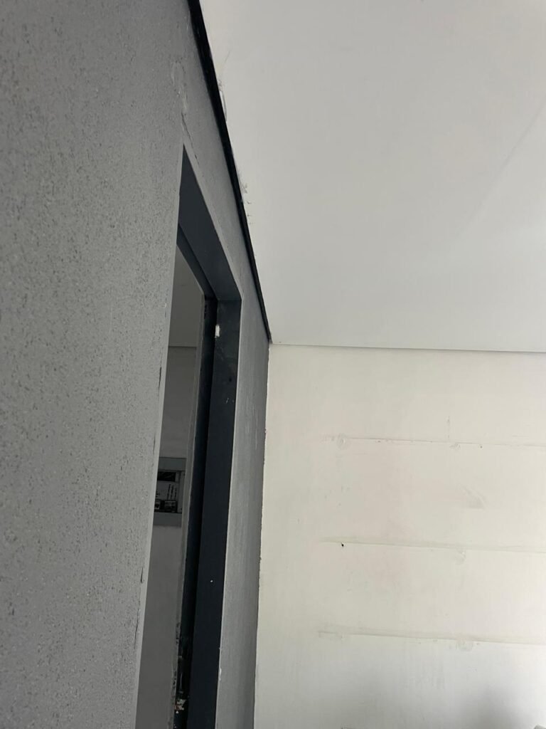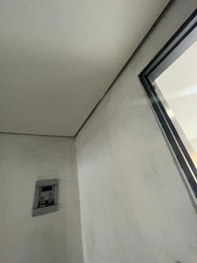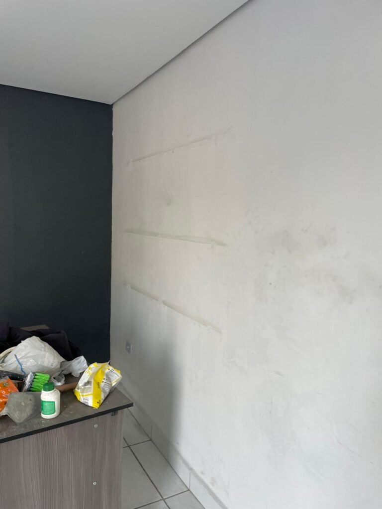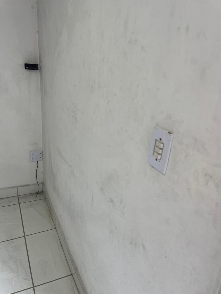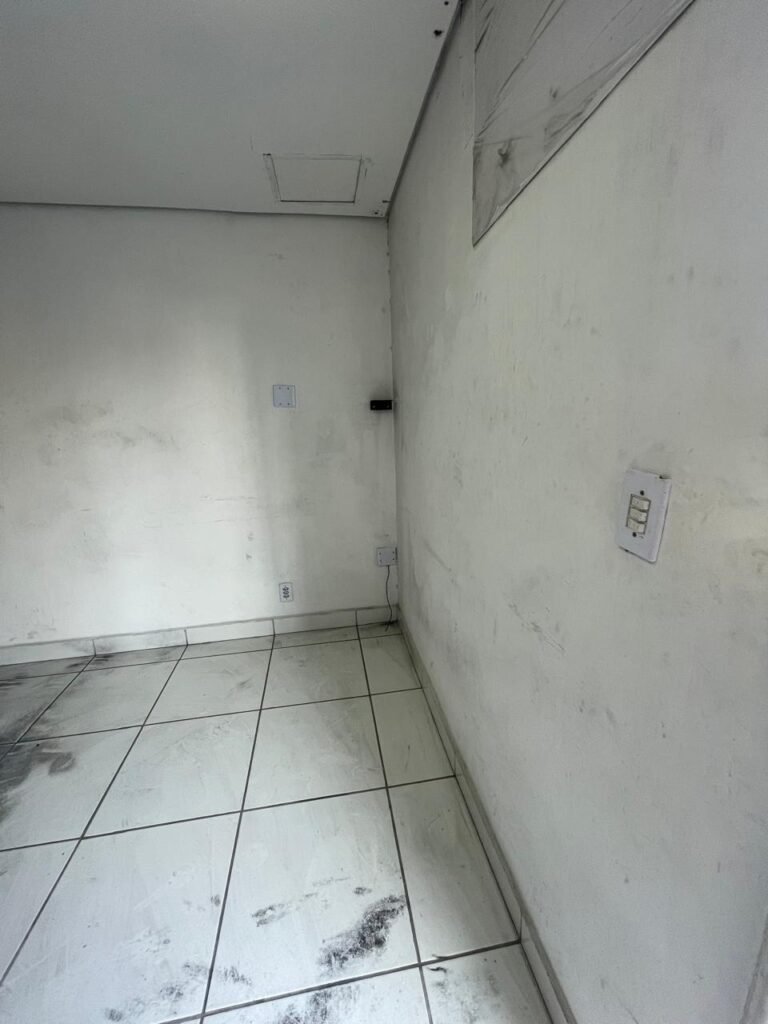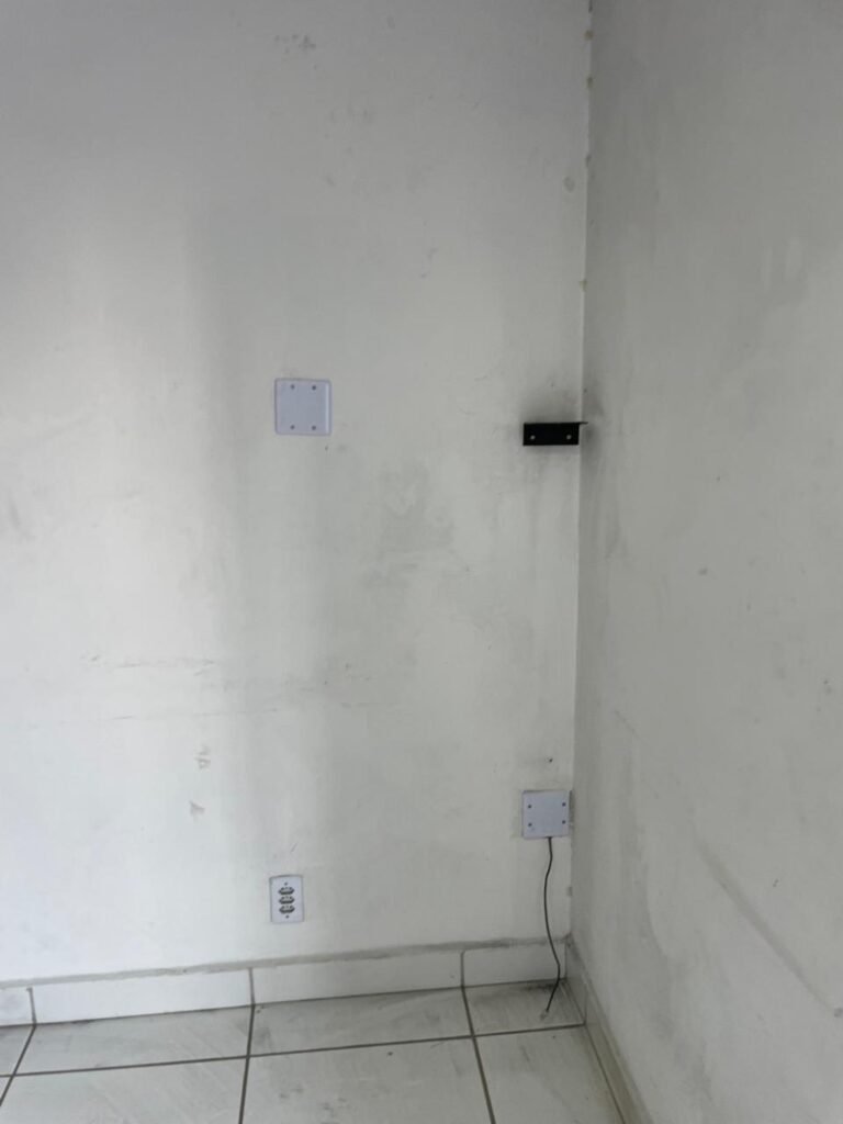 SALA 01-: 01 porta social de aço com pintura na cor cinza, com fechadura e cadeado marca Pado, maçaneta de inox desgastada, fechadura Yale com chave em ordem, rodapés e pisos frio cerâmico com parte de desenhos e parte cor branco, com desgaste natural, manchas pela extensão, 02 paredes com pintura na cor cinza escuro em ordem, restante de paredes com pintura na cor branco neve nova, com desgaste natural e manchas de sujeira, 01 quadro branco na parede, teto de dry-wall com acabamento de gesso e pintura na cor branco neve, com porta para alçapão, desgaste natural e buracos pela extensão, 02 luminárias plafon redondas embutidas e com led em ordem, 03 interruptores, 02 espelhos cegos, 06 tomadas, 01 suporte de ferro parafusado na parede cor preto, 01 porta de madeira com pintura na cor cinza saindo lascas e com maçaneta de inox sem chaves.