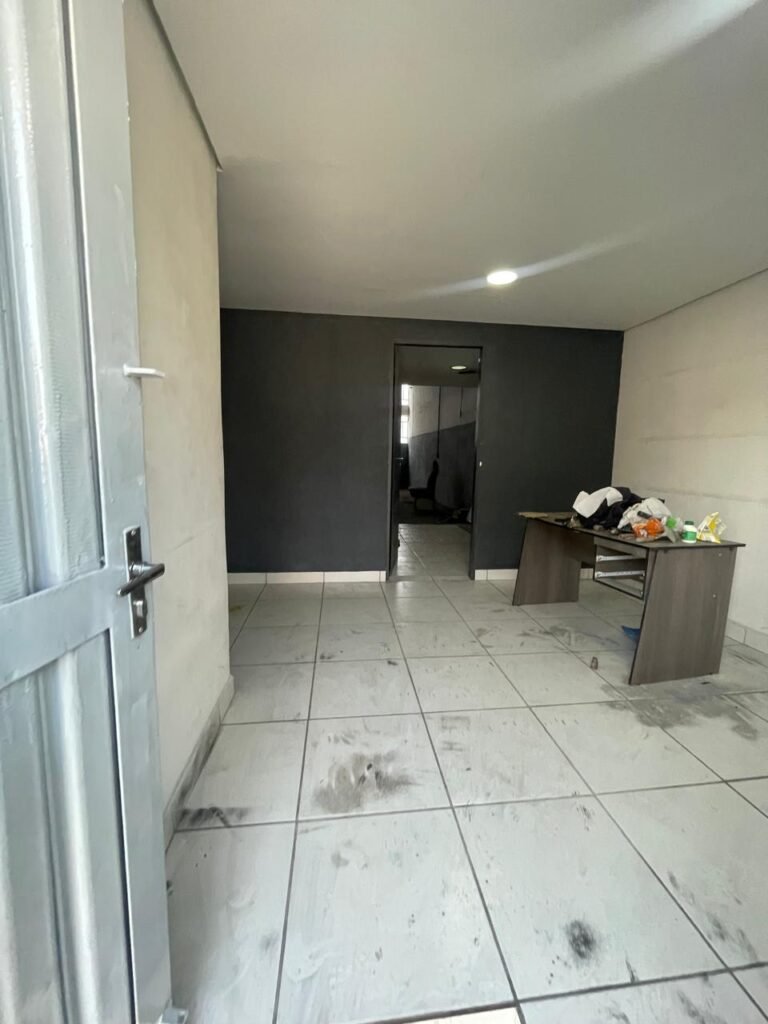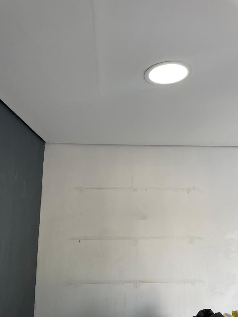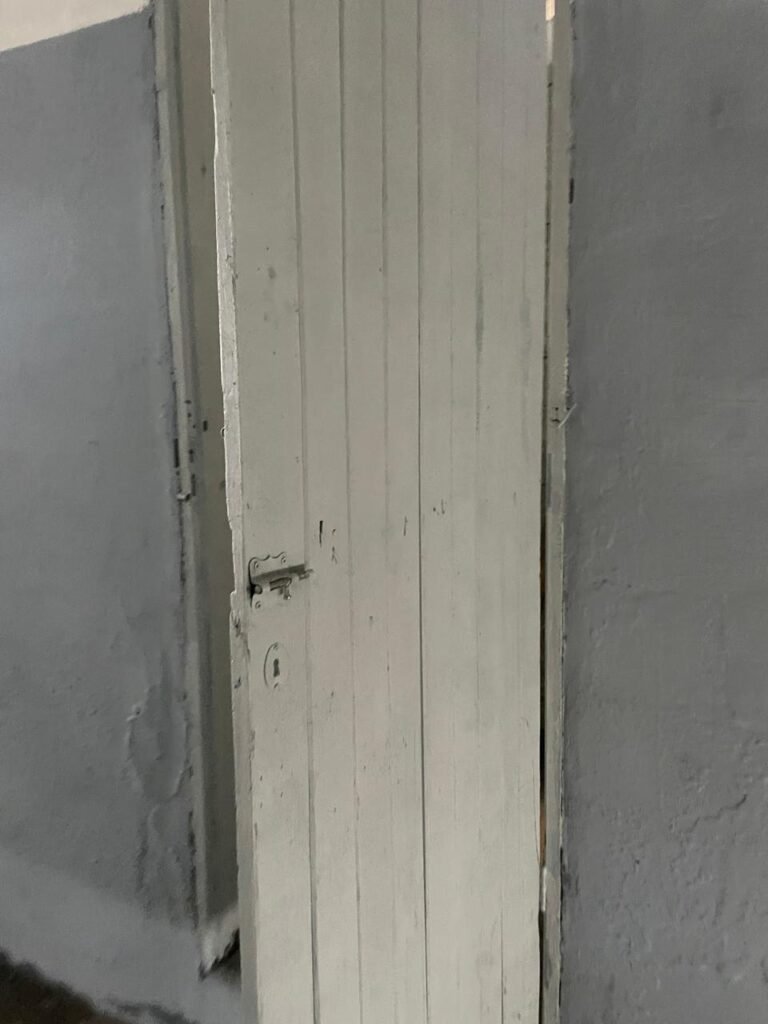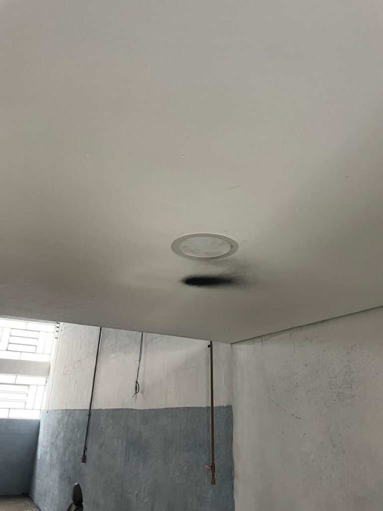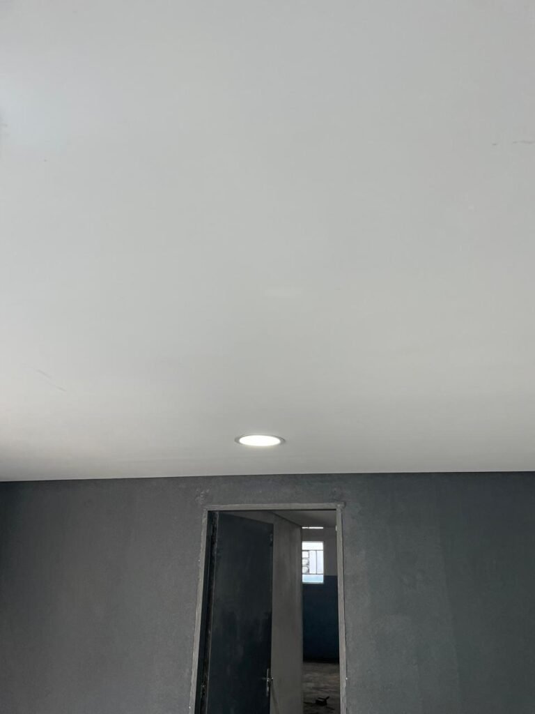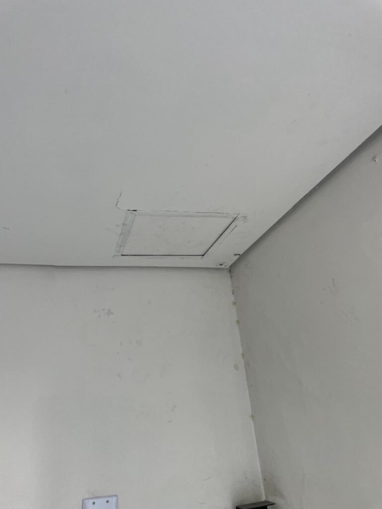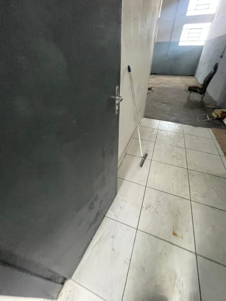SALA 01-: 01 porta social de aço com pintura na cor cinza, com fechadura e cadeado marca Pado, maçaneta de inox desgastada, fechadura Yale com chave em ordem, rodapés e pisos frio cerâmico com parte de desenhos e parte cor branco, com desgaste natural, manchas pela extensão, 02 paredes com pintura na cor cinza escuro em ordem, restante de paredes com pintura na cor branco neve nova, com desgaste natural e manchas de sujeira, 01 quadro branco na parede, teto de dry-wall com acabamento de gesso e pintura na cor branco neve, com porta para alçapão, desgaste natural e buracos pela extensão, 02 luminárias plafon redondas embutidas e com led em ordem, 03 interruptores, 02 espelhos cegos, 06 tomadas, 01 suporte de ferro parafusado na parede cor preto, 01 porta de madeira com pintura na cor cinza saindo lascas e com maçaneta de inox sem chaves.