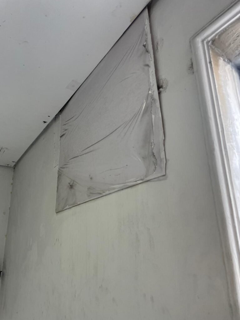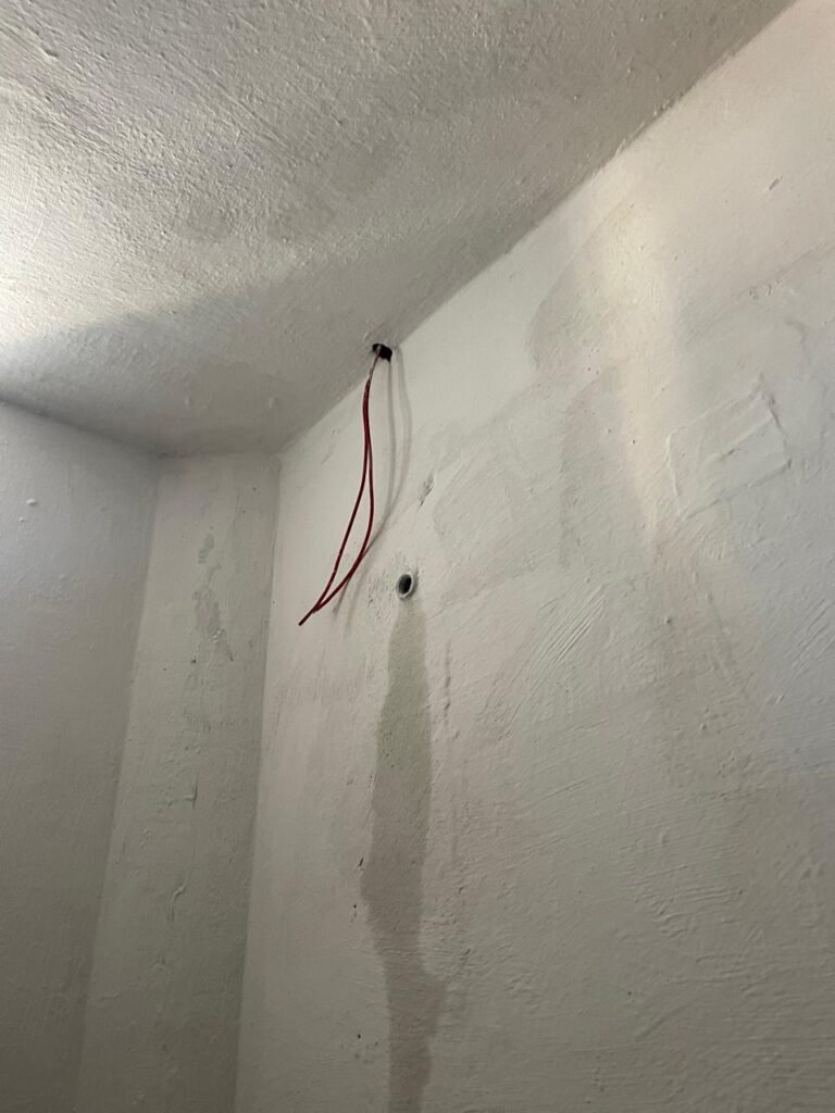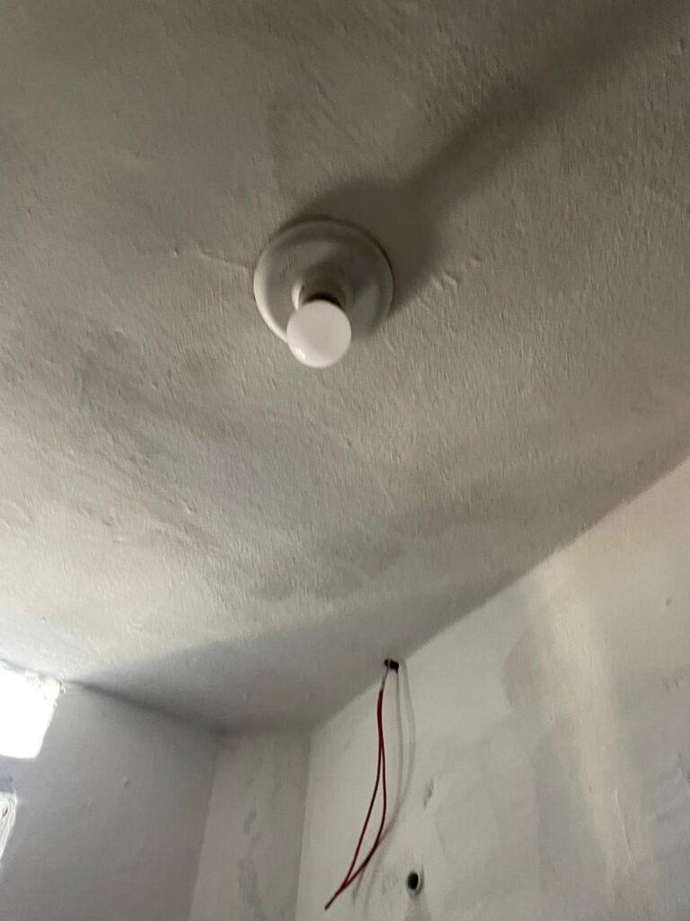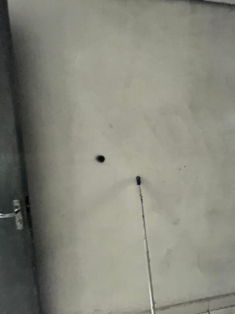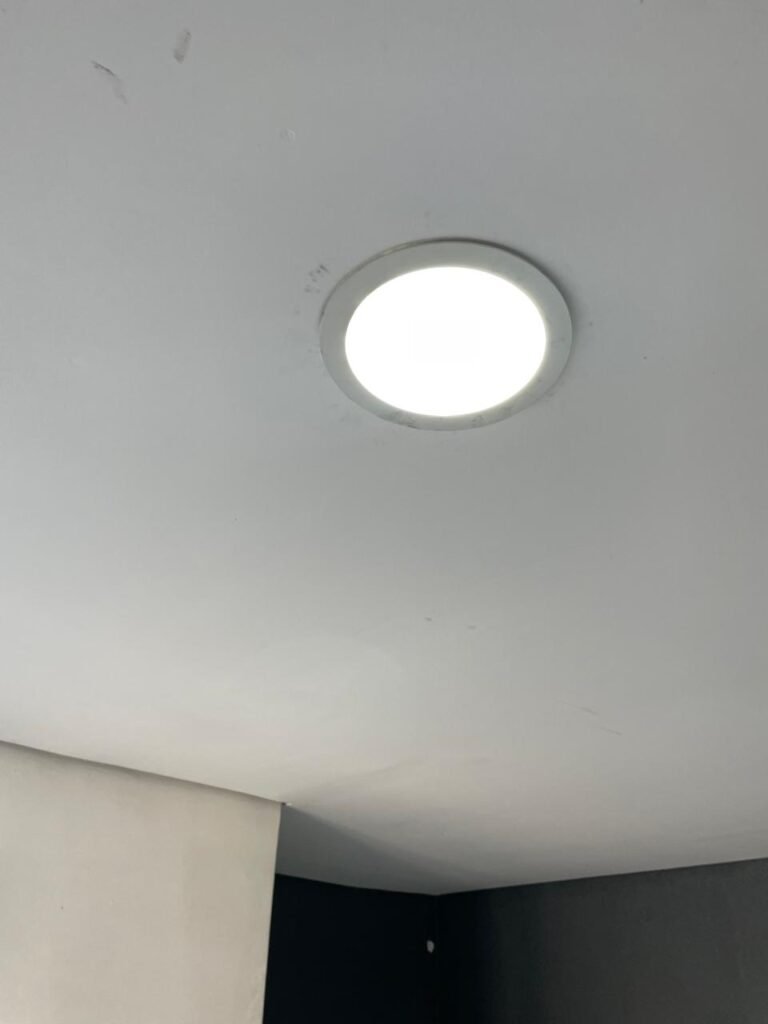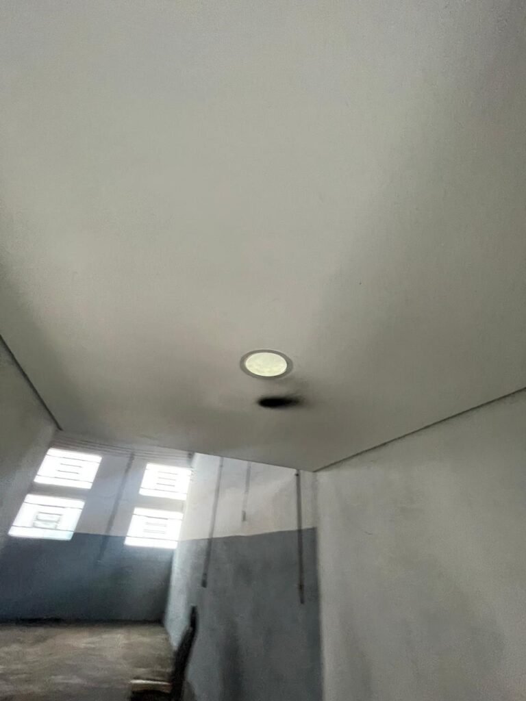 SALA 01-: 01 porta social de aço com pintura na cor cinza, com fechadura e cadeado marca Pado, maçaneta de inox desgastada, fechadura Yale com chave em ordem, rodapés e pisos frio cerâmico com parte de desenhos e parte cor branco, com desgaste natural, manchas pela extensão, 02 paredes com pintura na cor cinza escuro em ordem, restante de paredes com pintura na cor branco neve nova, com desgaste natural e manchas de sujeira, 01 quadro branco na parede, teto de dry-wall com acabamento de gesso e pintura na cor branco neve, com porta para alçapão, desgaste natural e buracos pela extensão, 02 luminárias plafon redondas embutidas e com led em ordem, 03 interruptores, 02 espelhos cegos, 06 tomadas, 01 suporte de ferro parafusado na parede cor preto, 01 porta de madeira com pintura na cor cinza saindo lascas e com maçaneta de inox sem chaves.