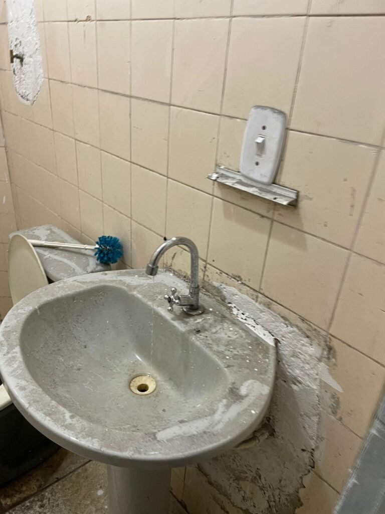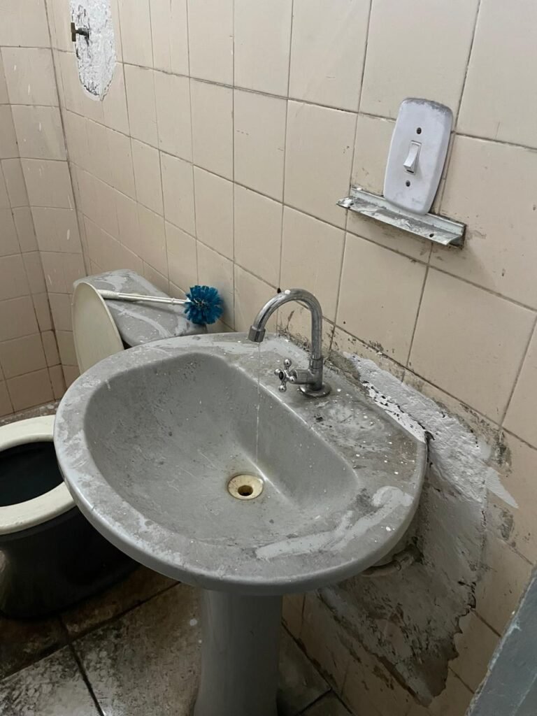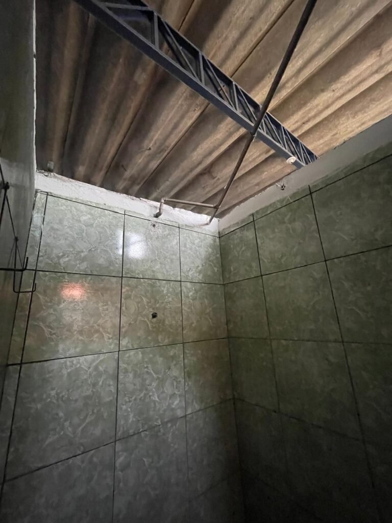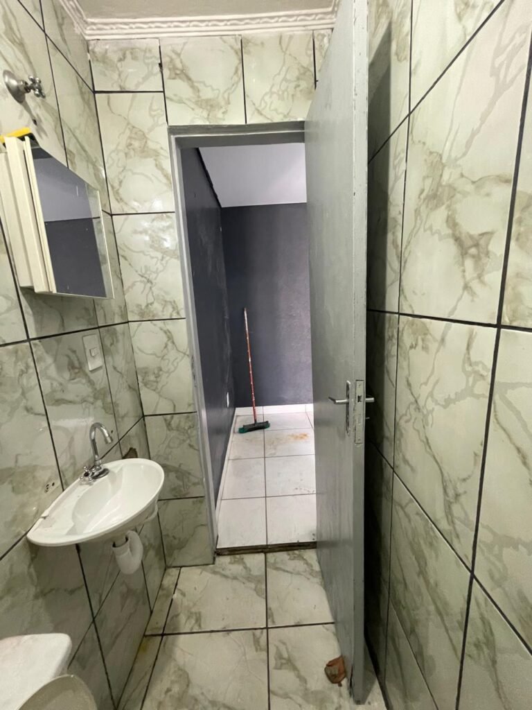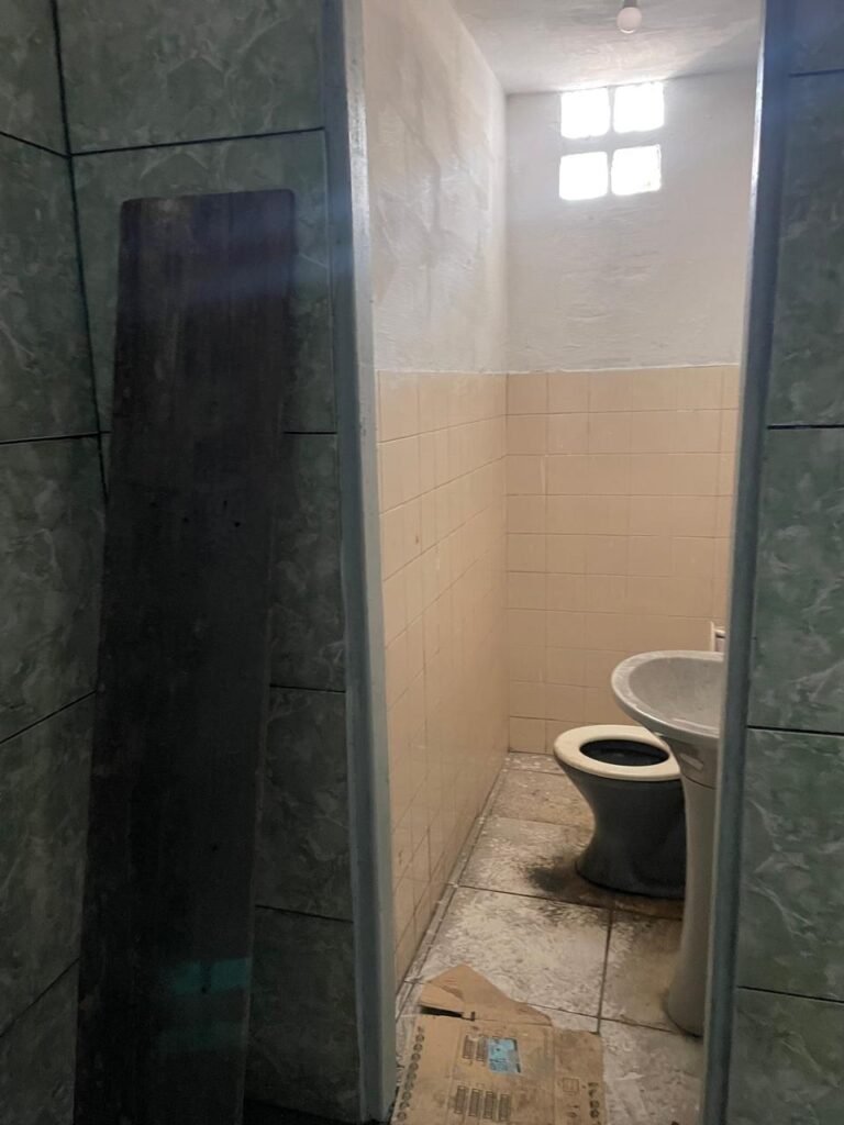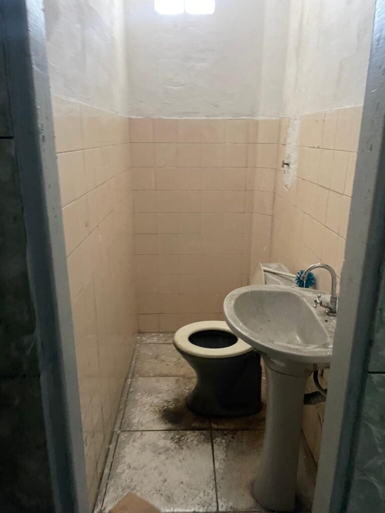 WC BARRACÃO-: 01 porta de madeira com fechadura ferrolho, com pintura na cor azul, parte das paredes revestidas de piso frio cerâmico na cor verde com decoração, com desgaste natural e buracos de instalações, cano pvc aparente, 02 suportes gancho de ferro, piso em ardósia com sujeira, batente de madeira com pintura na cor azul, parede barrada revestida com pisos quadriculados de cerâmica na cor rose, sujos de tinta e com desgaste natural, piso cerâmico cor branco com desgaste natural e com manchas de tinta, restante parede e teto com pintura na cor branco neve, janela de alvenaria em formato de 04 cubos, 01 luminária com 01 lâmpada Led em ordem, pia com coluna de cerâmica cor cinza com desgaste natural, manchas de tinta e sujeira, 01 torneira de inox com manchas de tinta, 01 suporte de papel e higiênico de cerâmica na cor cinza, canopla de chuveiro, 01 vaso sanitário com caixa acoplada, tampa e descarga desgastados na cor cinza e em ordem, 01 fiação na cor vermelha aparente.