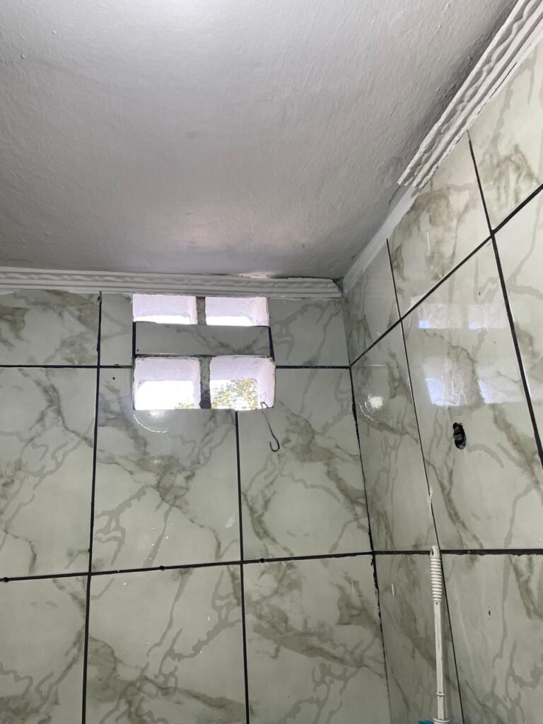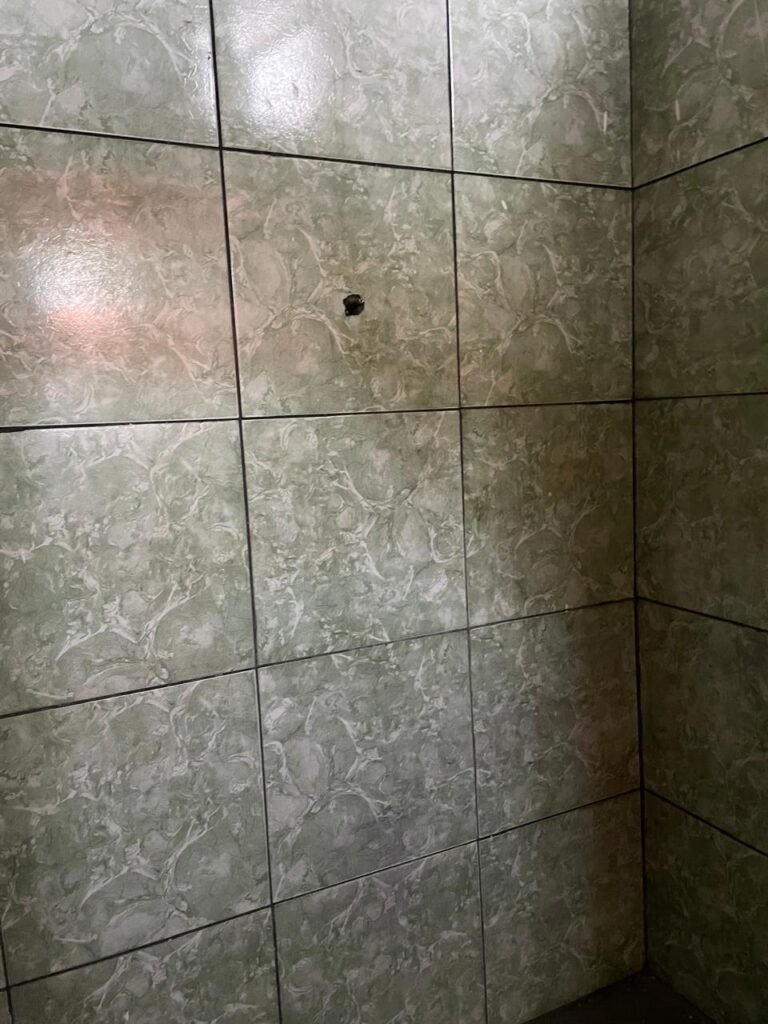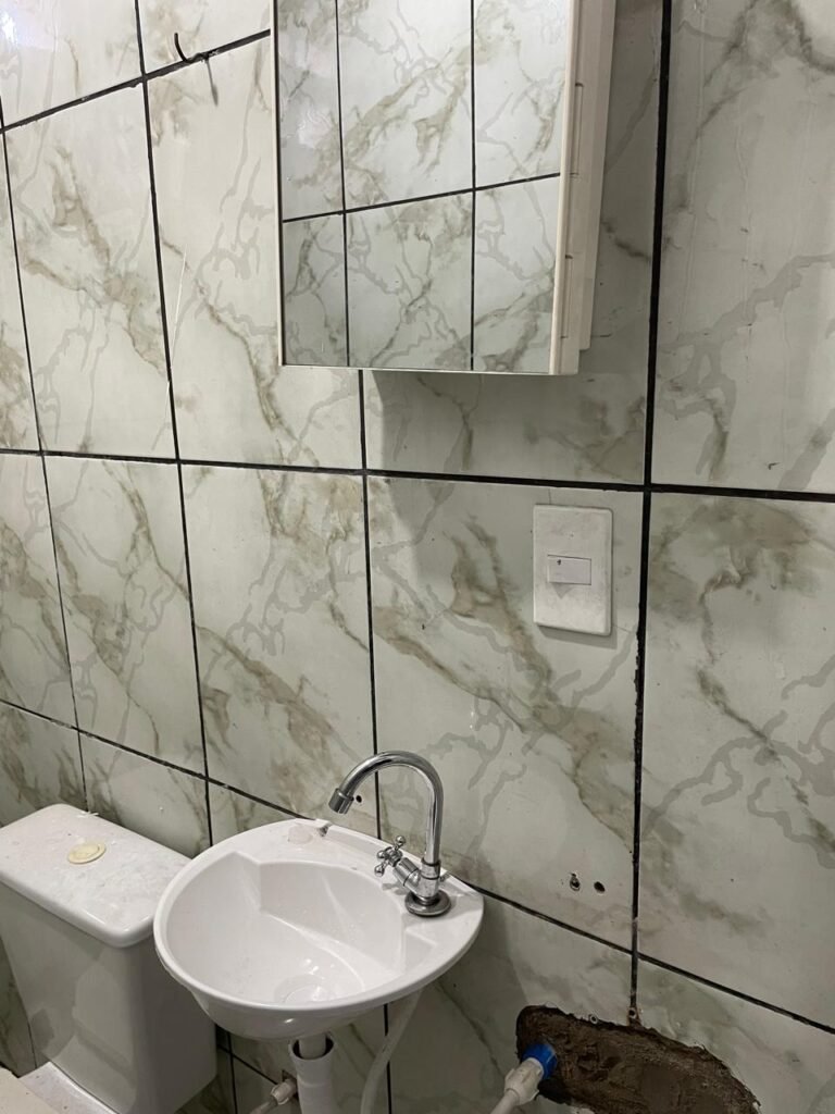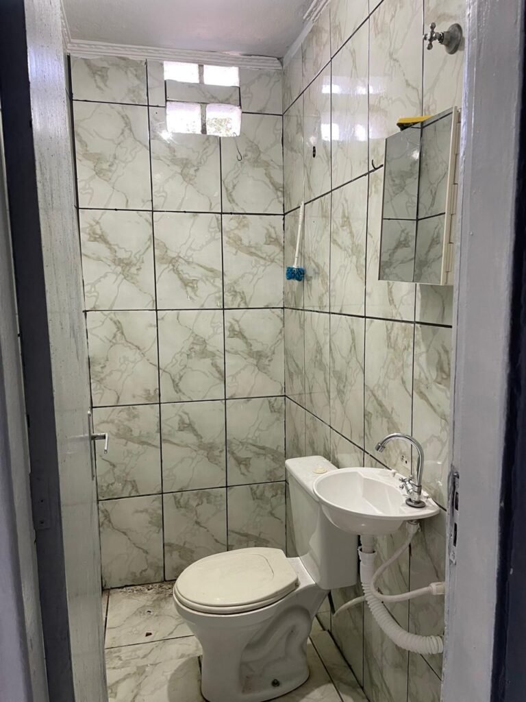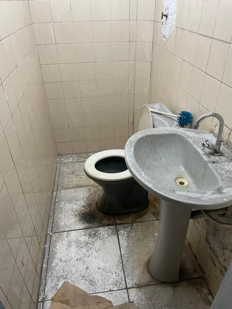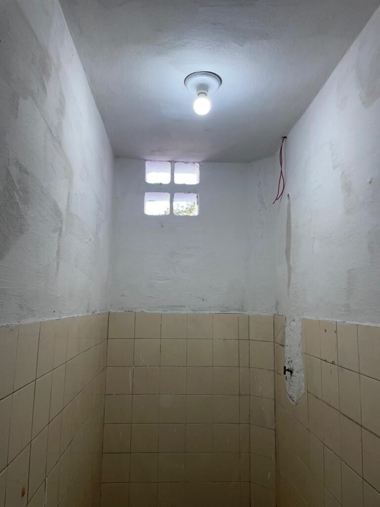 WC BARRACÃO-: 01 porta de madeira com fechadura ferrolho, com pintura na cor azul, parte das paredes revestidas de piso frio cerâmico na cor verde com decoração, com desgaste natural e buracos de instalações, cano pvc aparente, 02 suportes gancho de ferro, piso em ardósia com sujeira, batente de madeira com pintura na cor azul, parede barrada revestida com pisos quadriculados de cerâmica na cor rose, sujos de tinta e com desgaste natural, piso cerâmico cor branco com desgaste natural e com manchas de tinta, restante parede e teto com pintura na cor branco neve, janela de alvenaria em formato de 04 cubos, 01 luminária com 01 lâmpada Led em ordem, pia com coluna de cerâmica cor cinza com desgaste natural, manchas de tinta e sujeira, 01 torneira de inox com manchas de tinta, 01 suporte de papel e higiênico de cerâmica na cor cinza, canopla de chuveiro, 01 vaso sanitário com caixa acoplada, tampa e descarga desgastados na cor cinza e em ordem, 01 fiação na cor vermelha aparente.