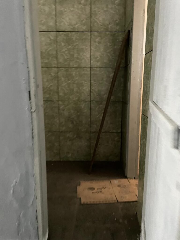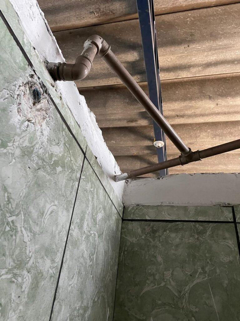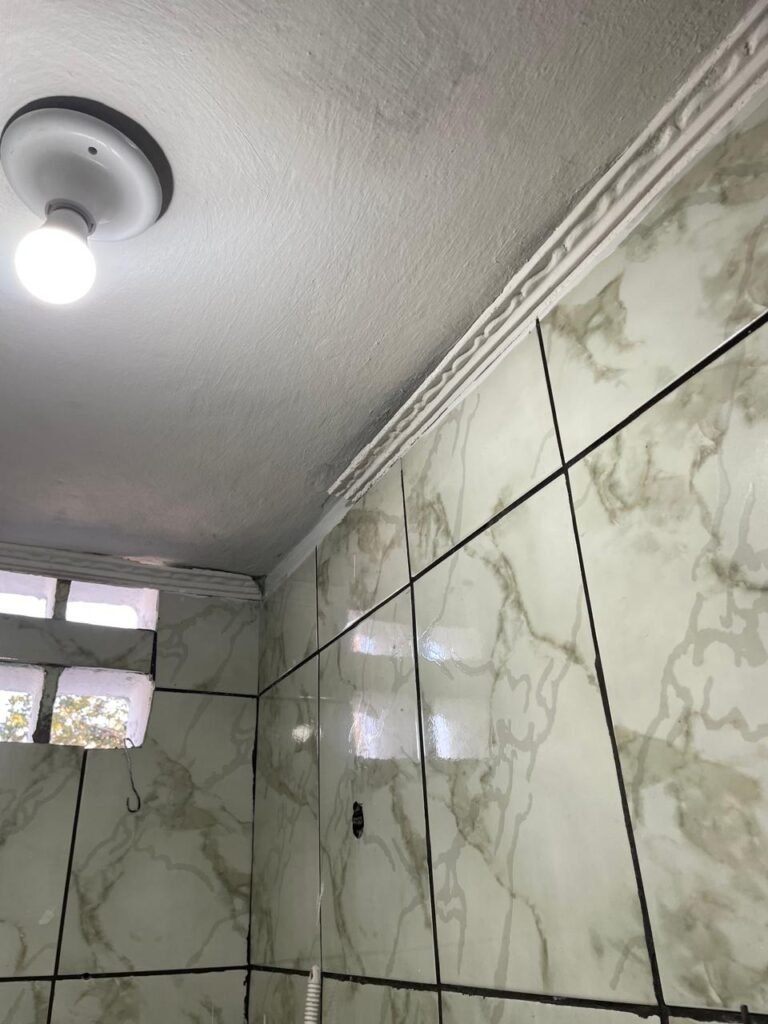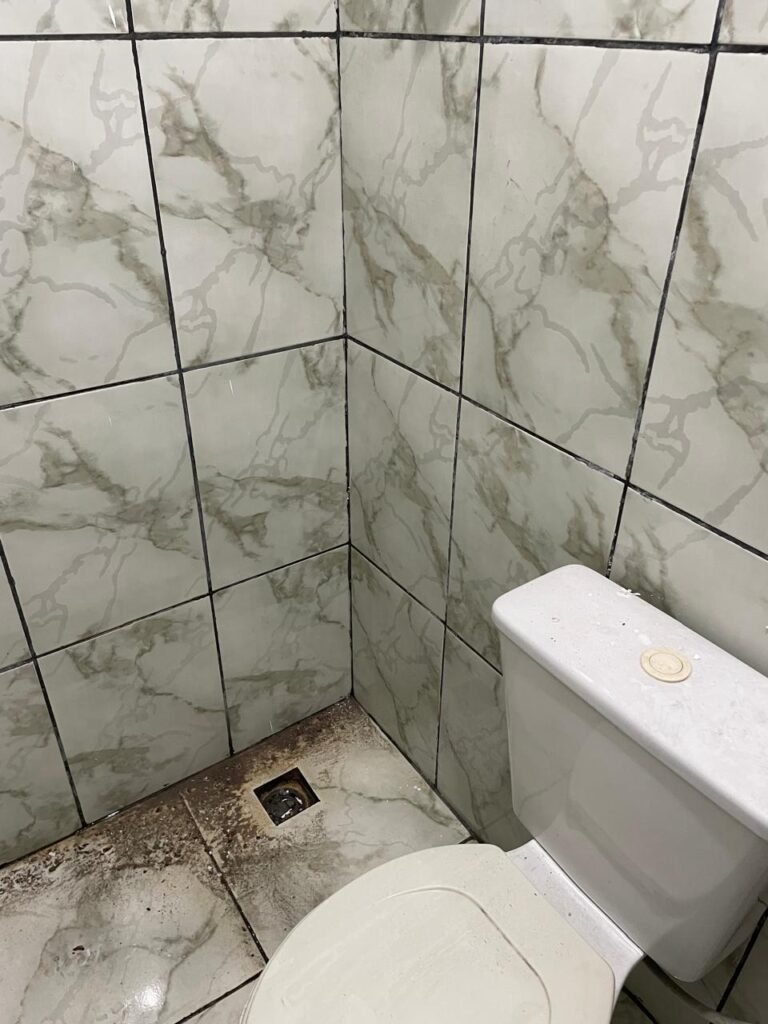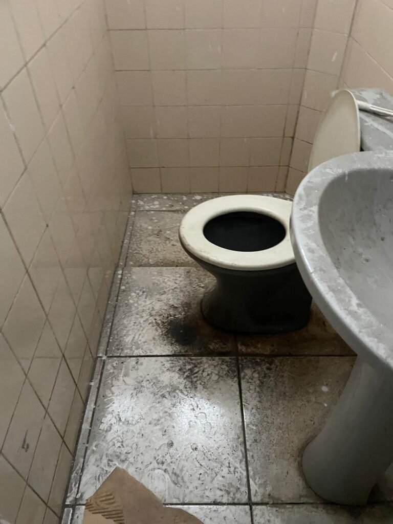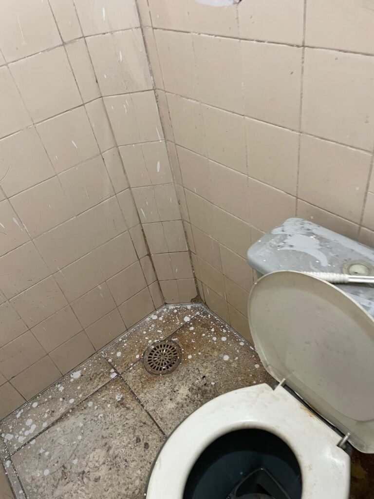 WC BARRACÃO-: 01 porta de madeira com fechadura ferrolho, com pintura na cor azul, parte das paredes revestidas de piso frio cerâmico na cor verde com decoração, com desgaste natural e buracos de instalações, cano pvc aparente, 02 suportes gancho de ferro, piso em ardósia com sujeira, batente de madeira com pintura na cor azul, parede barrada revestida com pisos quadriculados de cerâmica na cor rose, sujos de tinta e com desgaste natural, piso cerâmico cor branco com desgaste natural e com manchas de tinta, restante parede e teto com pintura na cor branco neve, janela de alvenaria em formato de 04 cubos, 01 luminária com 01 lâmpada Led em ordem, pia com coluna de cerâmica cor cinza com desgaste natural, manchas de tinta e sujeira, 01 torneira de inox com manchas de tinta, 01 suporte de papel e higiênico de cerâmica na cor cinza, canopla de chuveiro, 01 vaso sanitário com caixa acoplada, tampa e descarga desgastados na cor cinza e em ordem, 01 fiação na cor vermelha aparente.