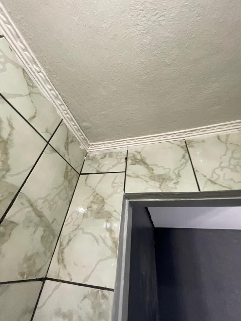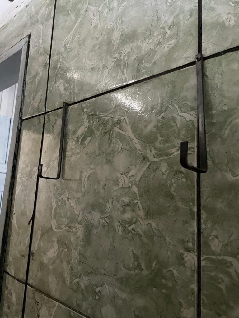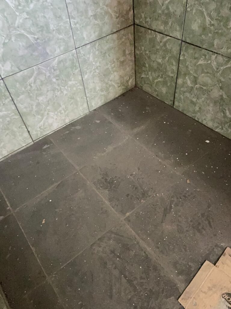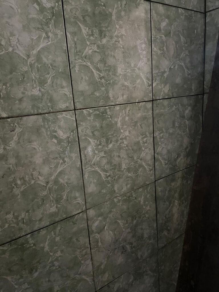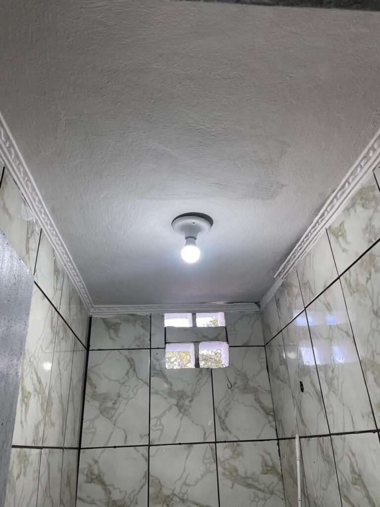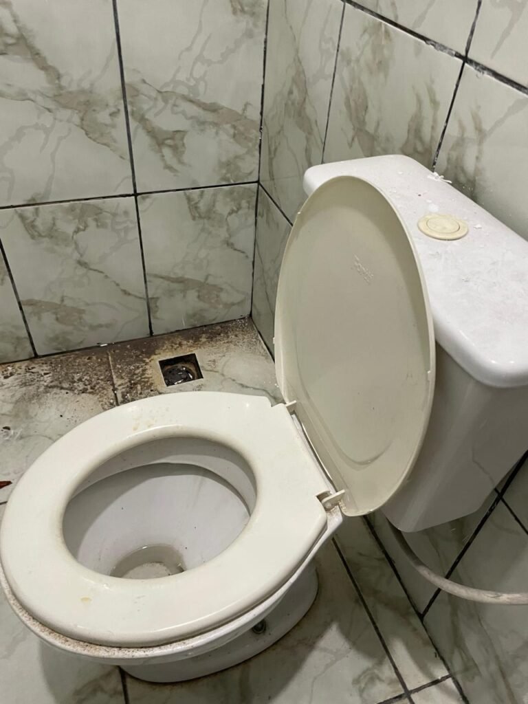 WC BARRACÃO-: 01 porta de madeira com fechadura ferrolho, com pintura na cor azul, parte das paredes revestidas de piso frio cerâmico na cor verde com decoração, com desgaste natural e buracos de instalações, cano pvc aparente, 02 suportes gancho de ferro, piso em ardósia com sujeira, batente de madeira com pintura na cor azul, parede barrada revestida com pisos quadriculados de cerâmica na cor rose, sujos de tinta e com desgaste natural, piso cerâmico cor branco com desgaste natural e com manchas de tinta, restante parede e teto com pintura na cor branco neve, janela de alvenaria em formato de 04 cubos, 01 luminária com 01 lâmpada Led em ordem, pia com coluna de cerâmica cor cinza com desgaste natural, manchas de tinta e sujeira, 01 torneira de inox com manchas de tinta, 01 suporte de papel e higiênico de cerâmica na cor cinza, canopla de chuveiro, 01 vaso sanitário com caixa acoplada, tampa e descarga desgastados na cor cinza e em ordem, 01 fiação na cor vermelha aparente.