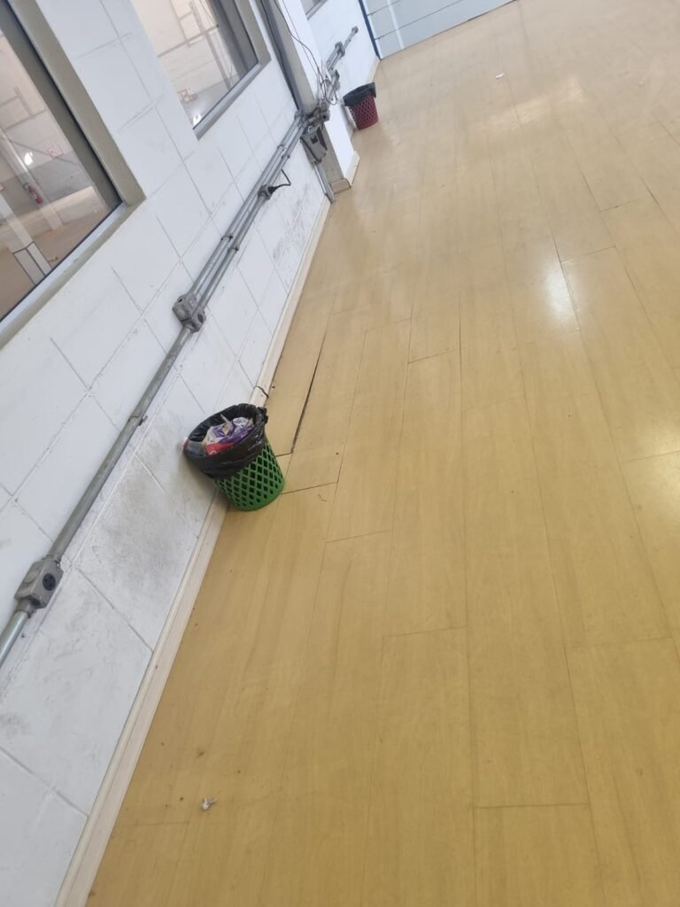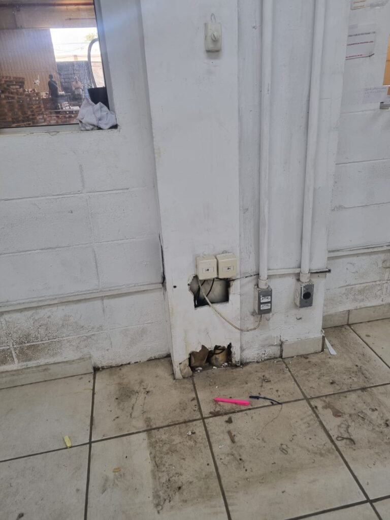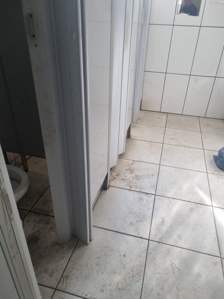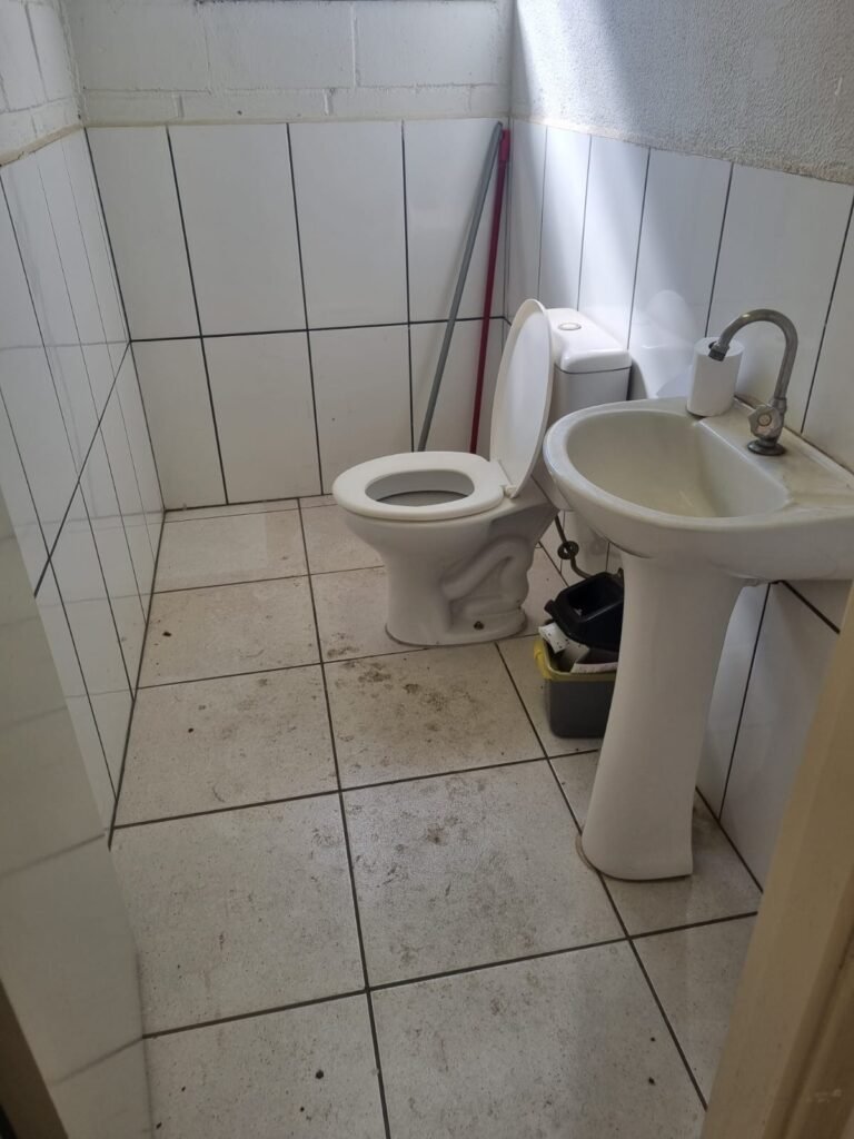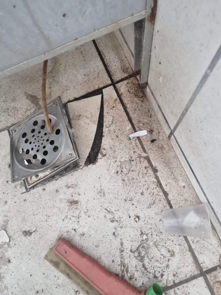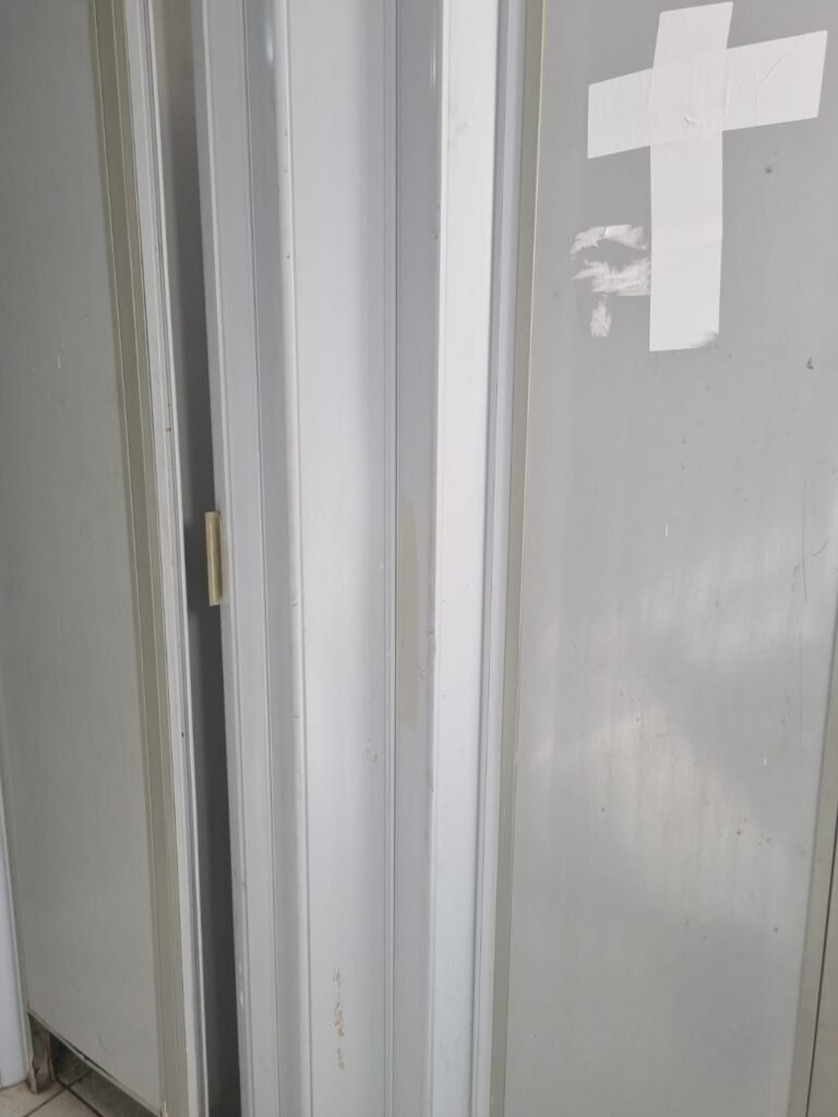 VESTIÁRIO-: Trocar 01 lâmpada queimada, 01 caixa acoplada e descarga com vazamento, 02 portas sanfonada estão danificadas, 01 ralo com tampa solta e piso danificado, porta de chapa com base enferrujada e solta, tampar buracos da instalação do ar condicionado, 02 mictórios que precisam de manutenção, faxina.