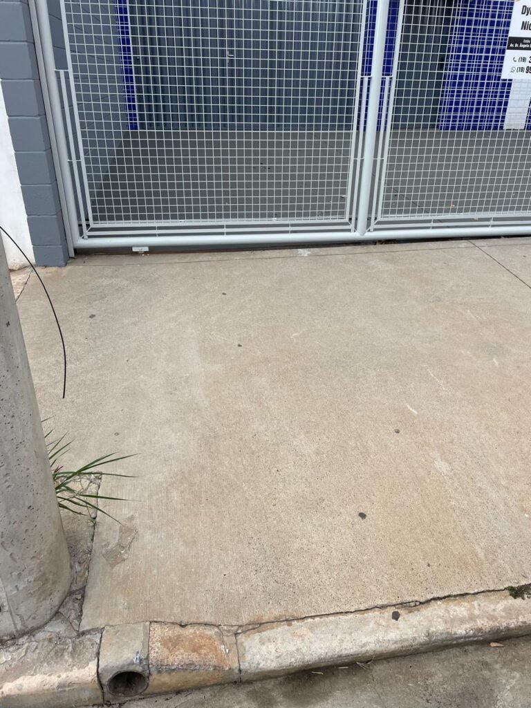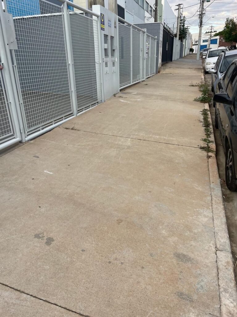 FACHADA-: Calçada revestida de concreto desempenado com desgastes naturais, pequenas marcas, mato pequeno aparente e restante está em ordem, 01 tampa de inspeção na cor vermelha com pequeno racho restante em ordem, parede de alvenaria com pintura na cor cinza com desgastes naturais que restante em ordem, 01 cavalete de água padrão sanasa, com tampa e lacre em ordem, com 01 hidrômetro padrão sanasa em ordem, 01 portão de grade com pintura na cor cinza, com trinco para cadeado com proteção em ordem, 01 espelho de luz com 01 interruptor em ordem.
