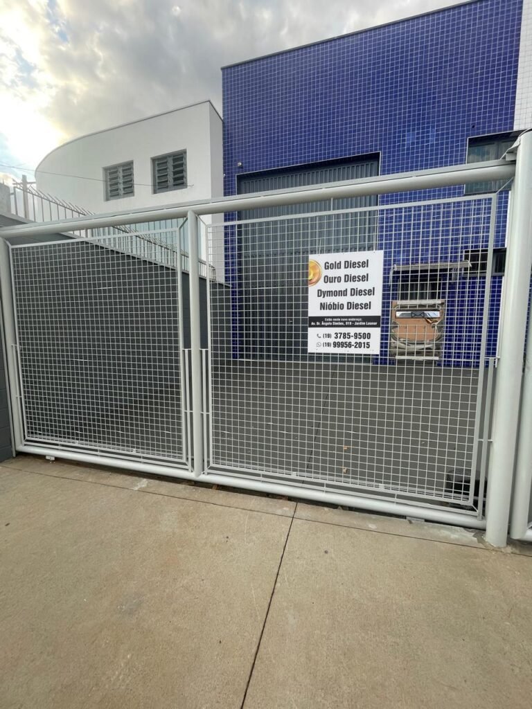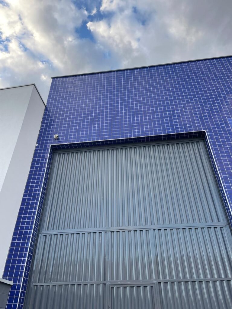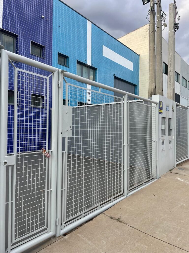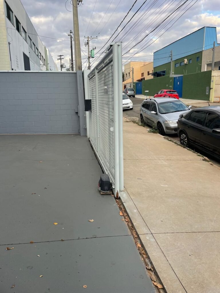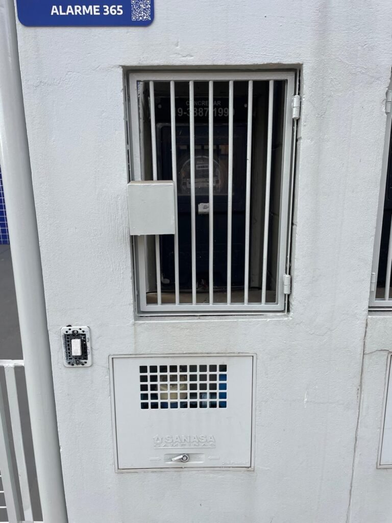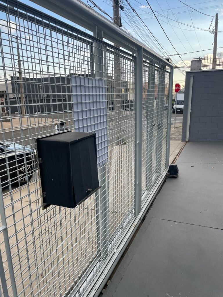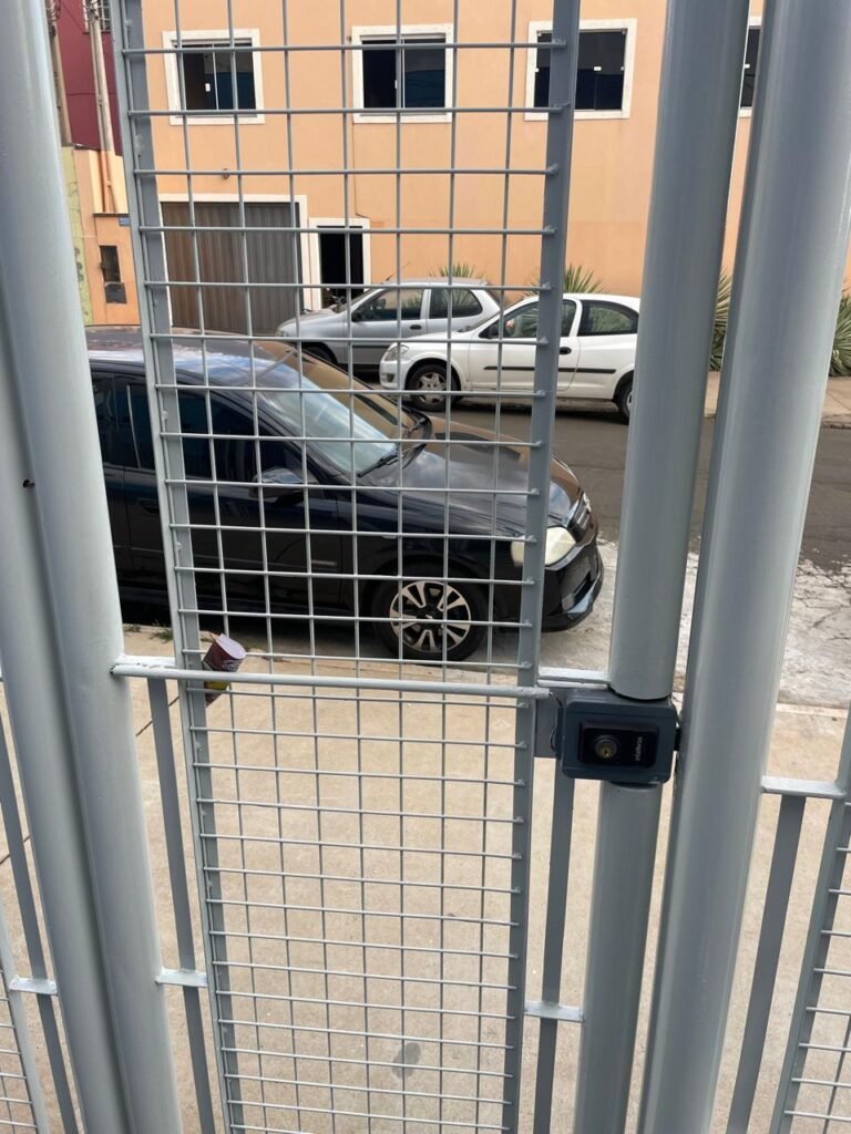 GARAGEM-: 01 Portão deslizante em Gradil de ferro com pintura na cor cinza em ordem, com 01 motor automático marca Garen em ordem e com controle, contendo 01 caixa de correspondência com tampa e 01 fechadura em ordem, com 01 trinco para cadeado. 01 Gradil de ferro com pintura na cor cinza em ordem, com pré-instalação e fiação aparente para fechadura eletrônica, 01 portão social em Gradil de ferro com pintura na cor cinza em ordem, com 01 fechadura starti marca Intelbras em ordem e com chave, piso de concreto com pintura nova na cor cinza, com desgastes naturais e restante em ordem, 01 poste padrão Concremar, com pintura 1/2 na cor cinza nova e em ordem, com 01 porta com grades de ferro e com 01 trinco para cadeado com proteção, 01 tampa de proteção de caixa de medidor elétrico, 01 medidor elétrico em ordem, 01 torneira dupla de inox em ordem, 01 Canopla de registro em ordem, muros laterais em blocos aparente com pintura nova na cor cinza em ordem, paredes do barracão revestidas de pastilhas na cor azul marinho e na cor branco, com pequenos furos com buchas, com buraco para instalação de ar-condicionado, com dígitos “1-8-5” na cor preta em ordem, 01 luminária modelo tartaruga, 02 câmeras não testadas, 01 toldo de acrílico com desgastes natural e restante em ordem.