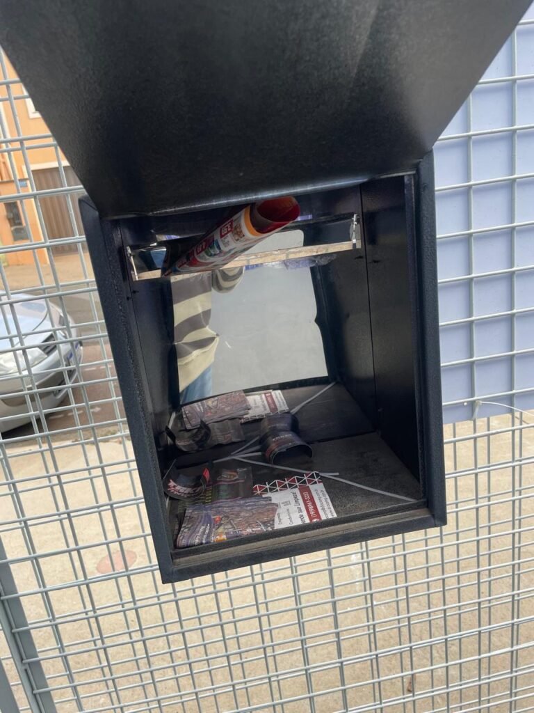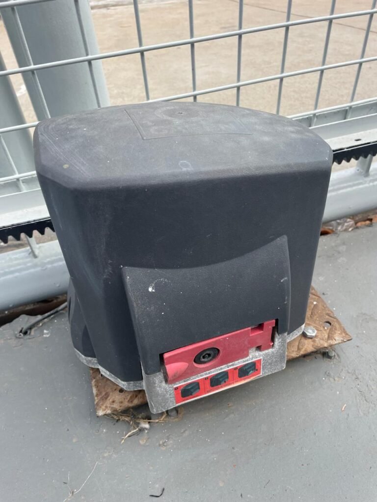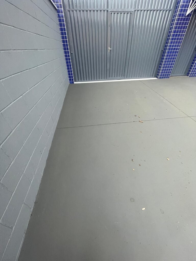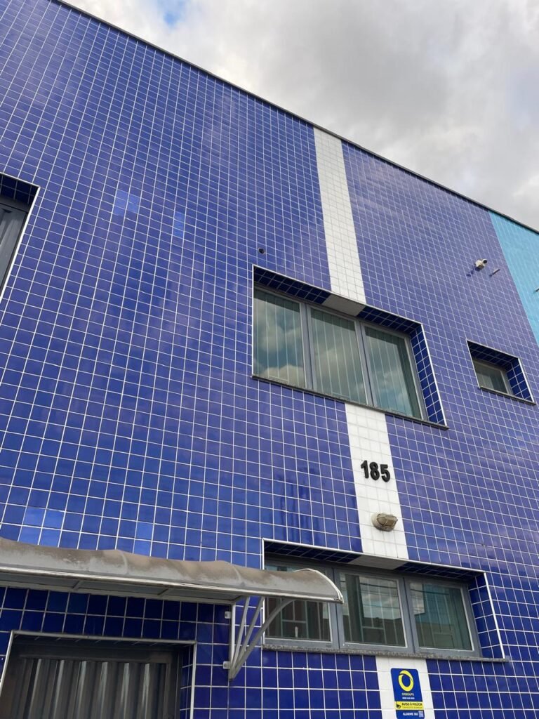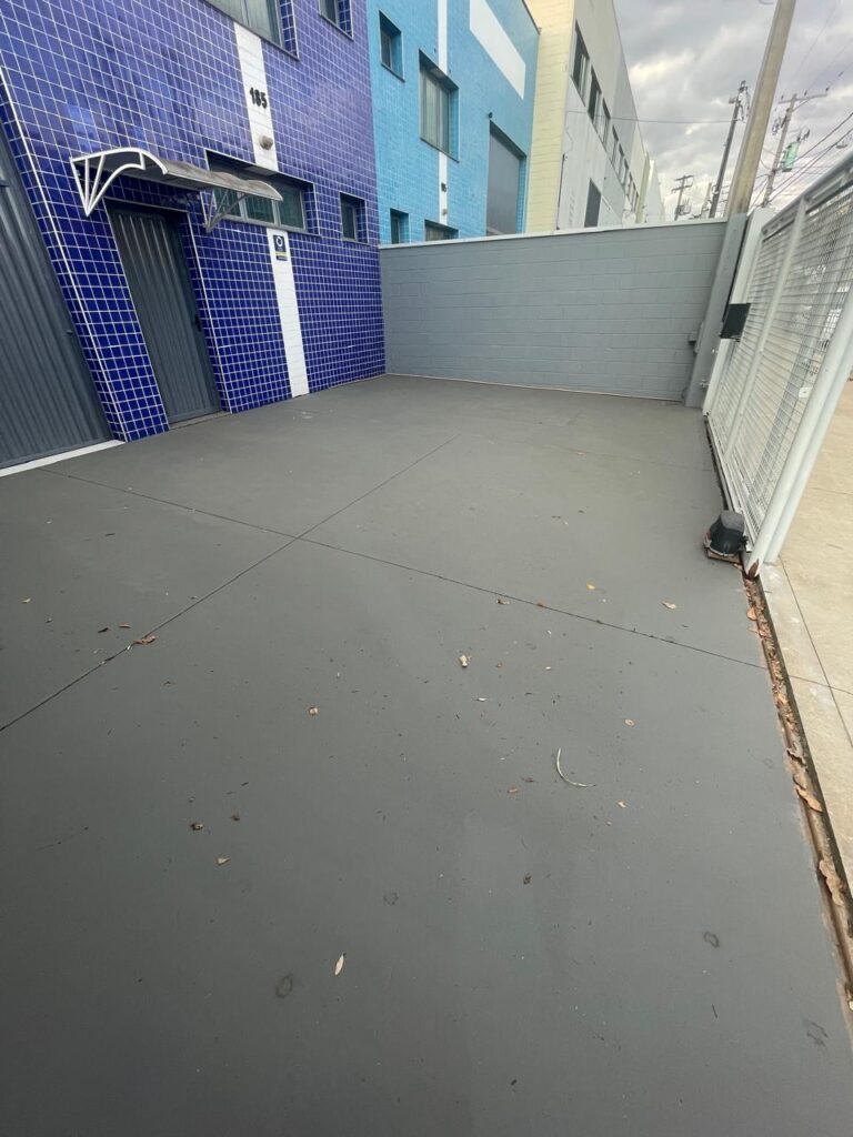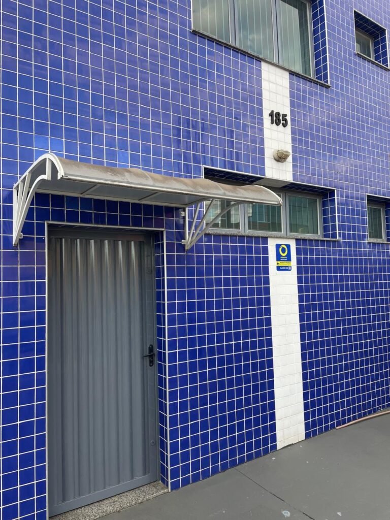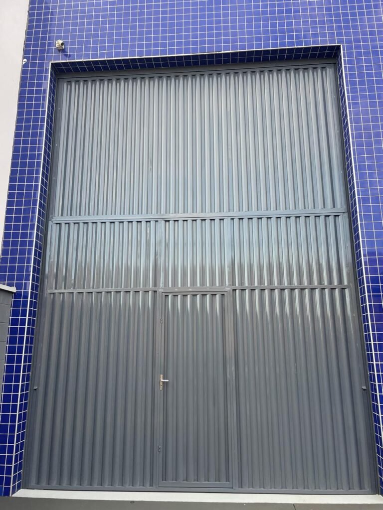 GARAGEM-: 01 Portão deslizante em Gradil de ferro com pintura na cor cinza em ordem, com 01 motor automático marca Garen em ordem e com controle, contendo 01 caixa de correspondência com tampa e 01 fechadura em ordem, com 01 trinco para cadeado. 01 Gradil de ferro com pintura na cor cinza em ordem, com pré-instalação e fiação aparente para fechadura eletrônica, 01 portão social em Gradil de ferro com pintura na cor cinza em ordem, com 01 fechadura starti marca Intelbras em ordem e com chave, piso de concreto com pintura nova na cor cinza, com desgastes naturais e restante em ordem, 01 poste padrão Concremar, com pintura 1/2 na cor cinza nova e em ordem, com 01 porta com grades de ferro e com 01 trinco para cadeado com proteção, 01 tampa de proteção de caixa de medidor elétrico, 01 medidor elétrico em ordem, 01 torneira dupla de inox em ordem, 01 Canopla de registro em ordem, muros laterais em blocos aparente com pintura nova na cor cinza em ordem, paredes do barracão revestidas de pastilhas na cor azul marinho e na cor branco, com pequenos furos com buchas, com buraco para instalação de ar-condicionado, com dígitos “1-8-5” na cor preta em ordem, 01 luminária modelo tartaruga, 02 câmeras não testadas, 01 toldo de acrílico com desgastes natural e restante em ordem.