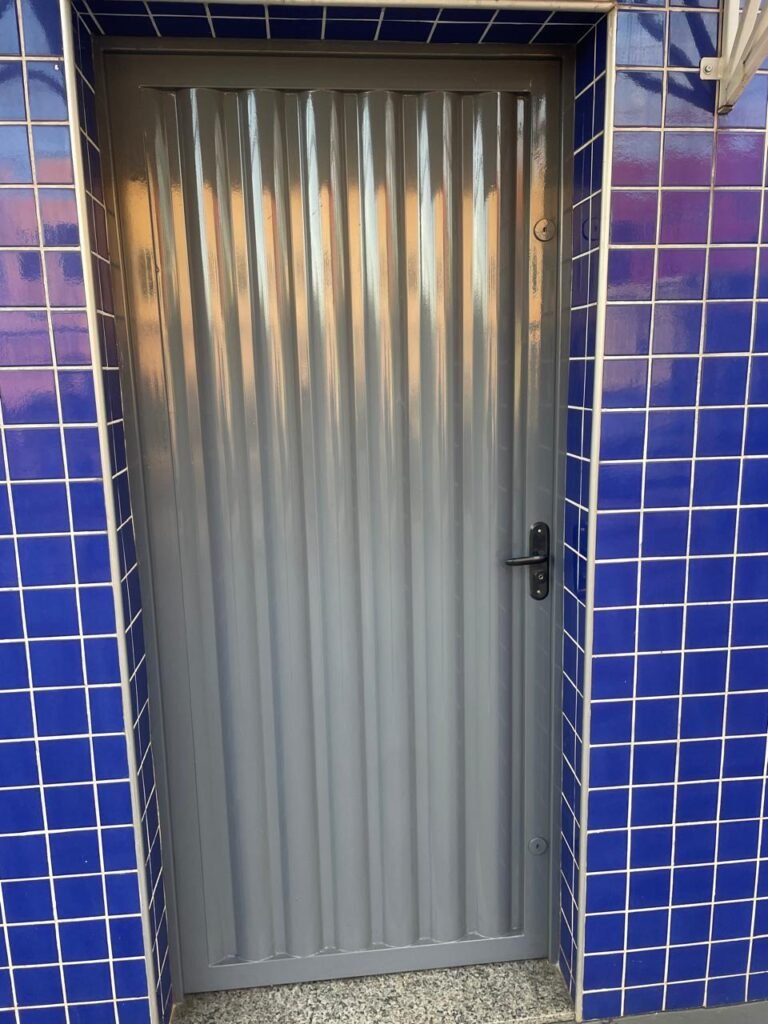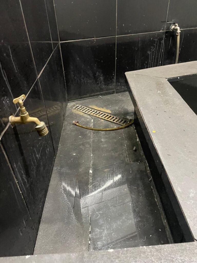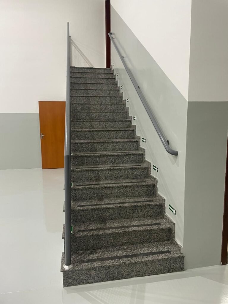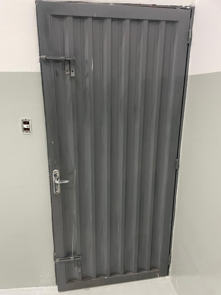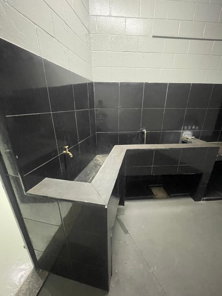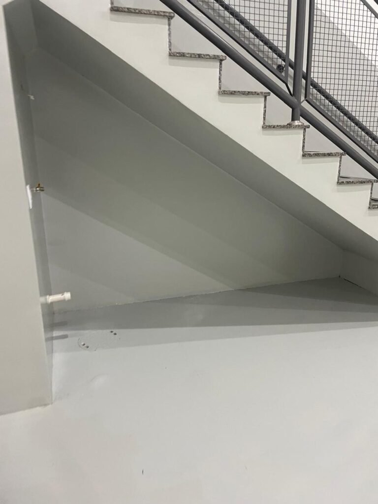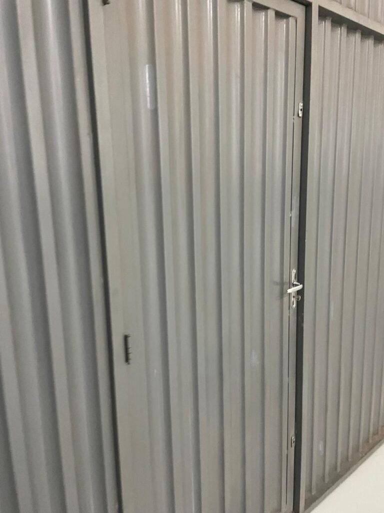 FUNDO-: 01 Porta de aço com pintura na cor cinza com manchas de pintura na cor branco, com maçaneta e fechadura em inox marca Stam em ordem, com 02 fechaduras ferrolho com 01 trinco para cadeado em cada em ordem, 01 soleira de granito cinza ocre ordem, piso de concreto com pintura na cor cinza nova e em ordem, 01 ralo grelha de ferro em ordem, paredes de blocos aparente com pintura epóxi nova cor verde água nova e em ordem, 01 tampa de inspeção de plástico na cor branco, 01 tanque revestido de pisos frios cerâmico na cor preto com manchas, com desgastes naturais, com 02 torneiras sendo 01 de jardim e 01 de alavanca em ordem, 01 ralo em ordem e 01 sifão sanfonado vazando, 02 lâmpadas tubulares florescentes, sendo que apenas metade de 01 está com led em ordem, lateral com fechamento em grades de ferro com pintura na cor cinza com desgastes naturais, teto com fechamento em telhas galvanizada e 01 telha translúcida, 17 placas de sinalizações na escada.