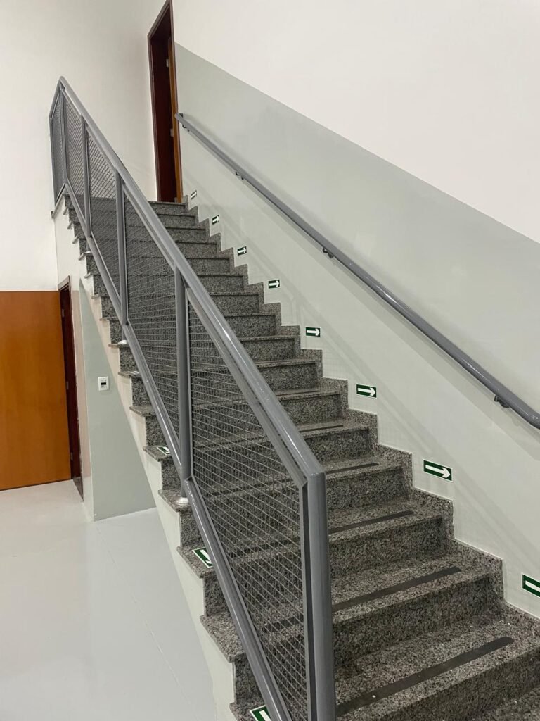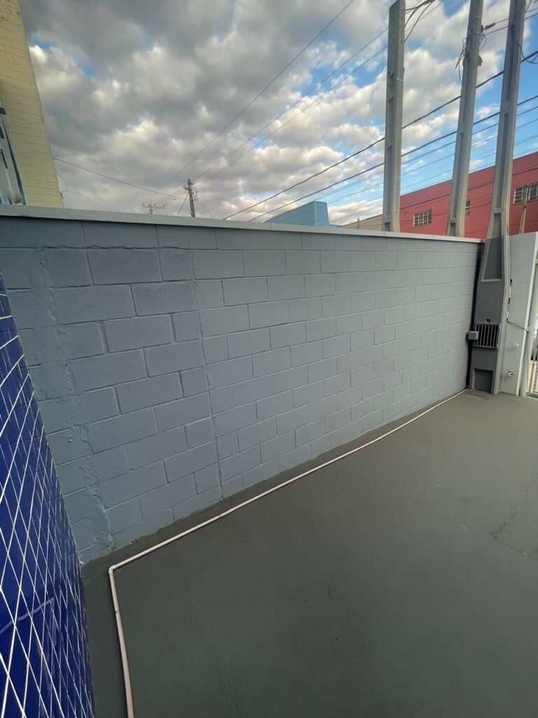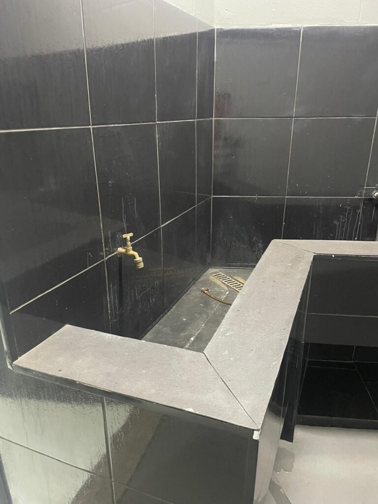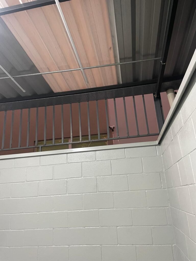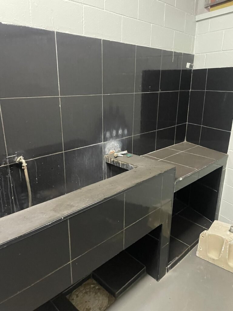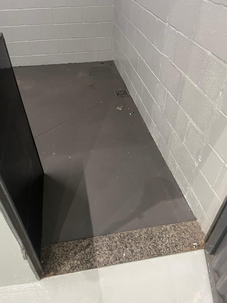 FUNDO-: 01 Porta de aço com pintura na cor cinza com manchas de pintura na cor branco, com maçaneta e fechadura em inox marca Stam em ordem, com 02 fechaduras ferrolho com 01 trinco para cadeado em cada em ordem, 01 soleira de granito cinza ocre ordem, piso de concreto com pintura na cor cinza nova e em ordem, 01 ralo grelha de ferro em ordem, paredes de blocos aparente com pintura epóxi nova cor verde água nova e em ordem, 01 tampa de inspeção de plástico na cor branco, 01 tanque revestido de pisos frios cerâmico na cor preto com manchas, com desgastes naturais, com 02 torneiras sendo 01 de jardim e 01 de alavanca em ordem, 01 ralo em ordem e 01 sifão sanfonado vazando, 02 lâmpadas tubulares florescentes, sendo que apenas metade de 01 está com led em ordem, lateral com fechamento em grades de ferro com pintura na cor cinza com desgastes naturais, teto com fechamento em telhas galvanizada e 01 telha translúcida, 17 placas de sinalizações na escada.