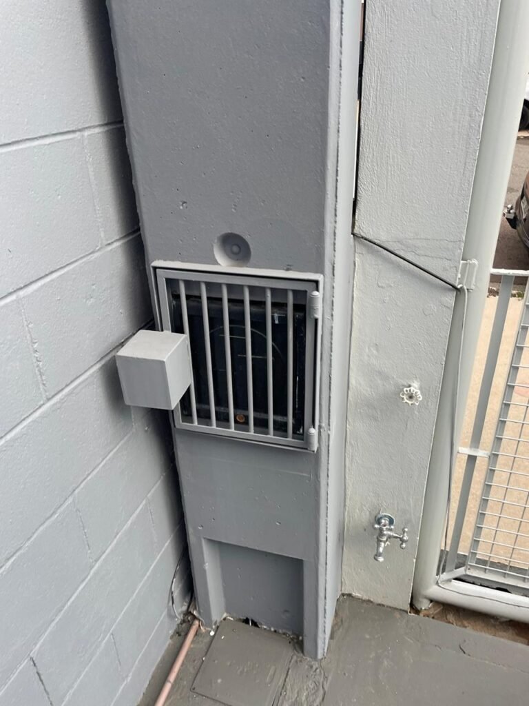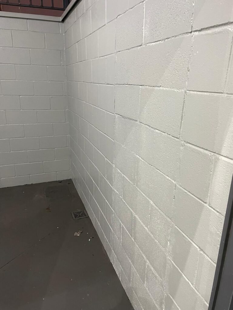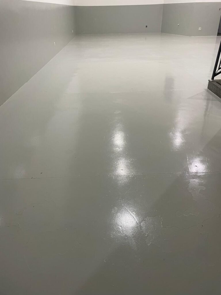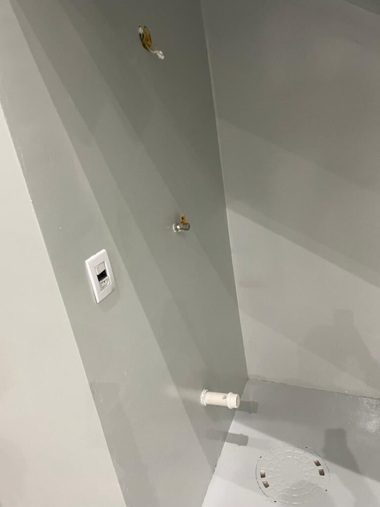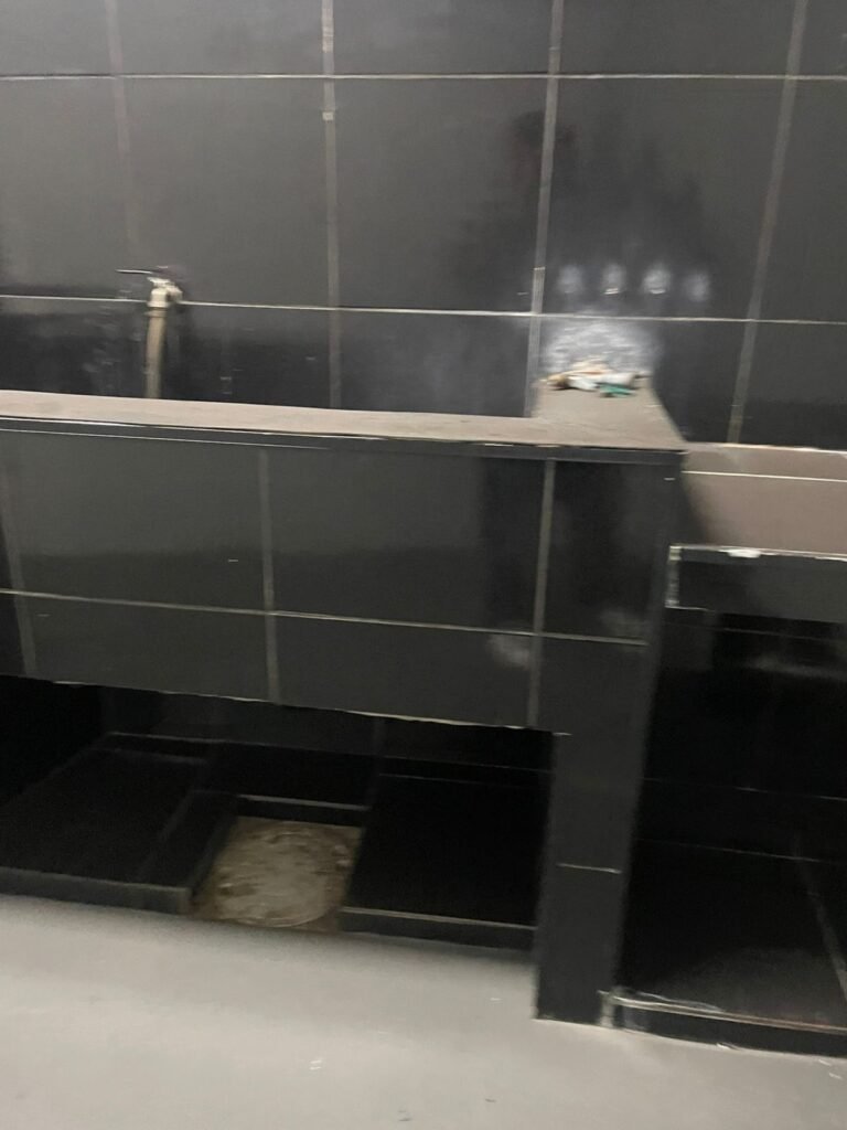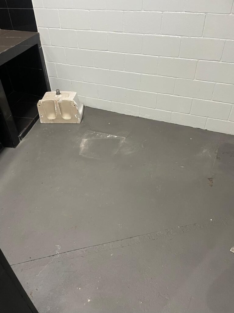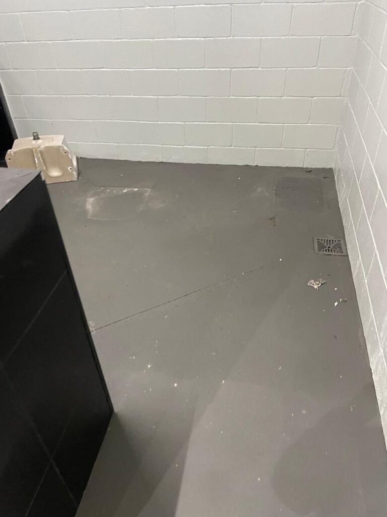 FUNDO-: 01 Porta de aço com pintura na cor cinza com manchas de pintura na cor branco, com maçaneta e fechadura em inox marca Stam em ordem, com 02 fechaduras ferrolho com 01 trinco para cadeado em cada em ordem, 01 soleira de granito cinza ocre ordem, piso de concreto com pintura na cor cinza nova e em ordem, 01 ralo grelha de ferro em ordem, paredes de blocos aparente com pintura epóxi nova cor verde água nova e em ordem, 01 tampa de inspeção de plástico na cor branco, 01 tanque revestido de pisos frios cerâmico na cor preto com manchas, com desgastes naturais, com 02 torneiras sendo 01 de jardim e 01 de alavanca em ordem, 01 ralo em ordem e 01 sifão sanfonado vazando, 02 lâmpadas tubulares florescentes, sendo que apenas metade de 01 está com led em ordem, lateral com fechamento em grades de ferro com pintura na cor cinza com desgastes naturais, teto com fechamento em telhas galvanizada e 01 telha translúcida, 17 placas de sinalizações na escada.