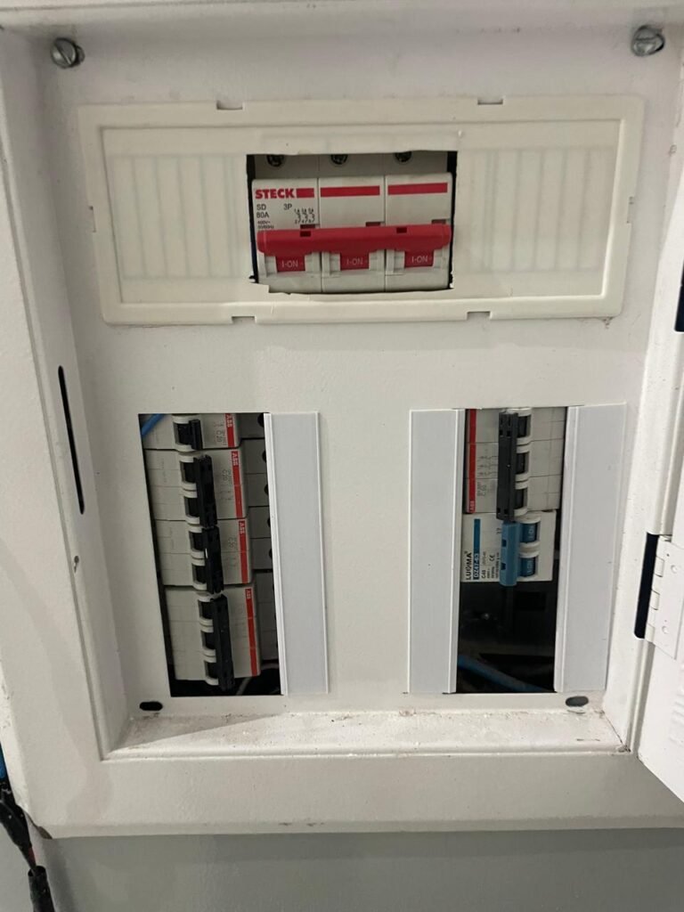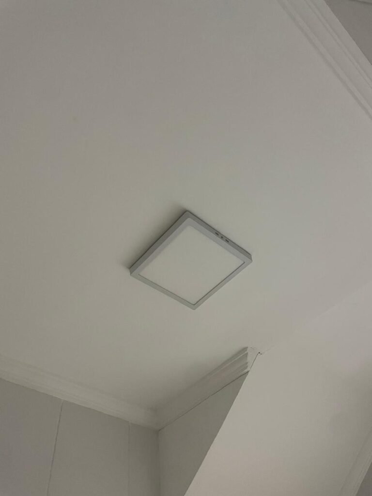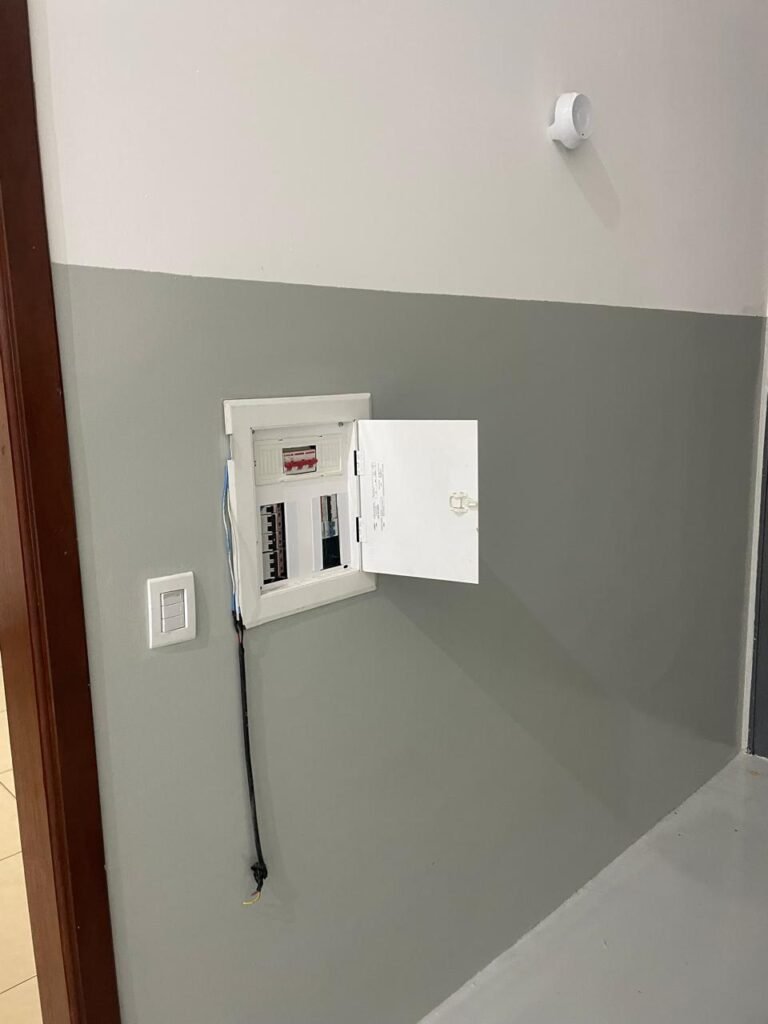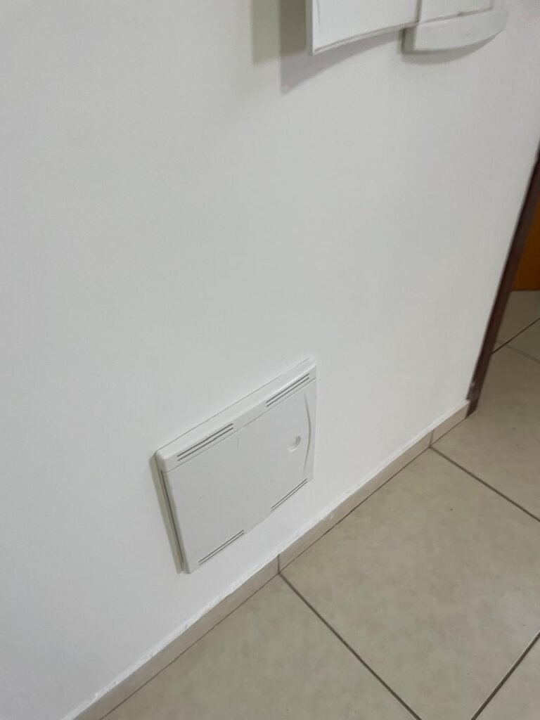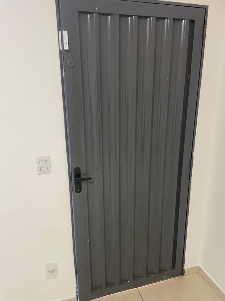 SALA DE RECEPÇÃO-: 01 Porta de aço com pintura nova na cor cinza em ordem, com 03 fechaduras tetra marca Stam, mas como chaves em ordem, maçanetas na cor preto em ordem, 01 soleira de granito cinza em ordem, pisos e rodapés revestidos de porcelanato na cor creme, com pequenas marcas, riscos e restante em ordem, paredes e tetos com pintura nova na cor branco neve em ordem, gola de gesso com pintura nova na cor branco neve em ordem, 03 vitrôs basculantes com esquadrias de ferro, com pintura na cor cinza com desgastes naturais, com grades de ferro de proteção em ordem, ambas com 01 fechadura e com 01 vidro liso blindex transparente e em ordem, 09 espelhos de luz, 01 deles sem tampa e 01 danificado, dentre eles: 01 espelho com 02 interruptores, 01 espelho com 01 interruptor, 01 espelho com 01 campainha, 03 espelhos com 02 tomadas, 01 espelho com 01 entrada para fio de dados e 01 espelho com 02 entradas para fio de dados. 01 câmera não testada, 02 caixas de proteção marca tigre, ambas com porta em ordem, 01 quadro de distribuição de disjuntores, com disjuntores em ordem. 01 porta social de madeira envernizada em ordem, com maçanetas e fechadura marca Aliança em ordem e com chave, 01 luminária plafon de sobrepor com led em ordem.