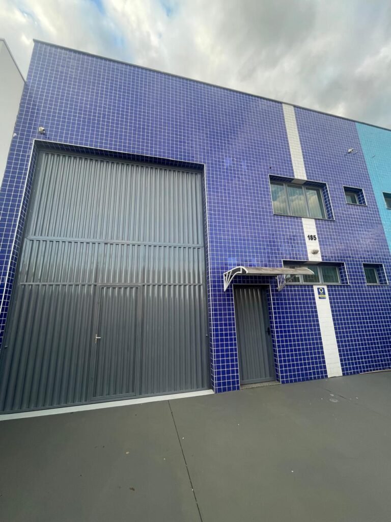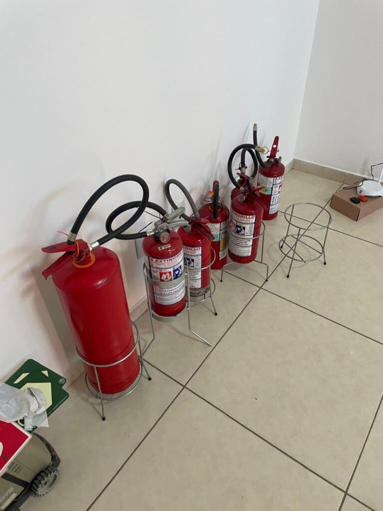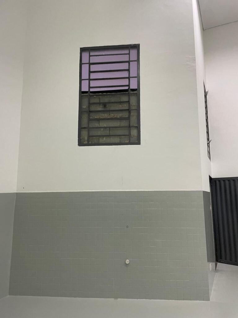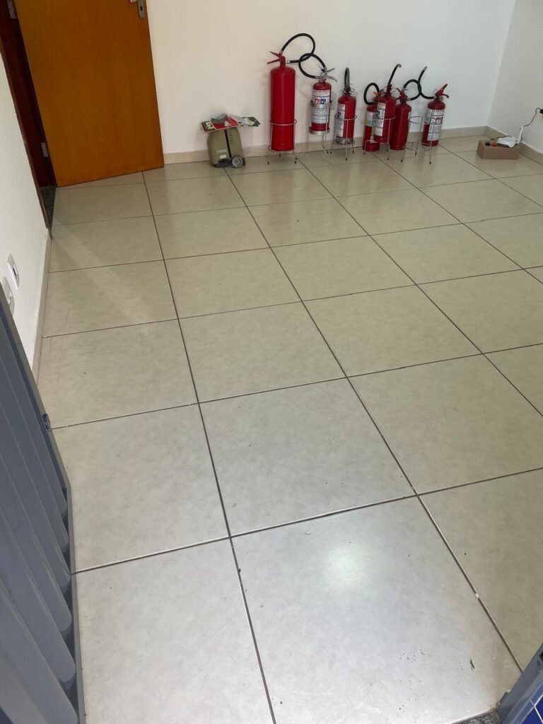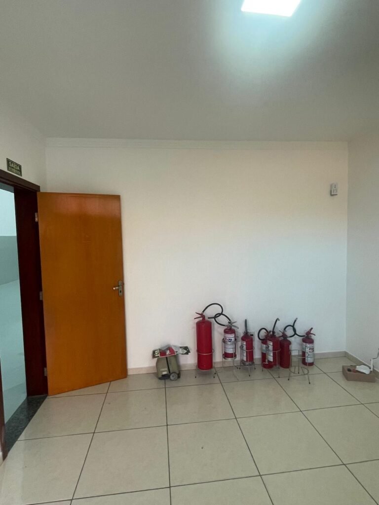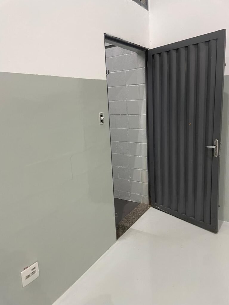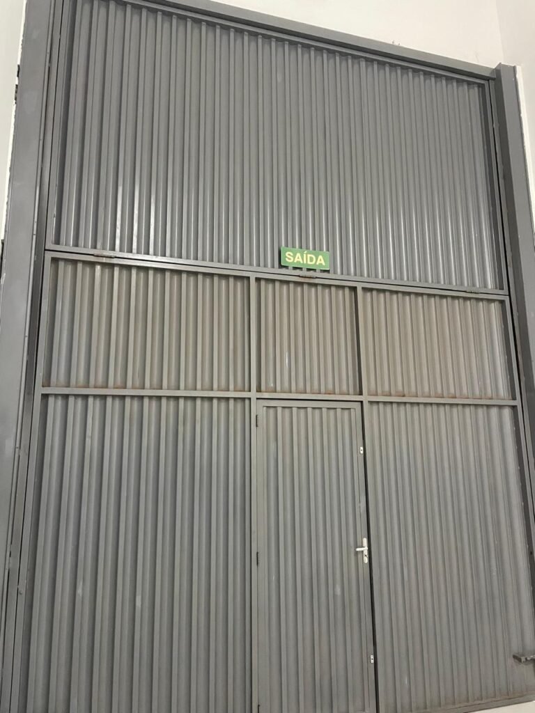 BARRACÃO INTERIOR-: Piso com pintura epóxi nova na cor verde água em ordem, paredes com pintura 1/2 de epóxi nova na cor verde água em ordem, e restante na cor branco neve nova e em ordem, 01 portão de ferro de chapa dobrável com pintura na cor cinza com desgastes naturais e restante em ordem, com 02 trincos ferrolhos em ordem, com 01 porta social, com maçanetas e fechadura tetra de inox marca Stam em ordem e com chave, com 02 fechaduras tetras marca Stam com chave em ordem, 01 ferro de suporte para manuseio de portão em ordem, 01 câmera não testada, 01 sensor não testado, 01 quadro e distribuição de disjuntores com tampa de ferro e fechaduras em ordem, com disjuntores em ordem, 08 espelhos de luz, 02 deles sem tampa e restante em ordem, sendo eles: 01 espelho com 03 interruptores, 05 espelhos com 02 tomadas, 01 espelho com 01 interruptor, 01 espelho com 01 tomada e 01 interruptor, 02 vitrôs basculantes com esquadrias de ferro com pintura na cor cinza em ordem, com 01 fechadura em cada em ordem, com metade isolada, com 24 vidros canelados em cada vitrô, com manchas, 01 vidro trincado e restante em ordem, 01 escada revestidas de granito cor cinza ocre com manchas de tinta, com adesivos antiderrapantes, com corrimão e guarda corpo com pintura nova na cor cinza em ordem, 01 porta de ferro para alçapão com 01 trinco para cadeado em ordem, teto com forro de gesso rebaixado, tem pintura nova na cura branco neve em ordem, 07 luminárias de sobrepor, com refletores de led em ordem 50w IP 65, sendo que apenas 01 led está danificado, restante está em ordem, 01 extintor de água10L 2A vencido em 2023 e 06 de pó químico 20BC 4kg vencidos em 2022.