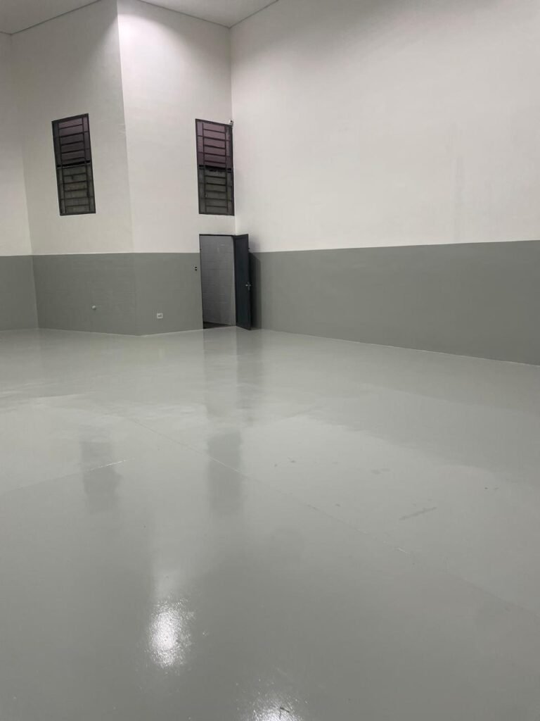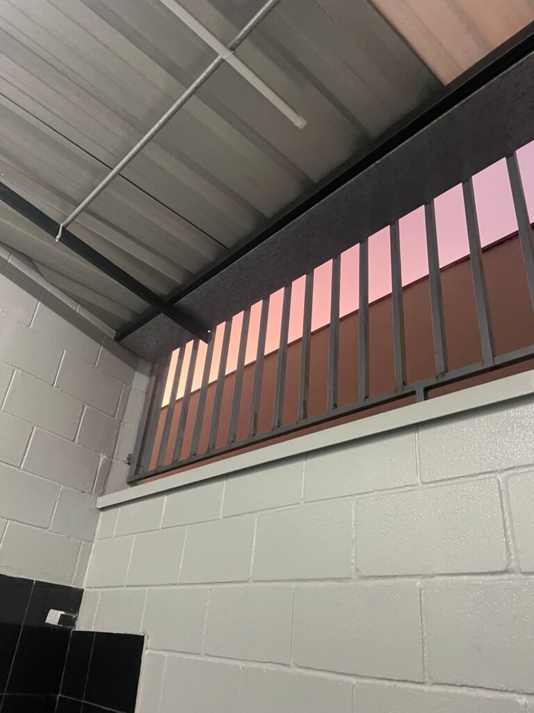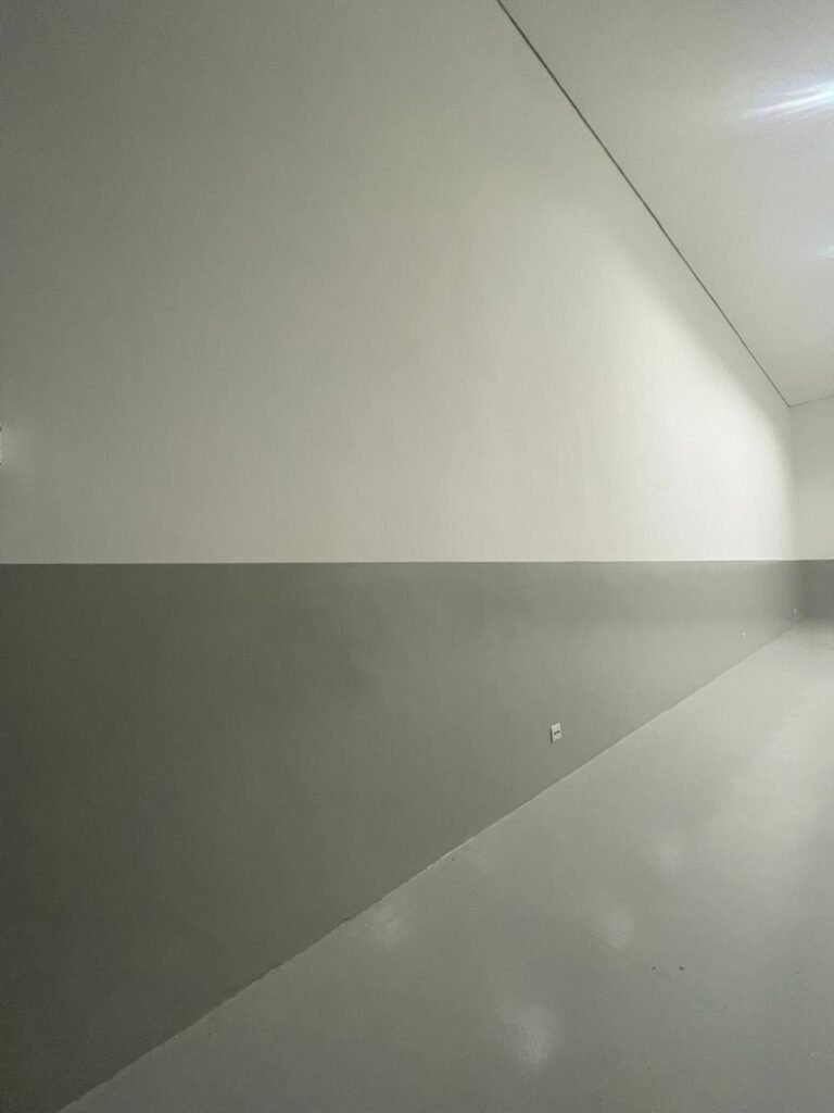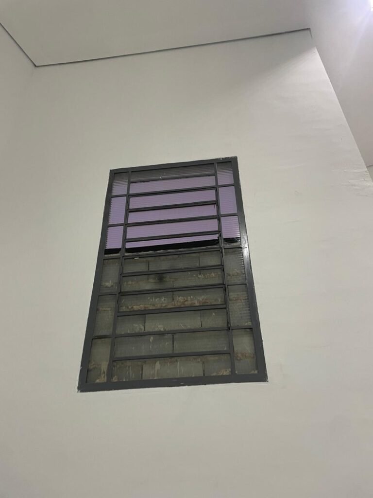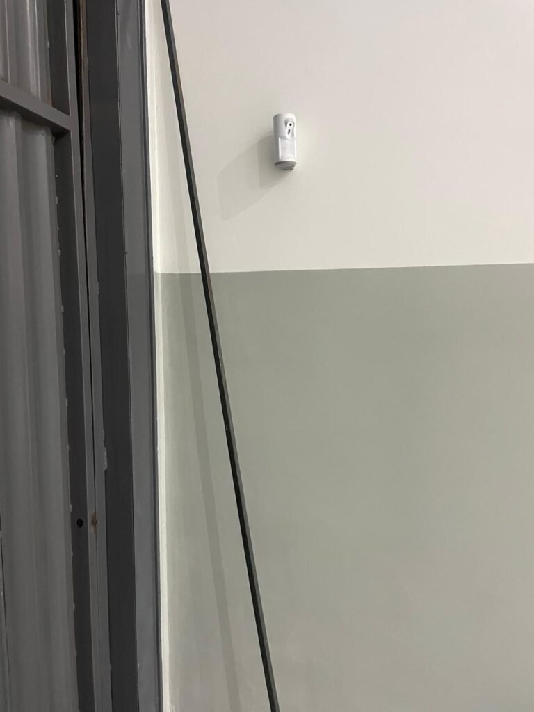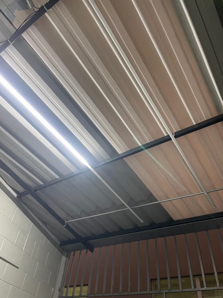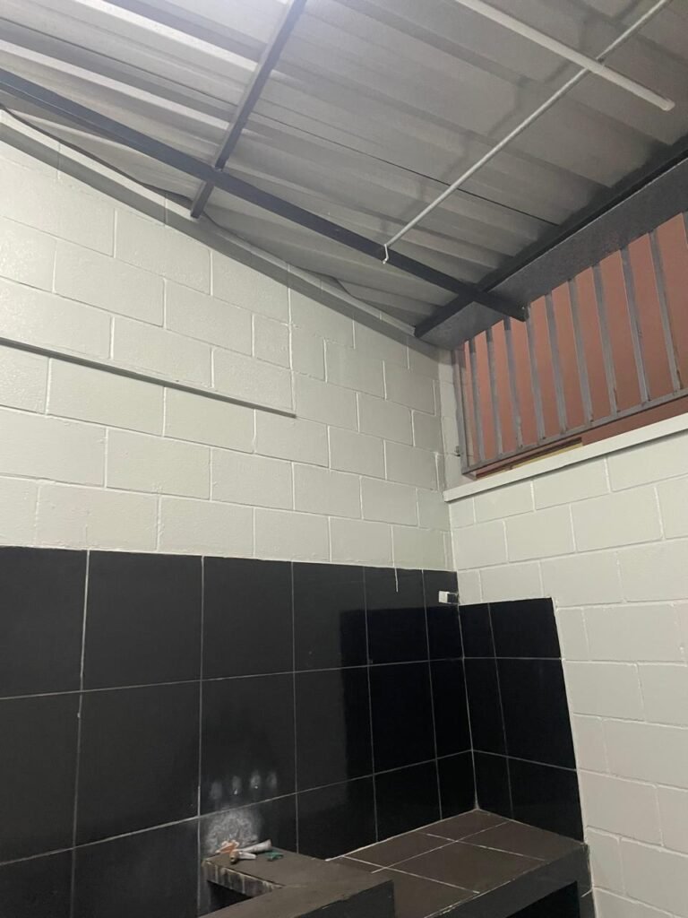 BARRACÃO INTERIOR-: Piso com pintura epóxi nova na cor verde água em ordem, paredes com pintura 1/2 de epóxi nova na cor verde água em ordem, e restante na cor branco neve nova e em ordem, 01 portão de ferro de chapa dobrável com pintura na cor cinza com desgastes naturais e restante em ordem, com 02 trincos ferrolhos em ordem, com 01 porta social, com maçanetas e fechadura tetra de inox marca Stam em ordem e com chave, com 02 fechaduras tetras marca Stam com chave em ordem, 01 ferro de suporte para manuseio de portão em ordem, 01 câmera não testada, 01 sensor não testado, 01 quadro e distribuição de disjuntores com tampa de ferro e fechaduras em ordem, com disjuntores em ordem, 08 espelhos de luz, 02 deles sem tampa e restante em ordem, sendo eles: 01 espelho com 03 interruptores, 05 espelhos com 02 tomadas, 01 espelho com 01 interruptor, 01 espelho com 01 tomada e 01 interruptor, 02 vitrôs basculantes com esquadrias de ferro com pintura na cor cinza em ordem, com 01 fechadura em cada em ordem, com metade isolada, com 24 vidros canelados em cada vitrô, com manchas, 01 vidro trincado e restante em ordem, 01 escada revestidas de granito cor cinza ocre com manchas de tinta, com adesivos antiderrapantes, com corrimão e guarda corpo com pintura nova na cor cinza em ordem, 01 porta de ferro para alçapão com 01 trinco para cadeado em ordem, teto com forro de gesso rebaixado, tem pintura nova na cura branco neve em ordem, 07 luminárias de sobrepor, com refletores de led em ordem 50w IP 65, sendo que apenas 01 led está danificado, restante está em ordem, 01 extintor de água10L 2A vencido em 2023 e 06 de pó químico 20BC 4kg vencidos em 2022.