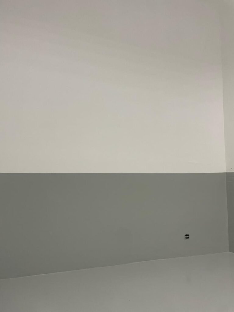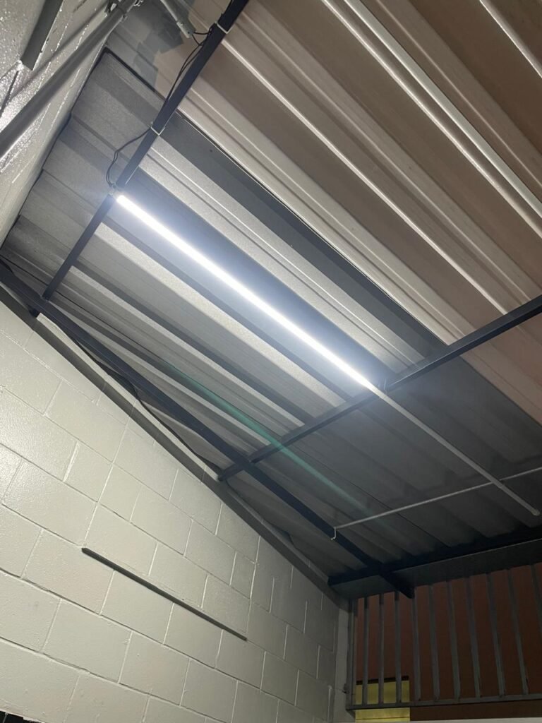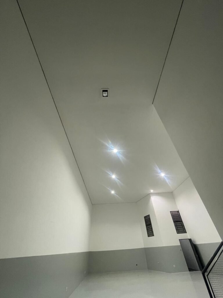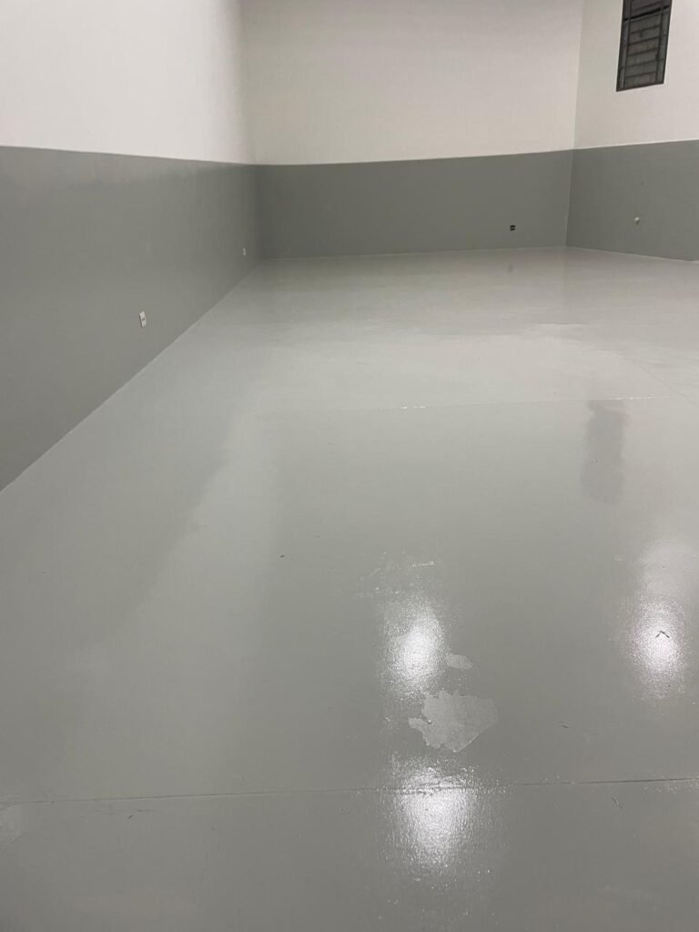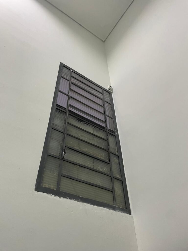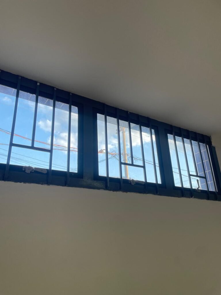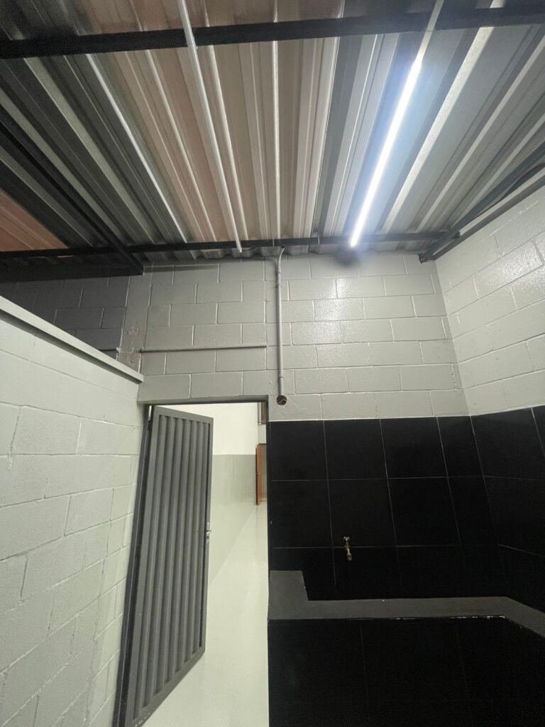 BARRACÃO INTERIOR-: Piso com pintura epóxi nova na cor verde água em ordem, paredes com pintura 1/2 de epóxi nova na cor verde água em ordem, e restante na cor branco neve nova e em ordem, 01 portão de ferro de chapa dobrável com pintura na cor cinza com desgastes naturais e restante em ordem, com 02 trincos ferrolhos em ordem, com 01 porta social, com maçanetas e fechadura tetra de inox marca Stam em ordem e com chave, com 02 fechaduras tetras marca Stam com chave em ordem, 01 ferro de suporte para manuseio de portão em ordem, 01 câmera não testada, 01 sensor não testado, 01 quadro e distribuição de disjuntores com tampa de ferro e fechaduras em ordem, com disjuntores em ordem, 08 espelhos de luz, 02 deles sem tampa e restante em ordem, sendo eles: 01 espelho com 03 interruptores, 05 espelhos com 02 tomadas, 01 espelho com 01 interruptor, 01 espelho com 01 tomada e 01 interruptor, 02 vitrôs basculantes com esquadrias de ferro com pintura na cor cinza em ordem, com 01 fechadura em cada em ordem, com metade isolada, com 24 vidros canelados em cada vitrô, com manchas, 01 vidro trincado e restante em ordem, 01 escada revestidas de granito cor cinza ocre com manchas de tinta, com adesivos antiderrapantes, com corrimão e guarda corpo com pintura nova na cor cinza em ordem, 01 porta de ferro para alçapão com 01 trinco para cadeado em ordem, teto com forro de gesso rebaixado, tem pintura nova na cura branco neve em ordem, 07 luminárias de sobrepor, com refletores de led em ordem 50w IP 65, sendo que apenas 01 led está danificado, restante está em ordem, 01 extintor de água10L 2A vencido em 2023 e 06 de pó químico 20BC 4kg vencidos em 2022.