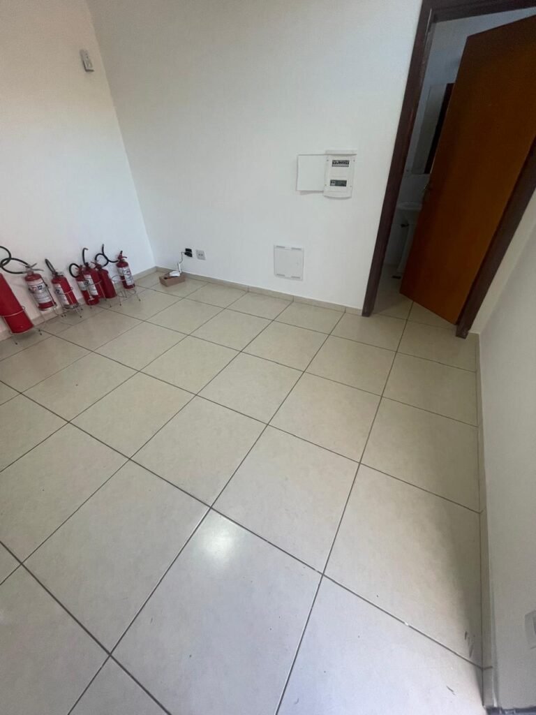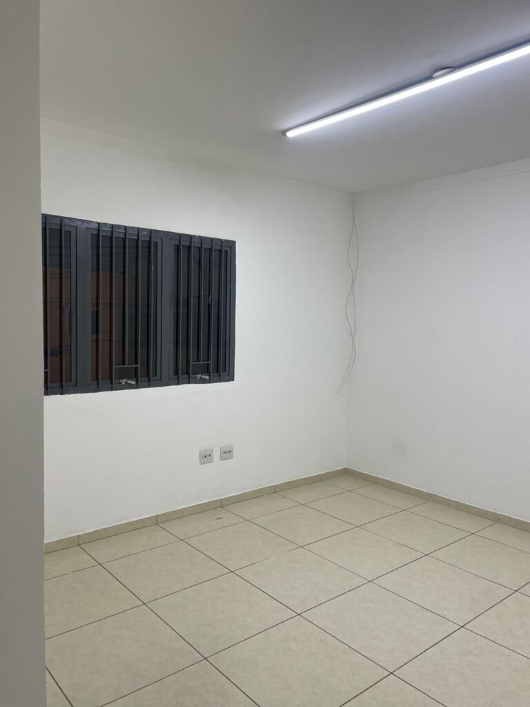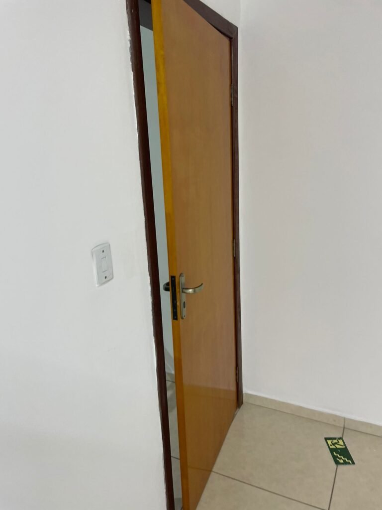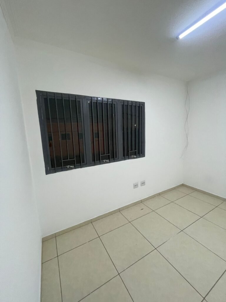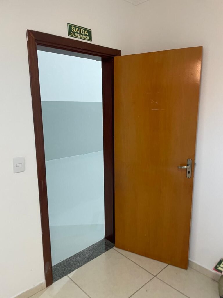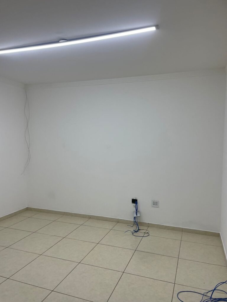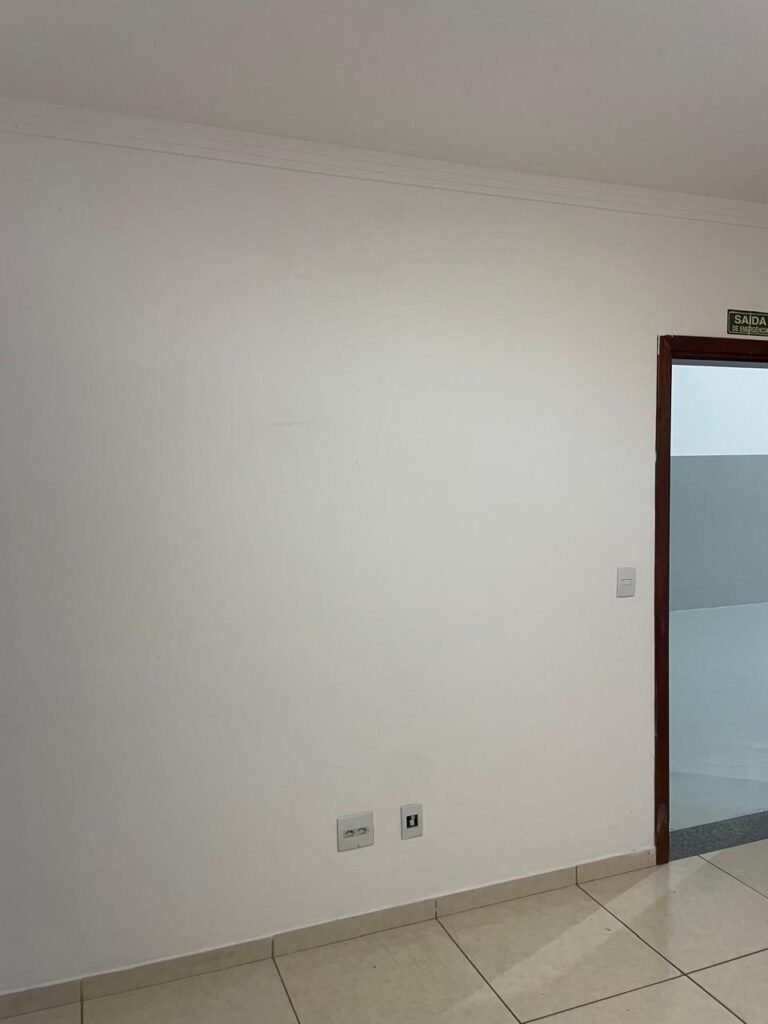 ESCRITÓRIO-: 01 Porta de madeira envernizada em ordem, com maçanetas e fechadura marca Aliança em ordem, pisos e rodapés revestidos de porcelanato na cor creme com manchas e restante em ordem, paredes com pintura nova na cor branco neve em ordem, 07 espelhos de luz, 01 deles sem tampa, 02 com fiação aparente, sendo eles: 01 espelho com 01 interruptor, 02 espelhos com 02 tomadas, 01 espelhos com 06 tomadas, 02 espelhos com 02 entrada para fio de dados. Fiação aparente no canto da parede, 01 pré-instalações de ar condicionado, 03 vitrôs basculantes, com esquadrias de ferro com pintura na cor cinza em ordem, com 01 fechadura em cada em ordem, com grades de ferro de proteção em ordem, com 03 vidros lisos blindex transparente em ordem, gola de gesso com pintura na cor branco neve nova e em ordem, 01 filete de led em ordem, teto com pintura nova na cor branco neve em ordem.