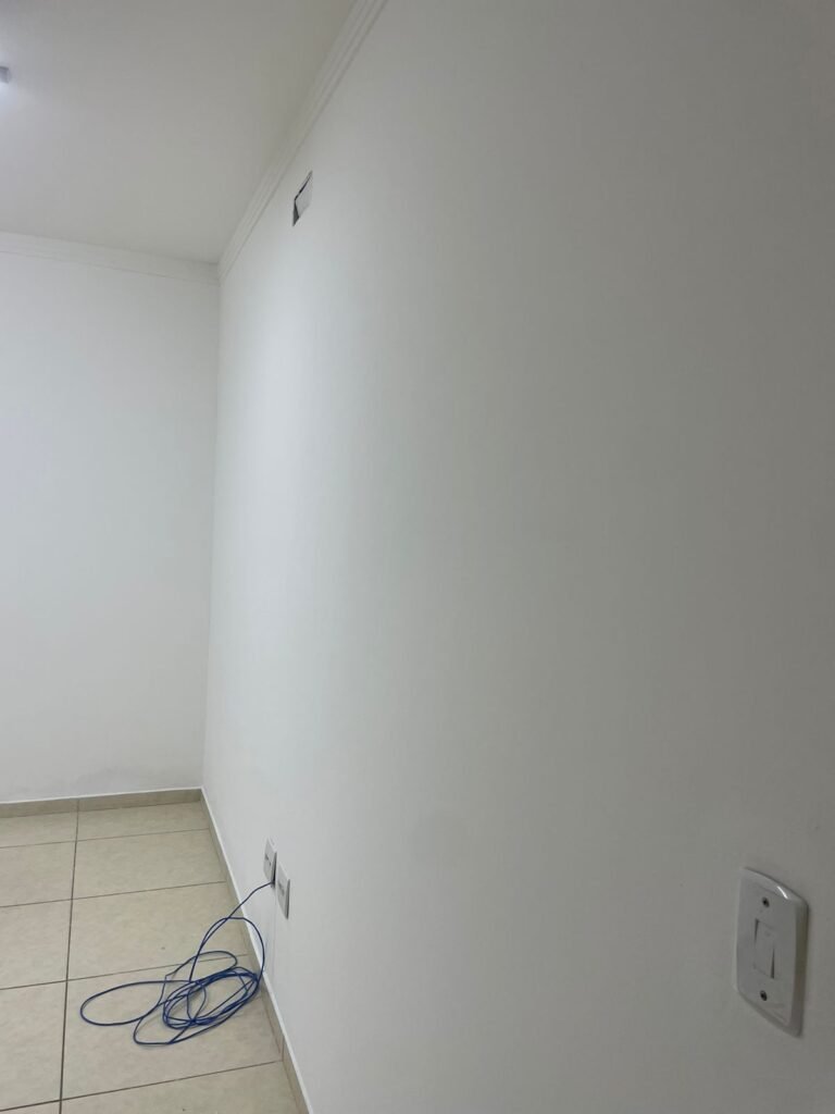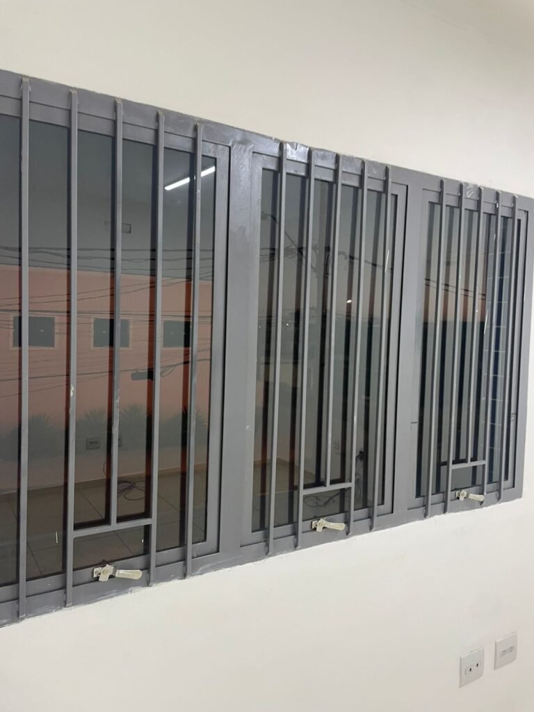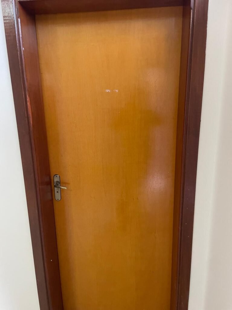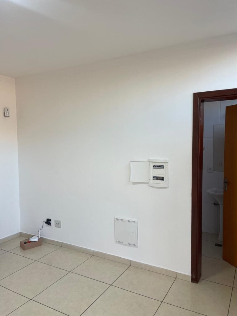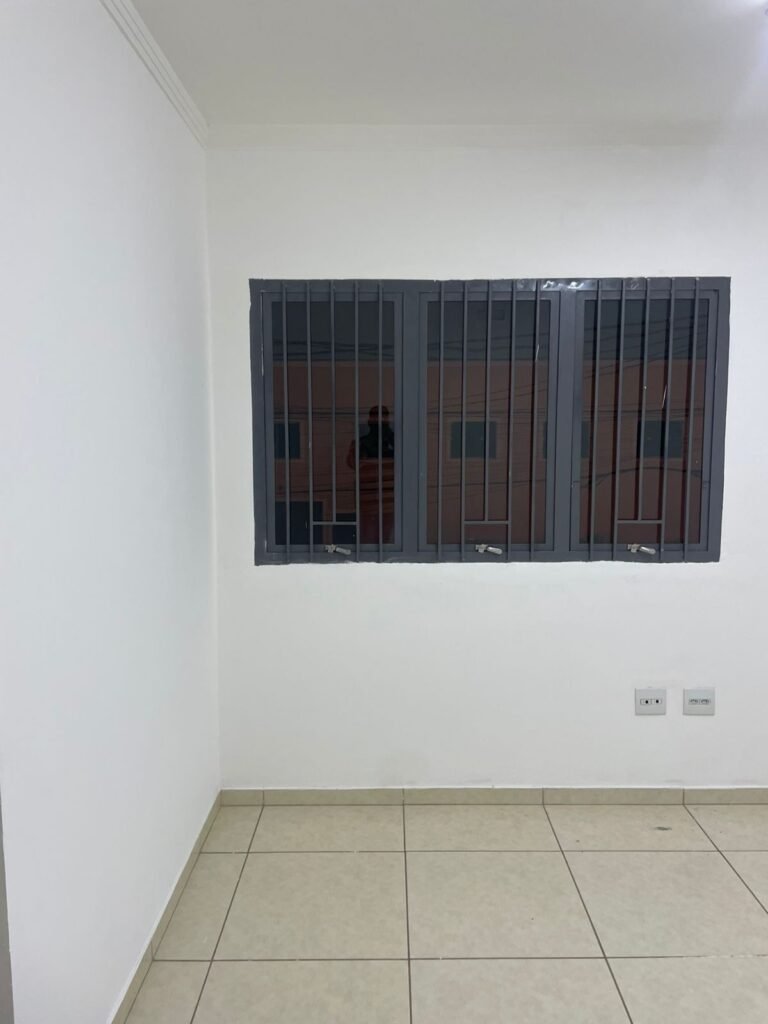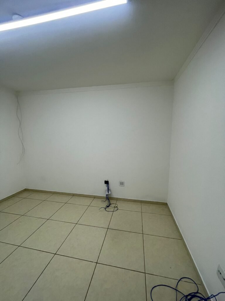 ESCRITÓRIO-: 01 Porta de madeira envernizada em ordem, com maçanetas e fechadura marca Aliança em ordem, pisos e rodapés revestidos de porcelanato na cor creme com manchas e restante em ordem, paredes com pintura nova na cor branco neve em ordem, 07 espelhos de luz, 01 deles sem tampa, 02 com fiação aparente, sendo eles: 01 espelho com 01 interruptor, 02 espelhos com 02 tomadas, 01 espelhos com 06 tomadas, 02 espelhos com 02 entrada para fio de dados. Fiação aparente no canto da parede, 01 pré-instalações de ar condicionado, 03 vitrôs basculantes, com esquadrias de ferro com pintura na cor cinza em ordem, com 01 fechadura em cada em ordem, com grades de ferro de proteção em ordem, com 03 vidros lisos blindex transparente em ordem, gola de gesso com pintura na cor branco neve nova e em ordem, 01 filete de led em ordem, teto com pintura nova na cor branco neve em ordem.