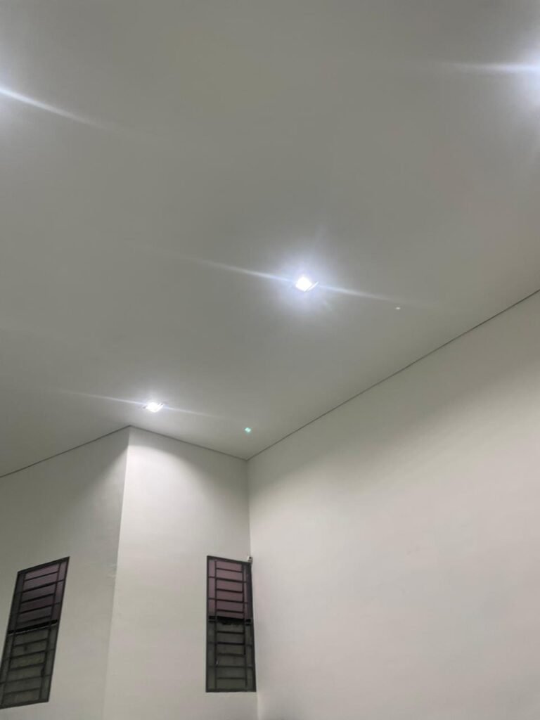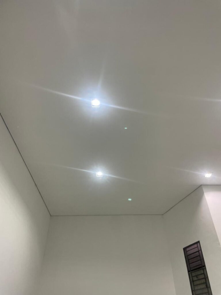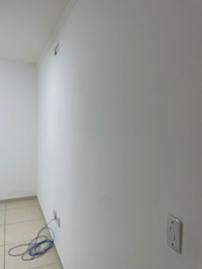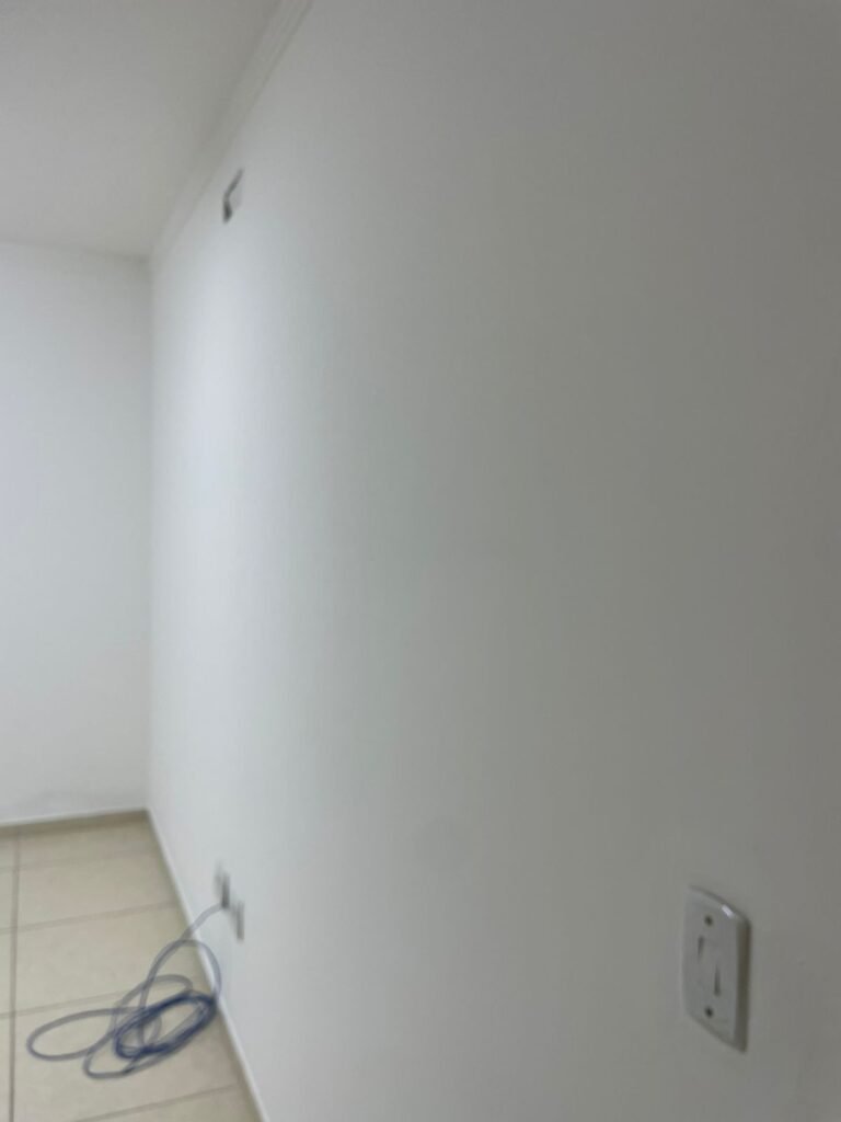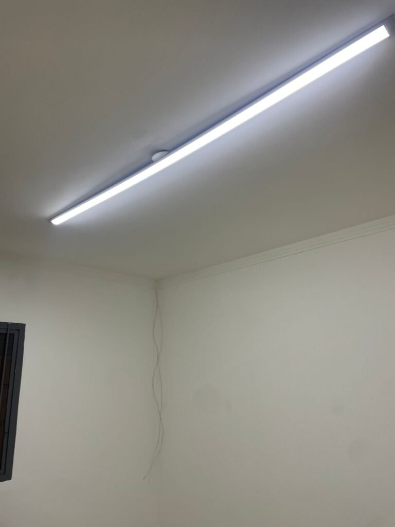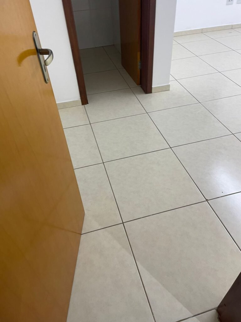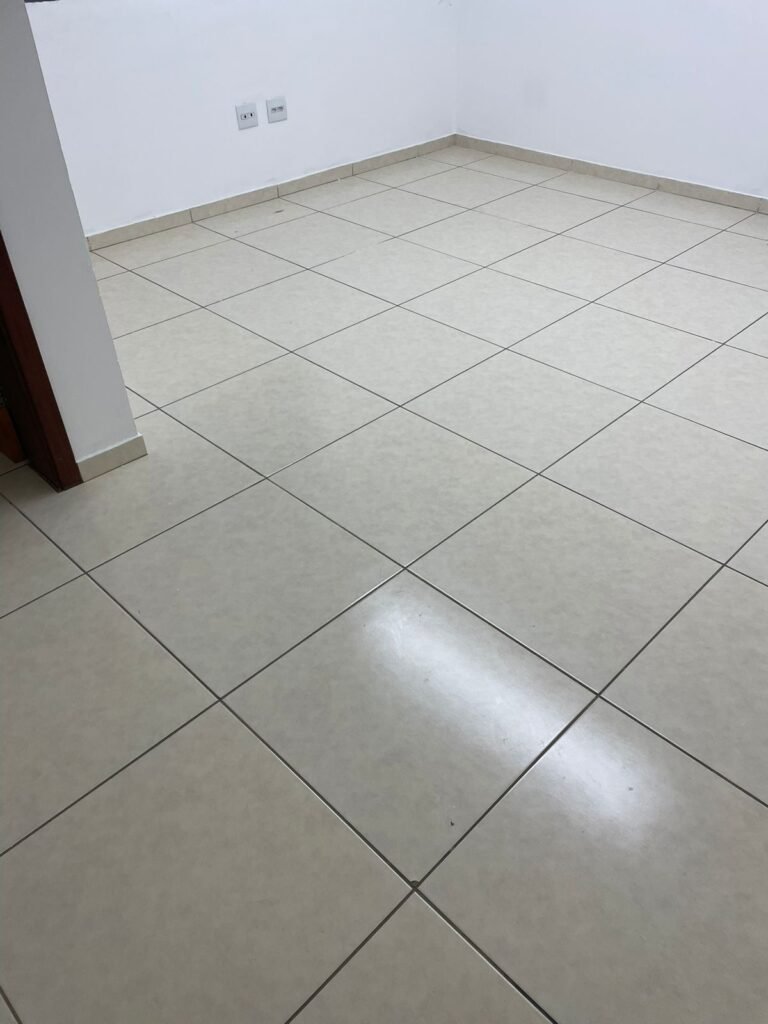 ESCRITÓRIO-: 01 Porta de madeira envernizada em ordem, com maçanetas e fechadura marca Aliança em ordem, pisos e rodapés revestidos de porcelanato na cor creme com manchas e restante em ordem, paredes com pintura nova na cor branco neve em ordem, 07 espelhos de luz, 01 deles sem tampa, 02 com fiação aparente, sendo eles: 01 espelho com 01 interruptor, 02 espelhos com 02 tomadas, 01 espelhos com 06 tomadas, 02 espelhos com 02 entrada para fio de dados. Fiação aparente no canto da parede, 01 pré-instalações de ar condicionado, 03 vitrôs basculantes, com esquadrias de ferro com pintura na cor cinza em ordem, com 01 fechadura em cada em ordem, com grades de ferro de proteção em ordem, com 03 vidros lisos blindex transparente em ordem, gola de gesso com pintura na cor branco neve nova e em ordem, 01 filete de led em ordem, teto com pintura nova na cor branco neve em ordem.