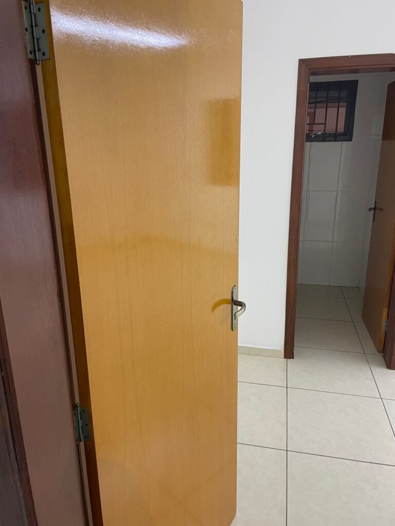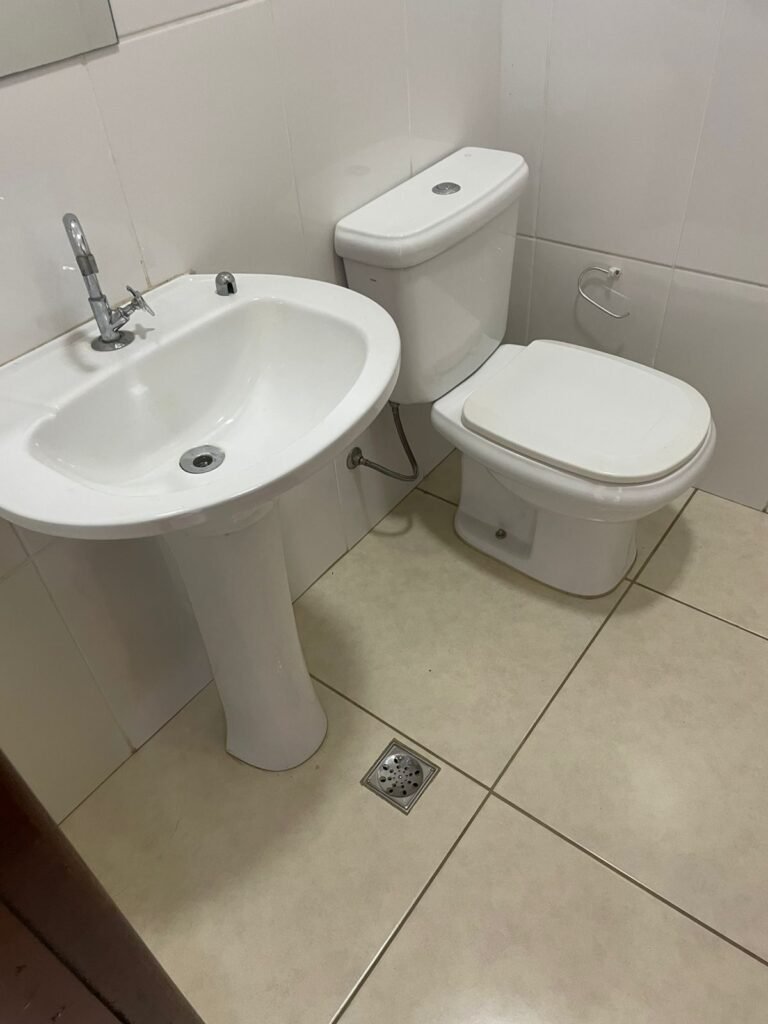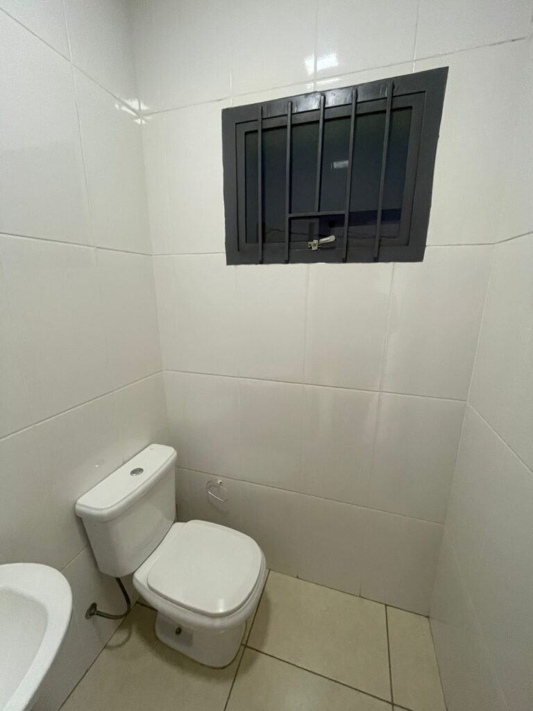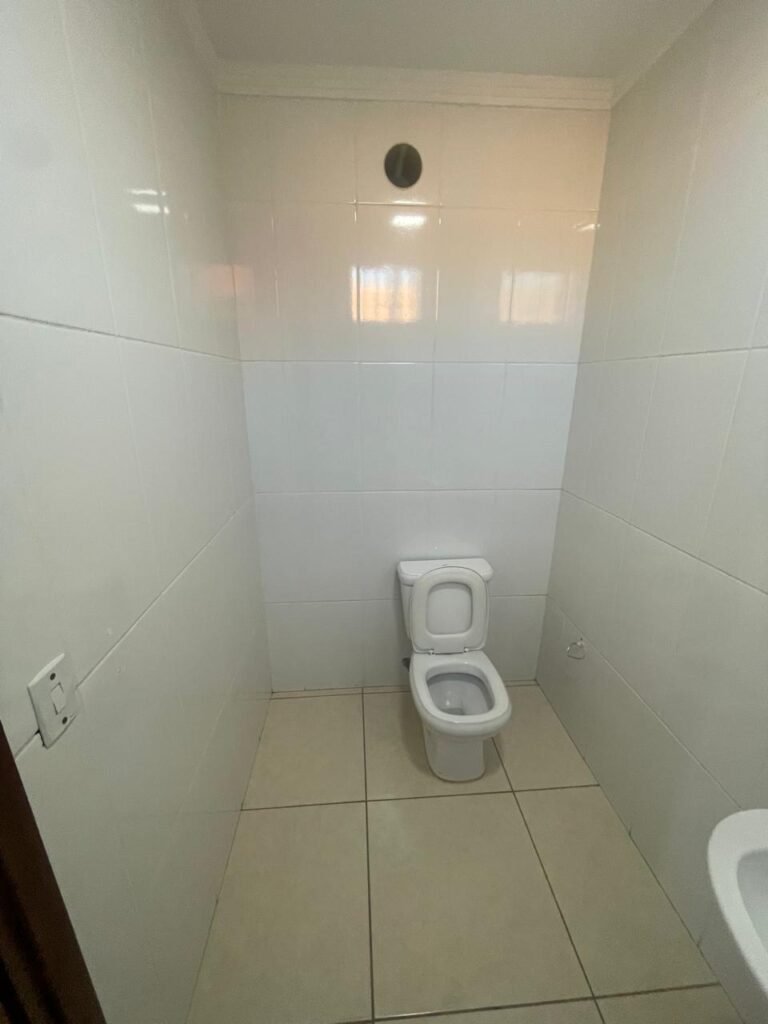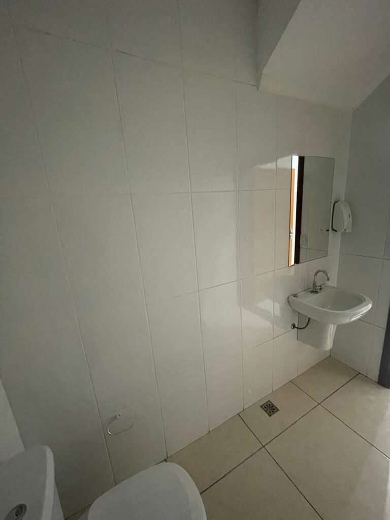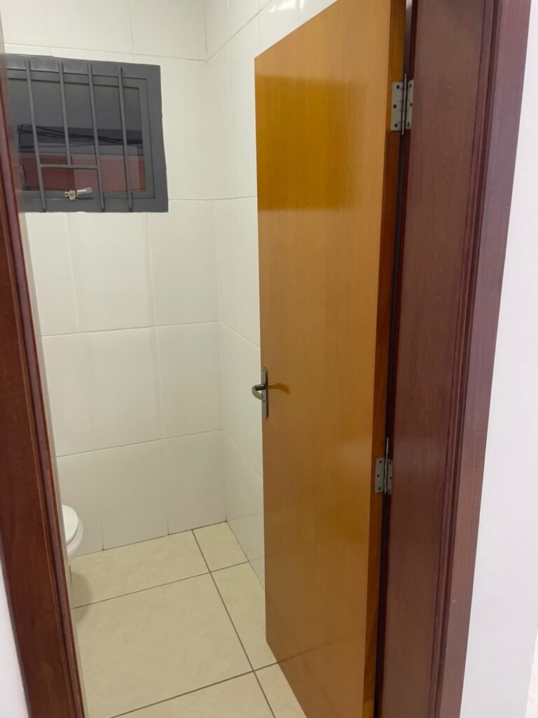 BANHEIRO ESCRITÓRIO-: 01 Porta de madeira envernizada em ordem, com maçanetas e fechadura marca Aliança, com chave embutida em ordem, piso revestido de porcelanato cor creme em ordem, 01 ralo de inox em ordem, 01 conjunto sanitário de cerâmica em ordem, cor branco marca em Icasa, com descarga em ordem, com válvula de descarga de inox embutida em ordem, com tampa e assento em ordem, 01 suporte de papel higiênico em ordem, 01 conjunto lavatório de cerâmica cor branco, marca Icasa em ordem, com 01 torneira de inox em ordem, com 01 sifão sanfonado em ordem, 01 espelho de reflexo em ordem, paredes revestidas de azulejo cor branco em ordem, 01 vitrô basculante com esquadrias de ferro na cor cinza em ordem, com 01 fechadura em ordem, com grades de ferro de proteção em ordem, com 01 vidro liso Blindex transparente em ordem, 01 canopla de registro de inox em ordem, gola de gesso com pintura na cor branco neve nova e em ordem, teto com pintura na cor branco neve nova e em ordem, 01 luminária plafon de sobrepor em ordem.