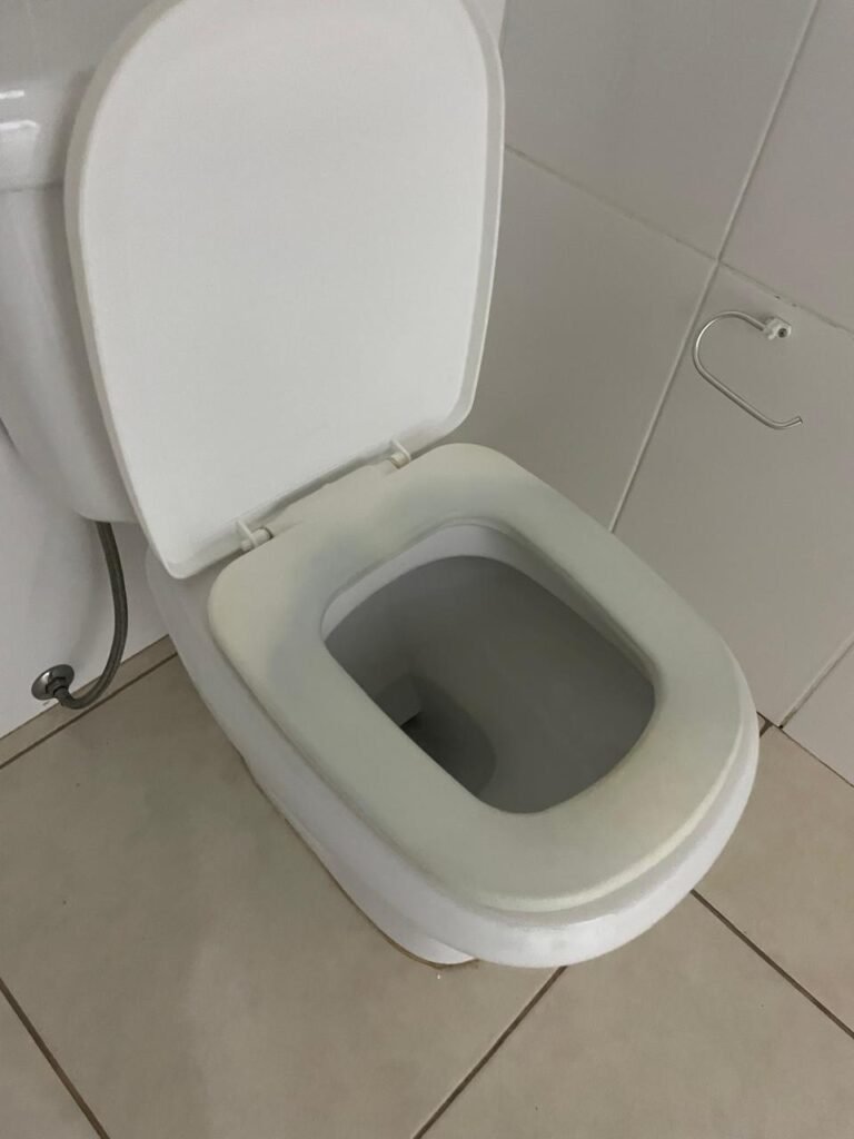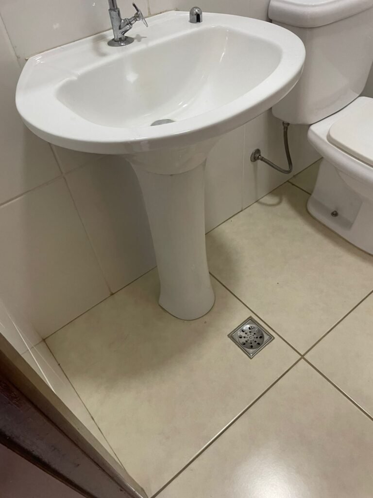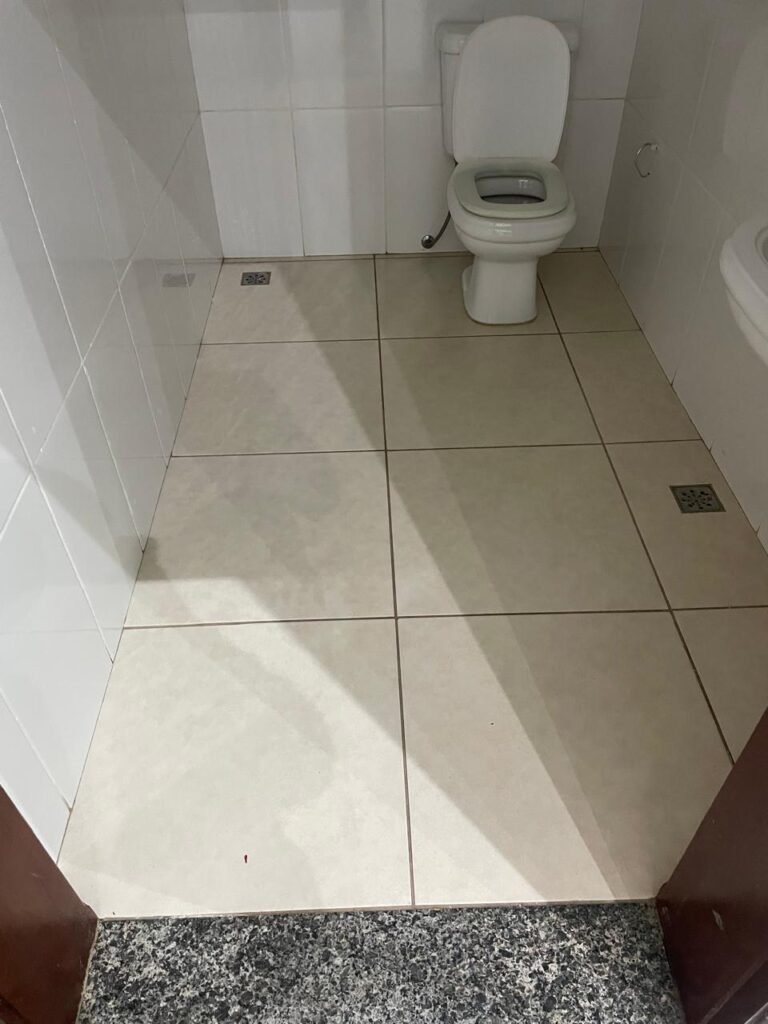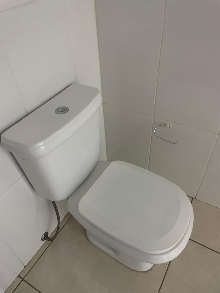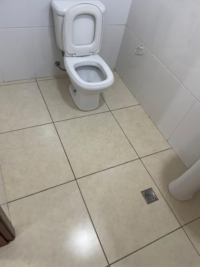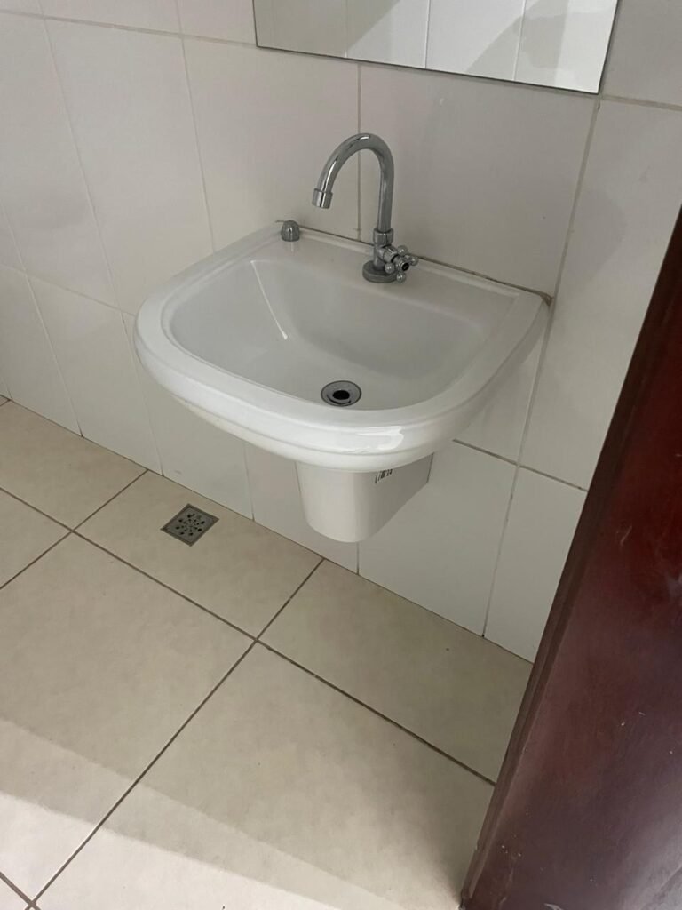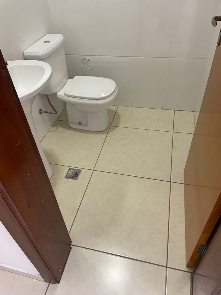 BANHEIRO ESCRITÓRIO-: 01 Porta de madeira envernizada em ordem, com maçanetas e fechadura marca Aliança, com chave embutida em ordem, piso revestido de porcelanato cor creme em ordem, 01 ralo de inox em ordem, 01 conjunto sanitário de cerâmica em ordem, cor branco marca em Icasa, com descarga em ordem, com válvula de descarga de inox embutida em ordem, com tampa e assento em ordem, 01 suporte de papel higiênico em ordem, 01 conjunto lavatório de cerâmica cor branco, marca Icasa em ordem, com 01 torneira de inox em ordem, com 01 sifão sanfonado em ordem, 01 espelho de reflexo em ordem, paredes revestidas de azulejo cor branco em ordem, 01 vitrô basculante com esquadrias de ferro na cor cinza em ordem, com 01 fechadura em ordem, com grades de ferro de proteção em ordem, com 01 vidro liso Blindex transparente em ordem, 01 canopla de registro de inox em ordem, gola de gesso com pintura na cor branco neve nova e em ordem, teto com pintura na cor branco neve nova e em ordem, 01 luminária plafon de sobrepor em ordem.