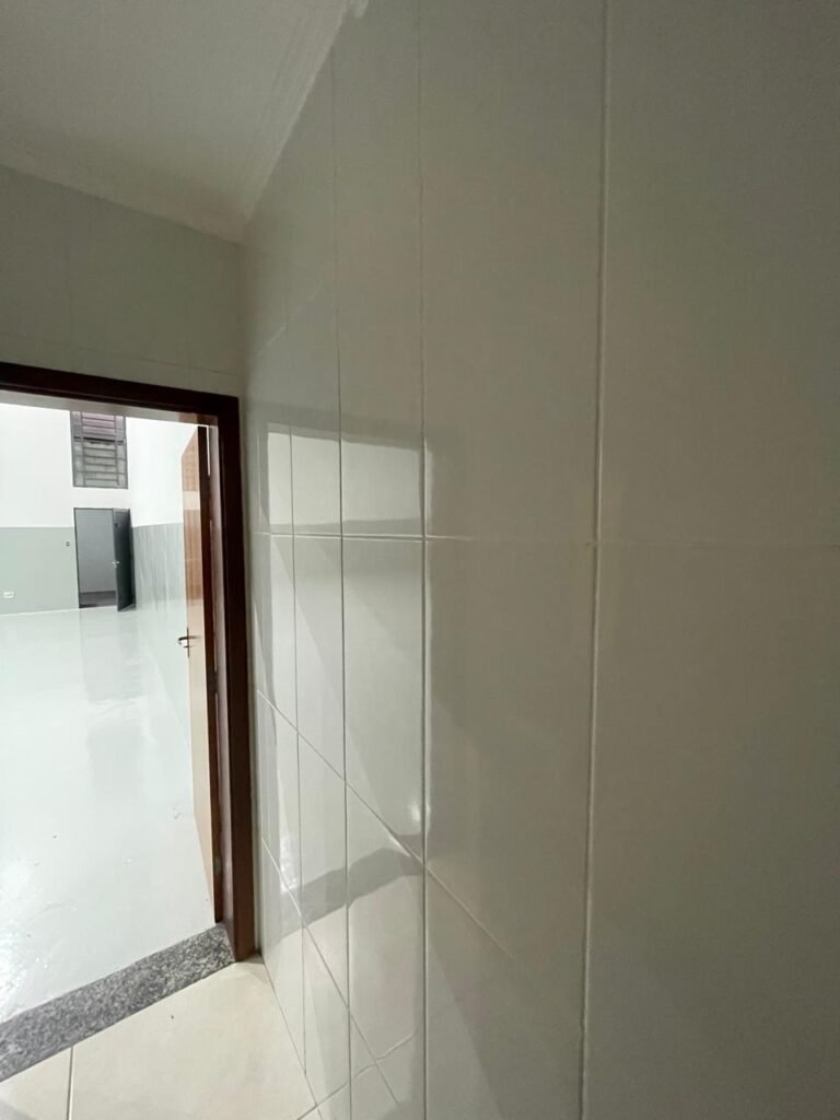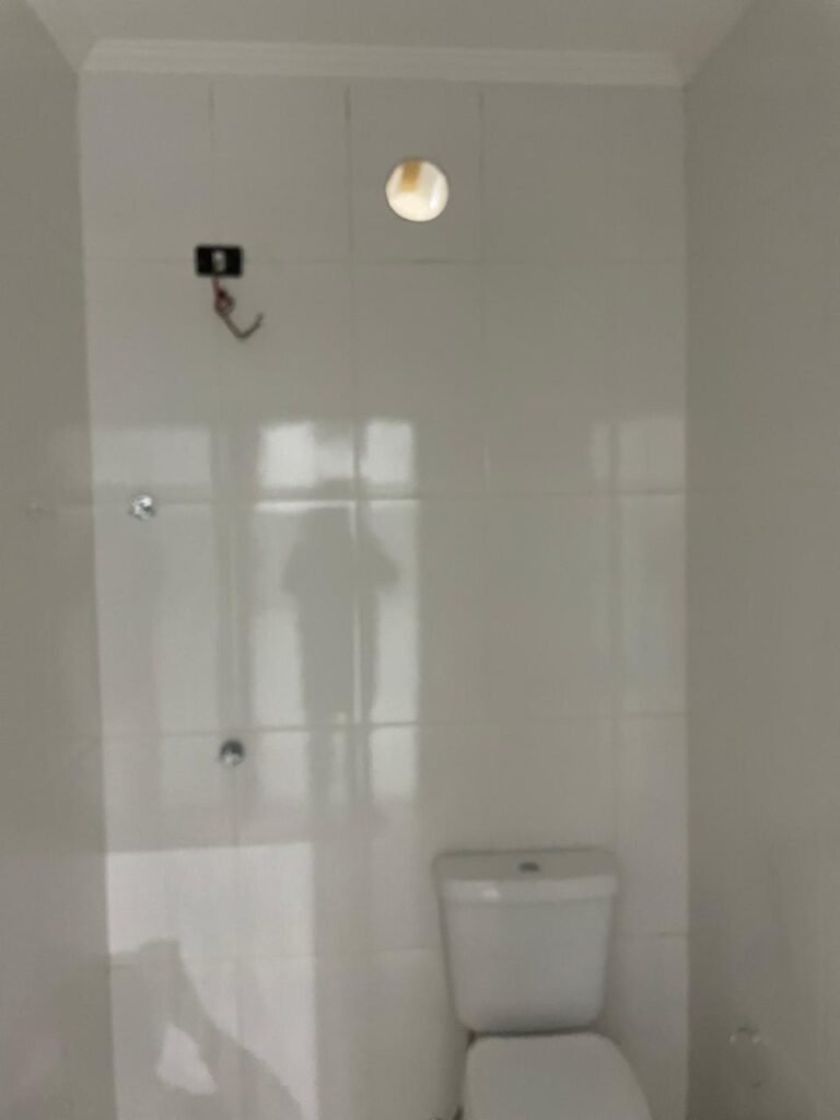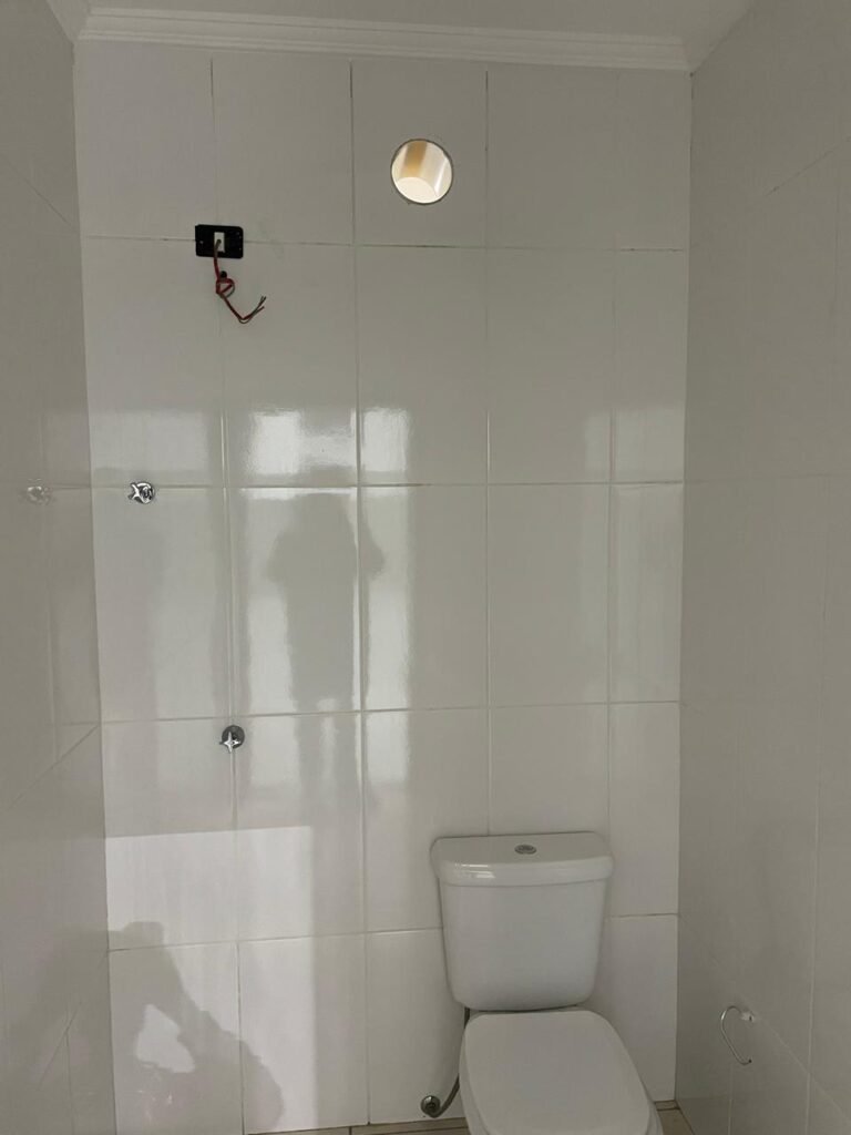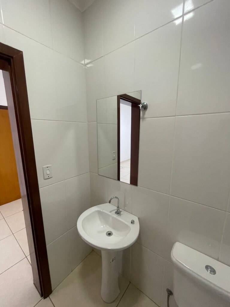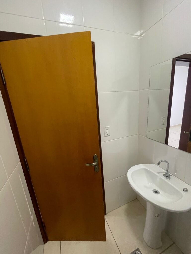 BANHEIRO RECEPÇÃO-: 01 Porta de madeira envernizada em ordem, com maçanetas e fechaduras marca Aliança, em ordem e com 01 chave embutida em ordem, piso revestido de porcelanato na cor creme em ordem, 01 ralo de inox em ordem, paredes revestidas de azulejo na cor branco, com pequenos remendos de furo com bucha e restante em ordem, 02 espelhos de luz sendo eles: 01 com 01 interruptor e 01 com 01 tomada em ordem, 01 suporte de toalha fixo na parede, 01 suporte de papel higiênico com acabamento danificado, 01 conjunto sanitário de cerâmica na cor branco, marca Icasa em ordem, com tampa e assento em ordem, com descarga em ordem, com 01 válvula de descarga em inox embutida em ordem, 01 conjunto lavatório de cerâmica na cor branco, marca Icasa em ordem, com 01 torneira de inox em ordem, com 01 sifão sanfonado em ordem, 01 espelho de reflexo com desgastes naturais, com pequenas manchas e restante em ordem, 01 canopla de registro de inox em ordem, 01 vitrô basculante com esquadrias de ferro com pintura na cor cinza, com pigmentos de ferrugem, com grades de proteção de ferro em ordem, com 01 fechadura em ordem, e com 01 vidro liso Blindex transparente em ordem, golas de gesso com pintura na cor branco neve nova e em ordem, teto com pintura na cor branco neve nova e em ordem, 01 luminária plafon de sobrepor com led em ordem.