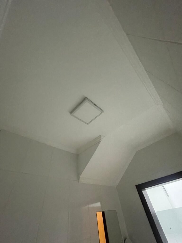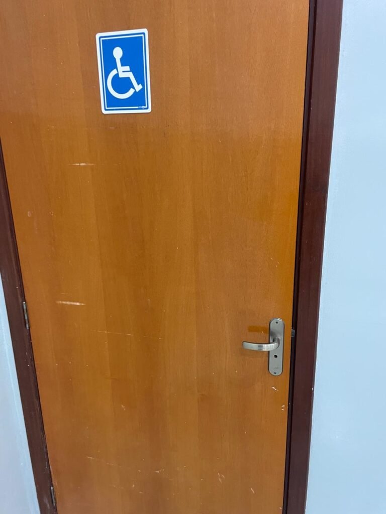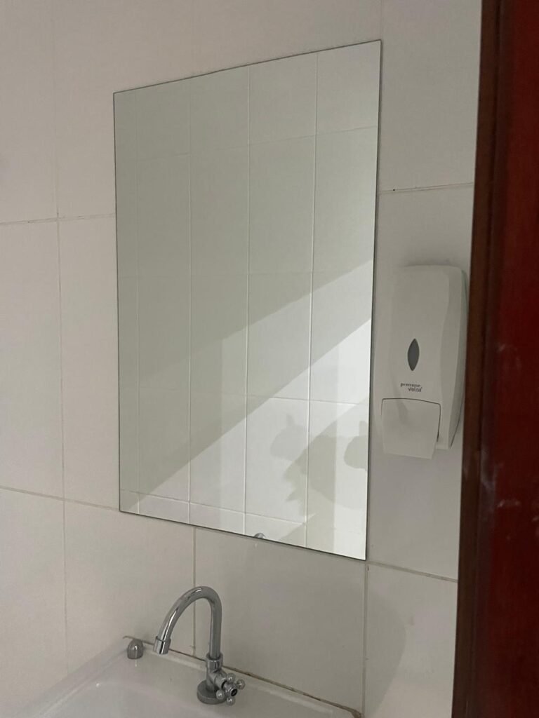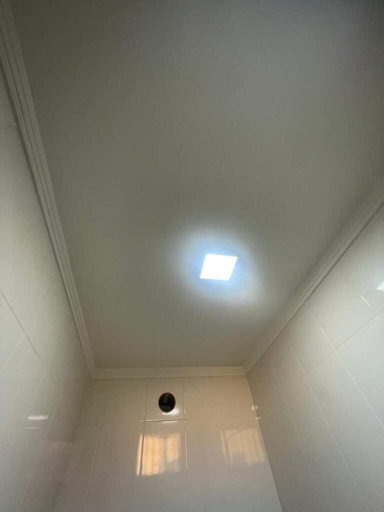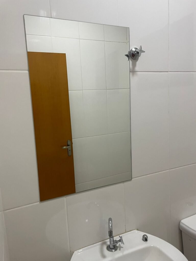 BANHEIRO RECEPÇÃO-: 01 Porta de madeira envernizada em ordem, com maçanetas e fechaduras marca Aliança, em ordem e com 01 chave embutida em ordem, piso revestido de porcelanato na cor creme em ordem, 01 ralo de inox em ordem, paredes revestidas de azulejo na cor branco, com pequenos remendos de furo com bucha e restante em ordem, 02 espelhos de luz sendo eles: 01 com 01 interruptor e 01 com 01 tomada em ordem, 01 suporte de toalha fixo na parede, 01 suporte de papel higiênico com acabamento danificado, 01 conjunto sanitário de cerâmica na cor branco, marca Icasa em ordem, com tampa e assento em ordem, com descarga em ordem, com 01 válvula de descarga em inox embutida em ordem, 01 conjunto lavatório de cerâmica na cor branco, marca Icasa em ordem, com 01 torneira de inox em ordem, com 01 sifão sanfonado em ordem, 01 espelho de reflexo com desgastes naturais, com pequenas manchas e restante em ordem, 01 canopla de registro de inox em ordem, 01 vitrô basculante com esquadrias de ferro com pintura na cor cinza, com pigmentos de ferrugem, com grades de proteção de ferro em ordem, com 01 fechadura em ordem, e com 01 vidro liso Blindex transparente em ordem, golas de gesso com pintura na cor branco neve nova e em ordem, teto com pintura na cor branco neve nova e em ordem, 01 luminária plafon de sobrepor com led em ordem.