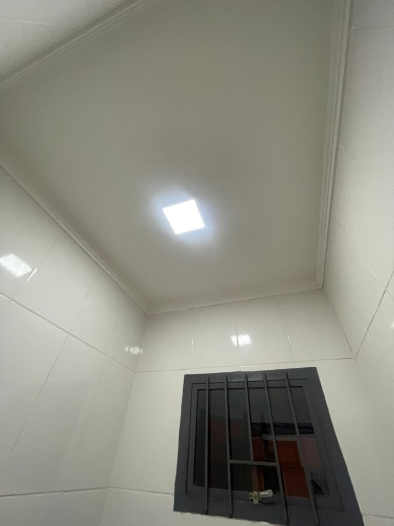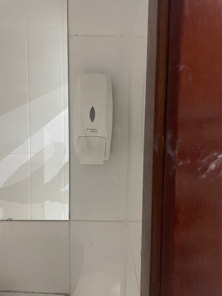 BANHEIRO BARRACÃO-: 01 Porta de madeira envernizada em ordem, com maçanetas e fechadura marca Aliança, em ordem e com chave embutida em ordem, 01 soleira de granito cinza ocre em ordem, piso revestidos de piso de porcelanato na cor creme em ordem, 02 ralos de inox em ordem, paredes revestidas de azulejo na cor branco em ordem, 01 espelho de luz com 01 interruptor, 01 suporte de sabonete líquido marca Premisse Velox em ordem, 01 espelho de reflexo em ordem, 01 conjunto lavatório de cerâmica na cor branco, marca Icasa em ordem, com 01 torneira de inox em ordem, com 01 sifão embutido em ordem, 01 suporte de papel higiênico em ordem, 01 conjunto sanitário de cerâmica cor branco, marca Icasa em ordem, com descarga em ordem, com válvula de descarga de inox embutido em ordem, com tampa e assento em ordem, 02 canoplas de inox em ordem, 01 espelho de luz com fiação aparente, gola de gesso com pintura na cor branco neve em ordem, teto com pintura na cor branco neve em ordem, 01 luminária paflon de sobrepor com led danificado.