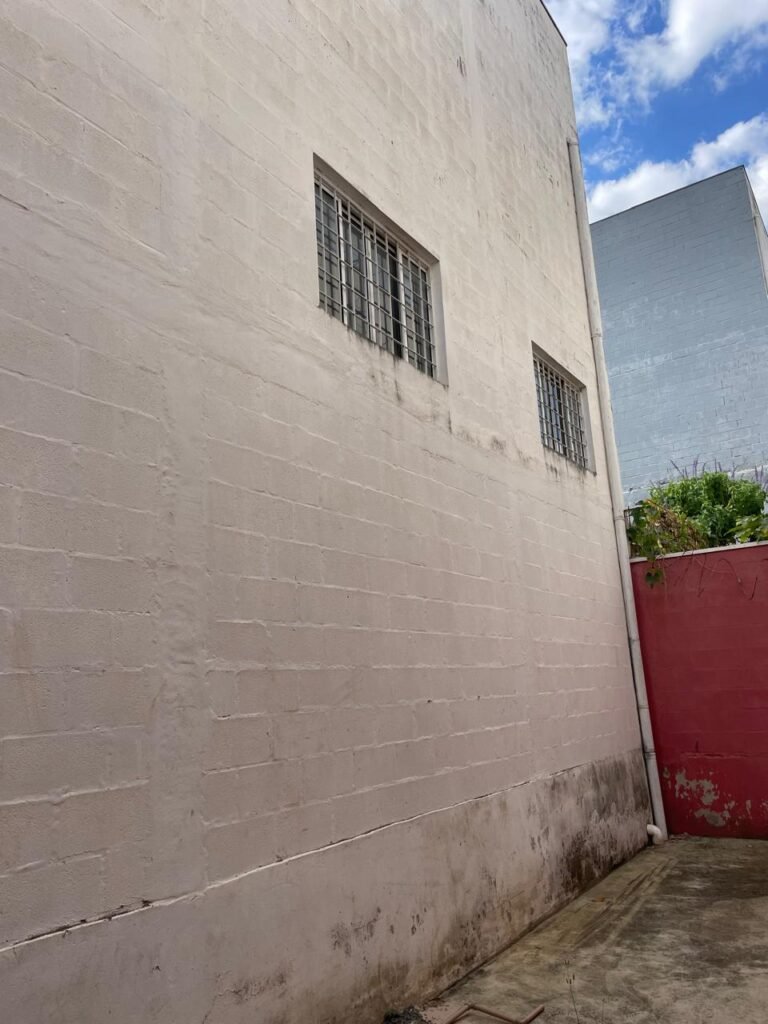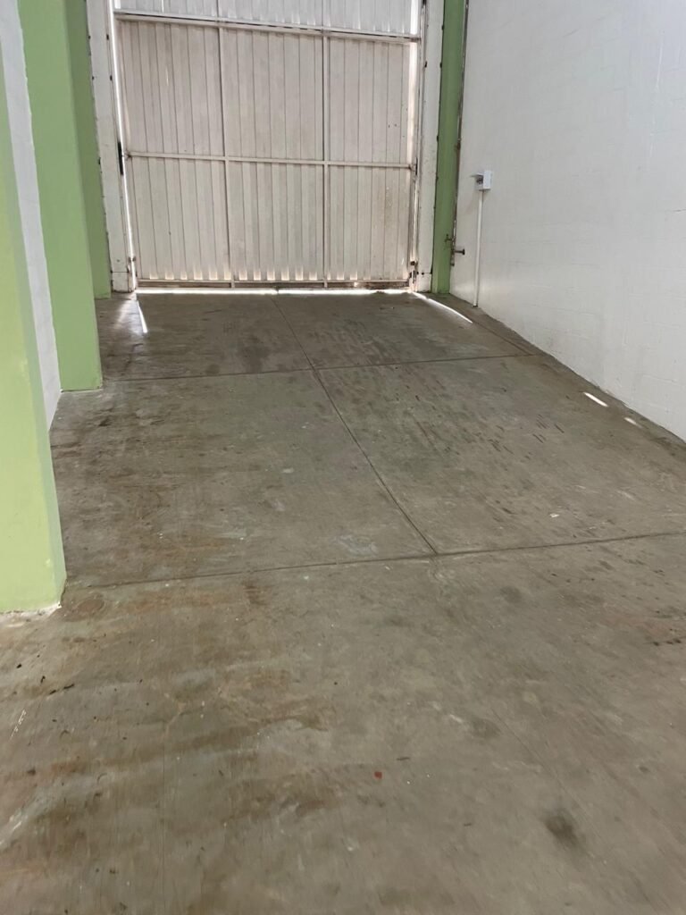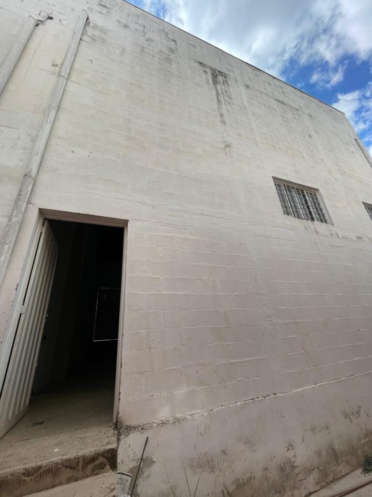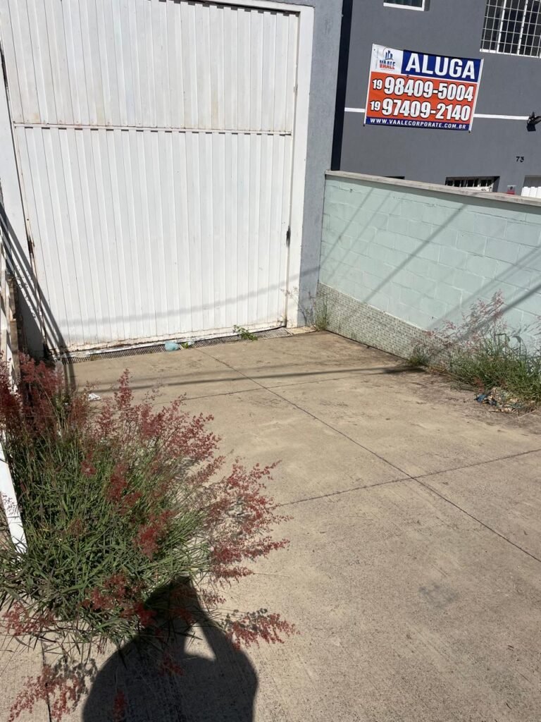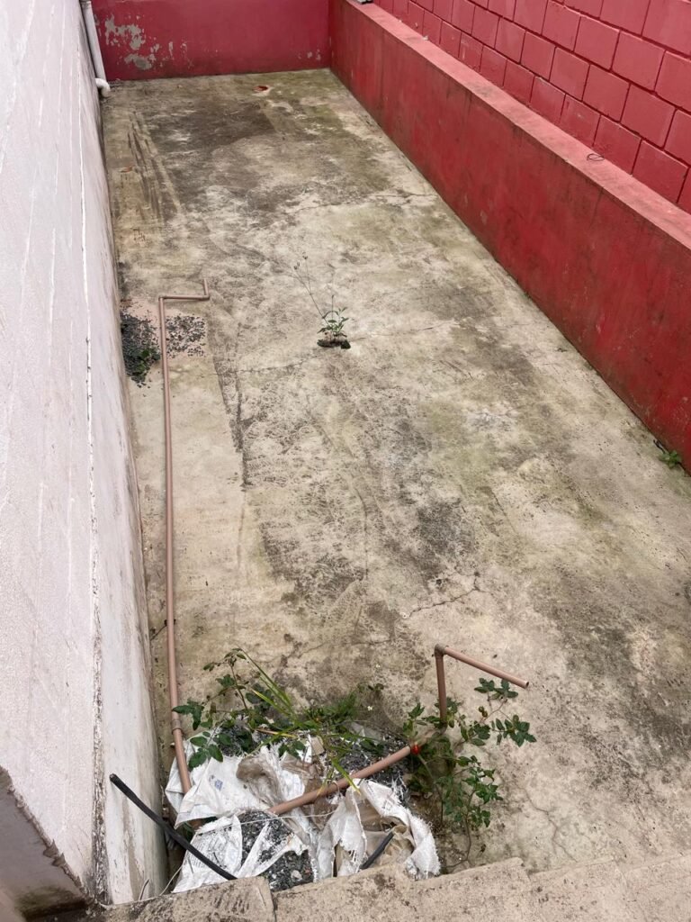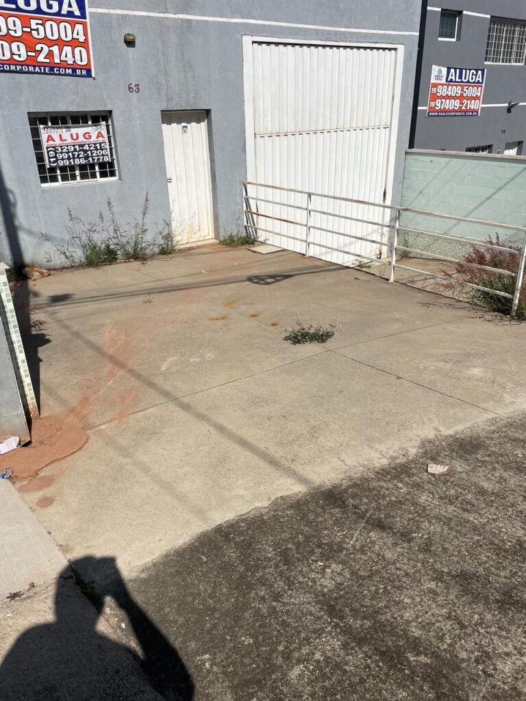 FUNDOS-: Escada de alvenaria em ordem, piso de concreto desempenado com desgastes naturais, com manchas, rachaduras pela extensão, vegetação aparente pela extensão, alguns buracos e restante em ordem, 01 ralo grelha de ferro com pigmentos de ferrugem e restante em ordem, parede do barracão com pintura na cor branco com desgastes naturais, descasques e manchas pela extensão, muros e paredes do fundo em blocos de concreto com pintura na cor vermelho com desgastes naturais, descasques, manchas e buracos pela extensão, rufus com pintura na cor branco com desgastes naturais e restante em ordem.