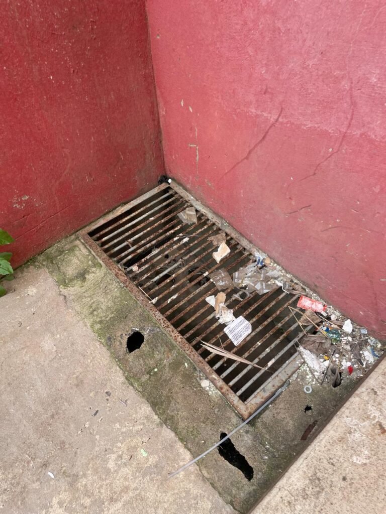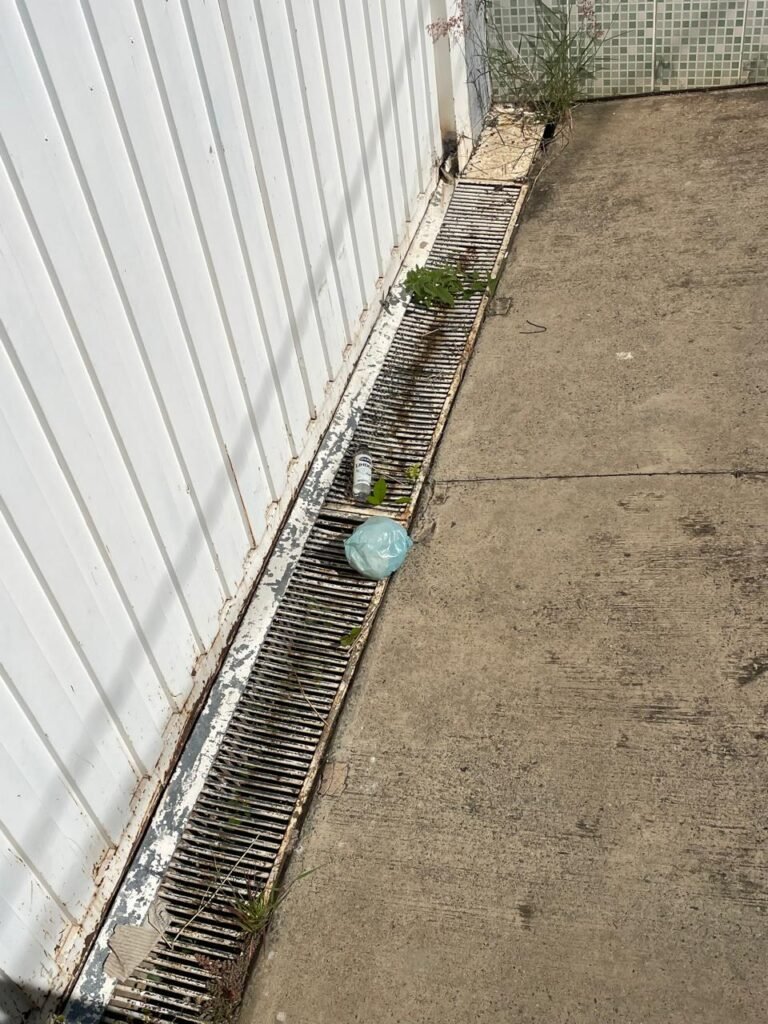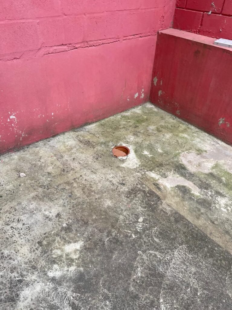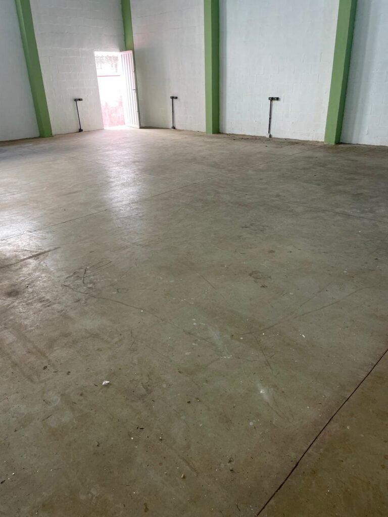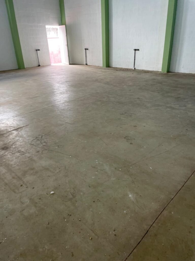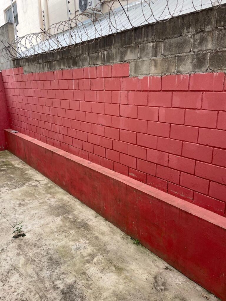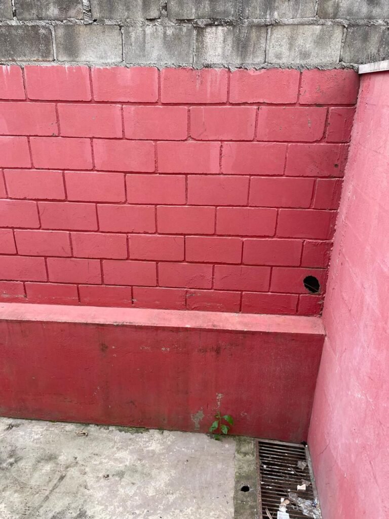 FUNDOS-: Escada de alvenaria em ordem, piso de concreto desempenado com desgastes naturais, com manchas, rachaduras pela extensão, vegetação aparente pela extensão, alguns buracos e restante em ordem, 01 ralo grelha de ferro com pigmentos de ferrugem e restante em ordem, parede do barracão com pintura na cor branco com desgastes naturais, descasques e manchas pela extensão, muros e paredes do fundo em blocos de concreto com pintura na cor vermelho com desgastes naturais, descasques, manchas e buracos pela extensão, rufus com pintura na cor branco com desgastes naturais e restante em ordem.