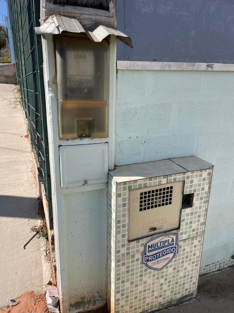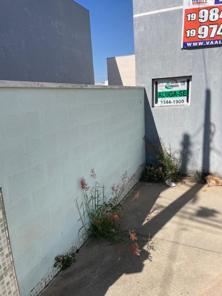 FACHADA-: Calçada de concreto desempenado com desgastes naturais, vegetação para aparar e restante em ordem, muros laterais em blocos de concreto com pintura na cor verde água com desgastes naturais, descasques, parte trincada e restante em ordem, rufos em ordem, com pintura na cor branco com desgastes naturais, rodapés dos muros laterais revestidos de pastilhas de cerâmica na cor verde com desgastes naturais, partes trincadas e restante em ordem, 01 guarda corpo de ferro com pintura na cor branco com desgastes naturais, pigmentos de ferrugem e restante em ordem, 01 cavalete padrão Sanasa, revestido de pastilhas de cerâmica na cor verde com desgastes naturais, tampa de proteção e lacre padrão Sanasa em ordem, 01 canopla de registro em ordem, 01 hidrômetro padrão Sanasa em ordem, 01 poste padrão Concrefer, com tampa de proteção em ordem, com cobertura de telha galvanizada em ordem, 01 medidor elétrico padrão CPFL em ordem, paredes do barracão com granfino, com pintura na cor cinza com desgastes naturais, com pequenas manchas e restante em ordem, dígitos de ferro “6-3” com o desgastes naturais e restante em ordem, 01 luminária modelo tartaruga com LED danificado, 01 condensador marca Gree não testado.