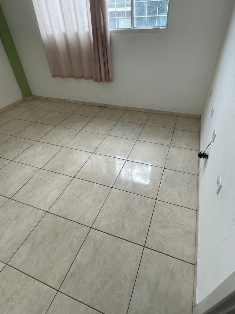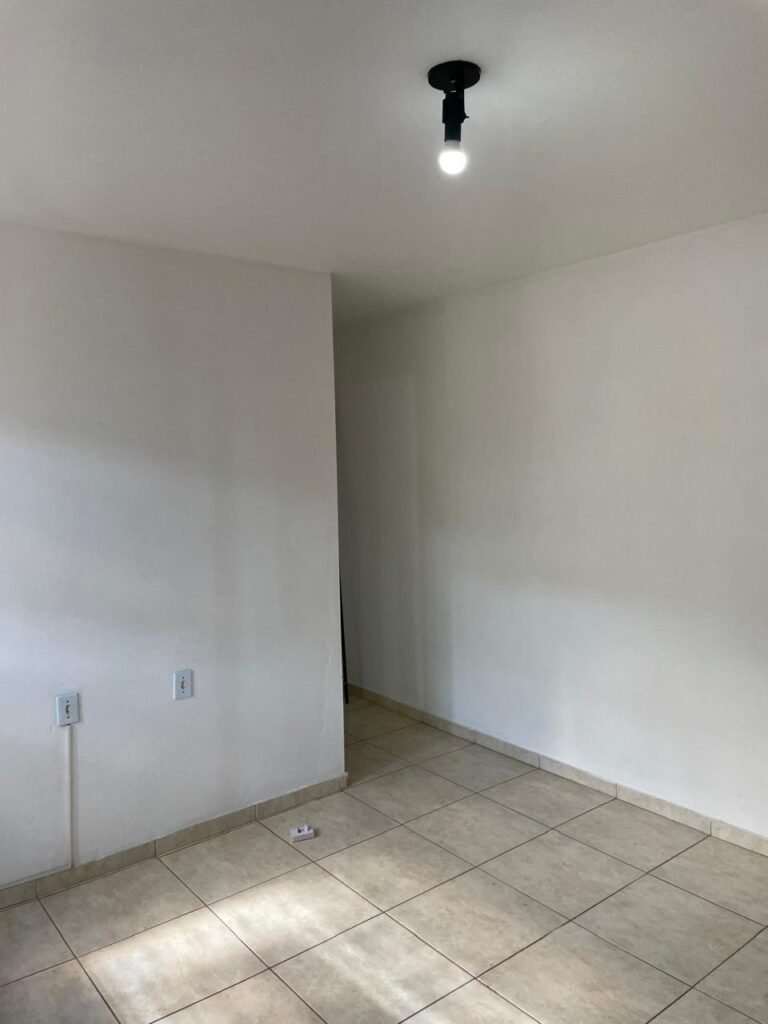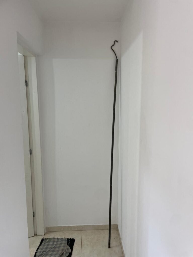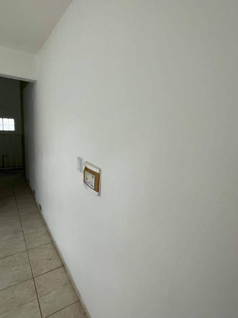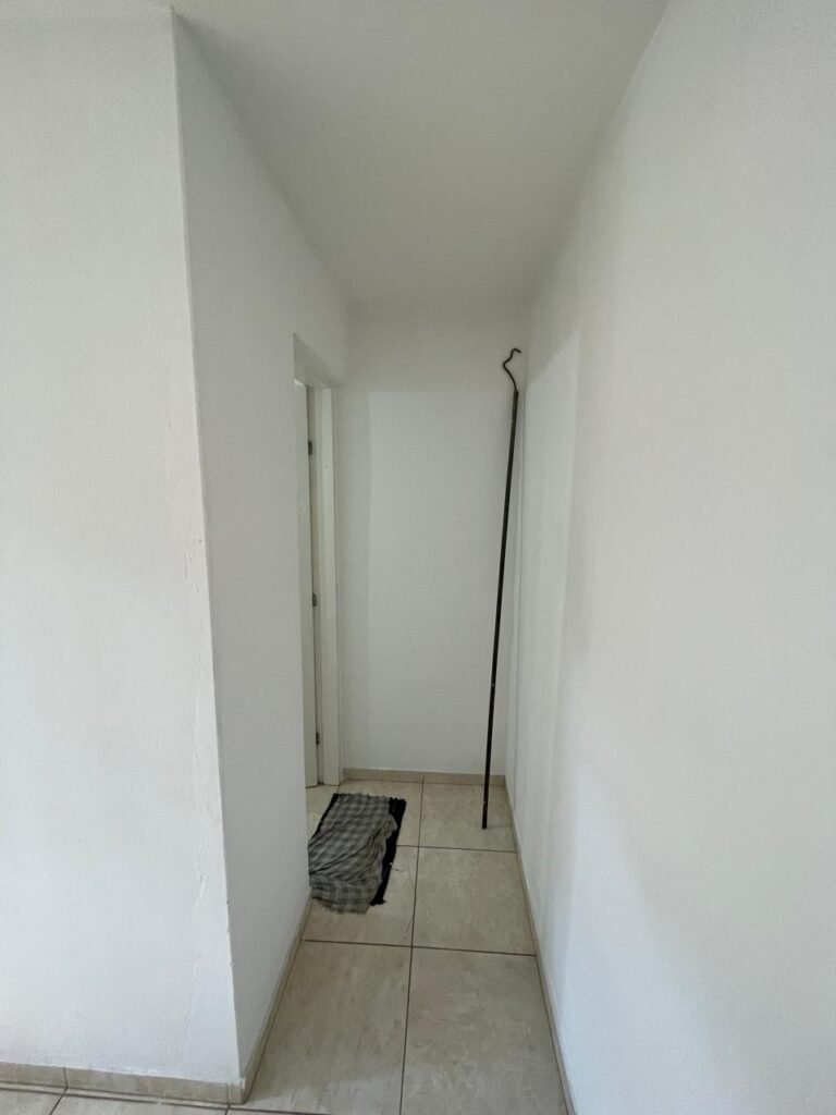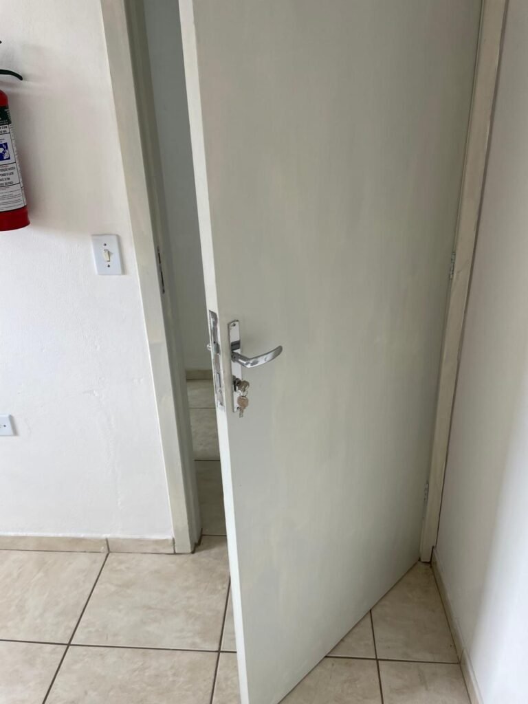 RECEPÇÃO-:01 porta social de metalon, com pintura na cor branco com desgastes naturais e com pigmentos de ferrugem, com 01 maçaneta em inox em ordem, 01 fechadura Lmab com chave e em ordem, 02 fechaduras tetras, marca Stam e ambas com chaves em ordem, 01 interruptor de campainha não testado, pisos e rodapés revestidos de piso frio cerâmico com desgastes naturais e restante em ordem, paredes e teto com pintura na cor branco neve nova e em ordem, 01 janela deslizante, com fechadura em ordem, com 01 trinco para cadeado em ordem, com 04 folhas de vidro liso Blindex em ordem e com gradil de ferro de proteção em ordem, janela com pintura na cor branco em ordem, 04 tomadas, 06 interruptores, 02 entradas para fio de dados e 01 espelho cego (ambos com espelhos de luz em ordem). 01 quadro de distribuição de disjuntores marca Tigre, com tampa danificada, disjuntores sendo: 01 SD C32 2P, 04 SD C20 1P (Todos marca Steck) e 01 G30SL C20 2 P (Marca do H). 01 extintor de incêndio de pó químico bc 4kg 20-B:C com próx manutenção para 2028, 01 bocal com 01 lâmpada LED em ordem, 01 ferro de suporte para abertura de portão em ordem.