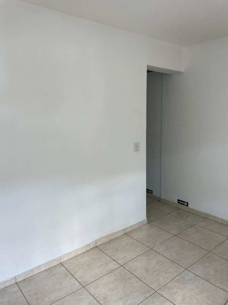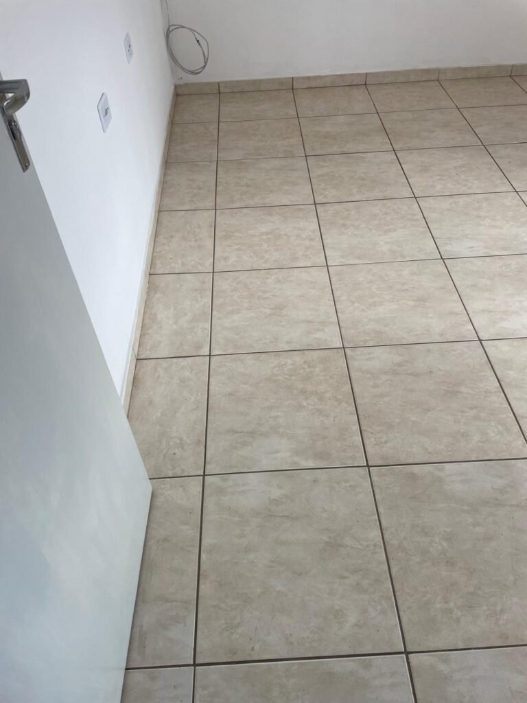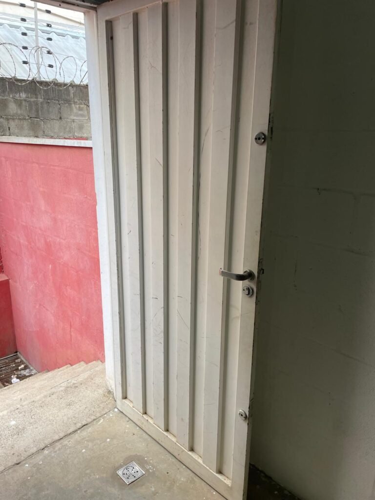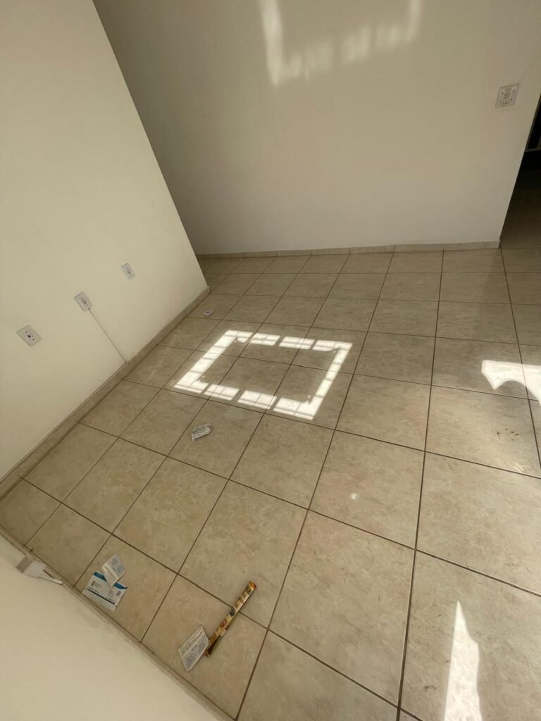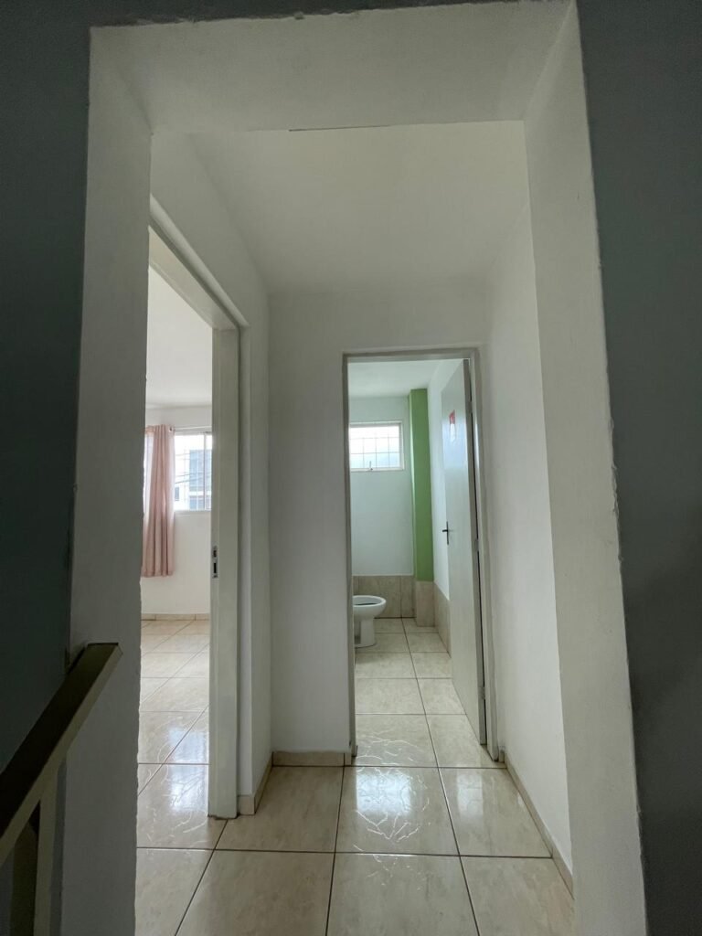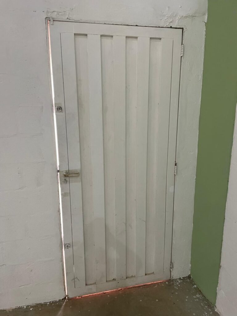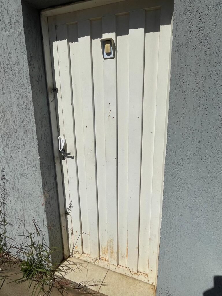 RECEPÇÃO-:01 porta social de metalon, com pintura na cor branco com desgastes naturais e com pigmentos de ferrugem, com 01 maçaneta em inox em ordem, 01 fechadura Lmab com chave e em ordem, 02 fechaduras tetras, marca Stam e ambas com chaves em ordem, 01 interruptor de campainha não testado, pisos e rodapés revestidos de piso frio cerâmico com desgastes naturais e restante em ordem, paredes e teto com pintura na cor branco neve nova e em ordem, 01 janela deslizante, com fechadura em ordem, com 01 trinco para cadeado em ordem, com 04 folhas de vidro liso Blindex em ordem e com gradil de ferro de proteção em ordem, janela com pintura na cor branco em ordem, 04 tomadas, 06 interruptores, 02 entradas para fio de dados e 01 espelho cego (ambos com espelhos de luz em ordem). 01 quadro de distribuição de disjuntores marca Tigre, com tampa danificada, disjuntores sendo: 01 SD C32 2P, 04 SD C20 1P (Todos marca Steck) e 01 G30SL C20 2 P (Marca do H). 01 extintor de incêndio de pó químico bc 4kg 20-B:C com próx manutenção para 2028, 01 bocal com 01 lâmpada LED em ordem, 01 ferro de suporte para abertura de portão em ordem.