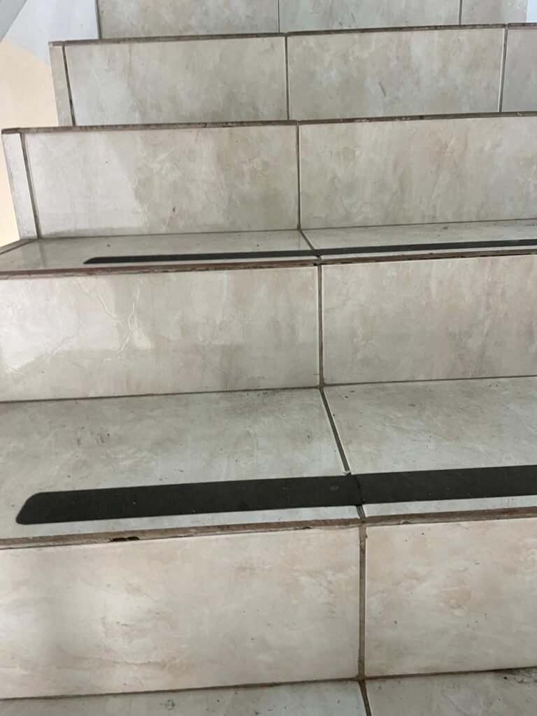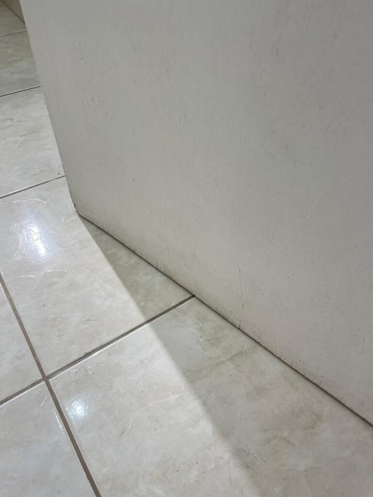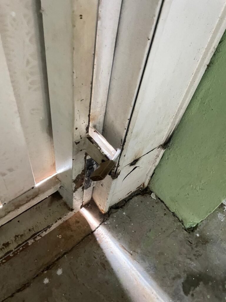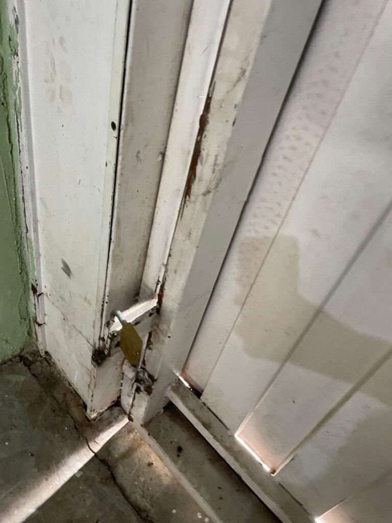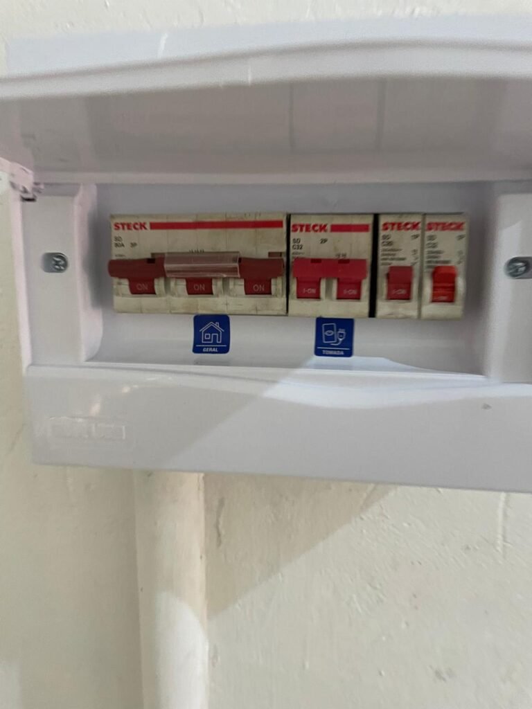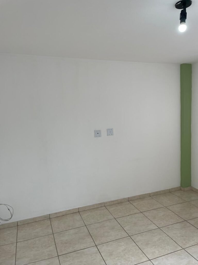 RECEPÇÃO-:01 porta social de metalon, com pintura na cor branco com desgastes naturais e com pigmentos de ferrugem, com 01 maçaneta em inox em ordem, 01 fechadura Lmab com chave e em ordem, 02 fechaduras tetras, marca Stam e ambas com chaves em ordem, 01 interruptor de campainha não testado, pisos e rodapés revestidos de piso frio cerâmico com desgastes naturais e restante em ordem, paredes e teto com pintura na cor branco neve nova e em ordem, 01 janela deslizante, com fechadura em ordem, com 01 trinco para cadeado em ordem, com 04 folhas de vidro liso Blindex em ordem e com gradil de ferro de proteção em ordem, janela com pintura na cor branco em ordem, 04 tomadas, 06 interruptores, 02 entradas para fio de dados e 01 espelho cego (ambos com espelhos de luz em ordem). 01 quadro de distribuição de disjuntores marca Tigre, com tampa danificada, disjuntores sendo: 01 SD C32 2P, 04 SD C20 1P (Todos marca Steck) e 01 G30SL C20 2 P (Marca do H). 01 extintor de incêndio de pó químico bc 4kg 20-B:C com próx manutenção para 2028, 01 bocal com 01 lâmpada LED em ordem, 01 ferro de suporte para abertura de portão em ordem.