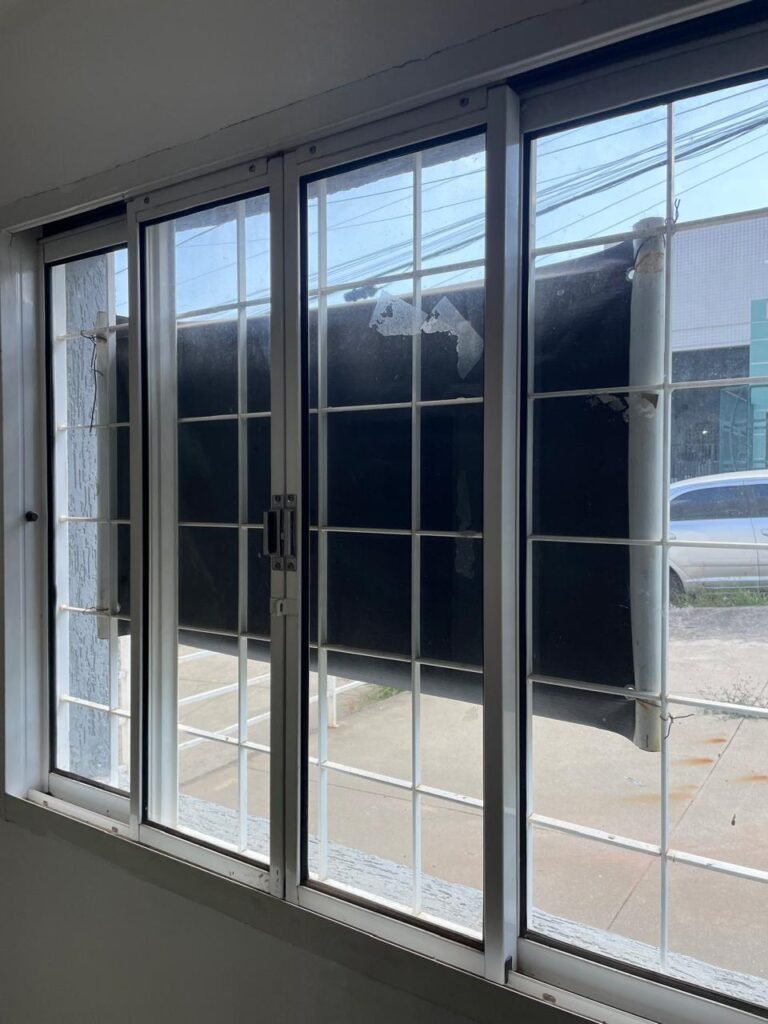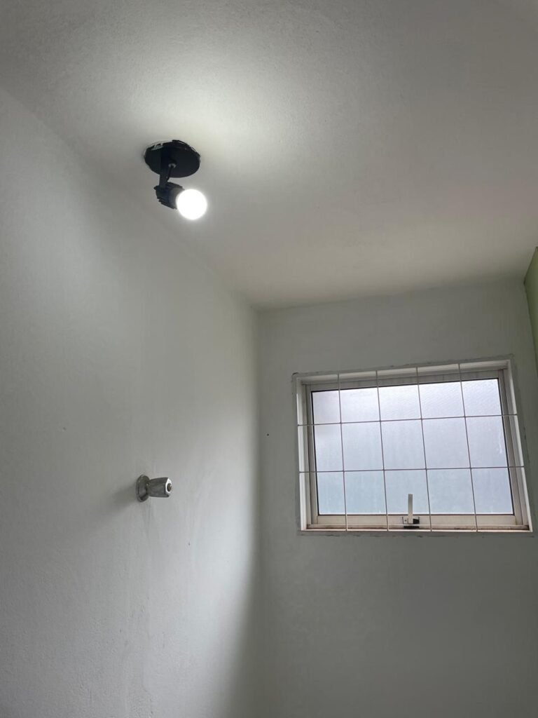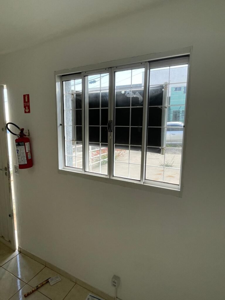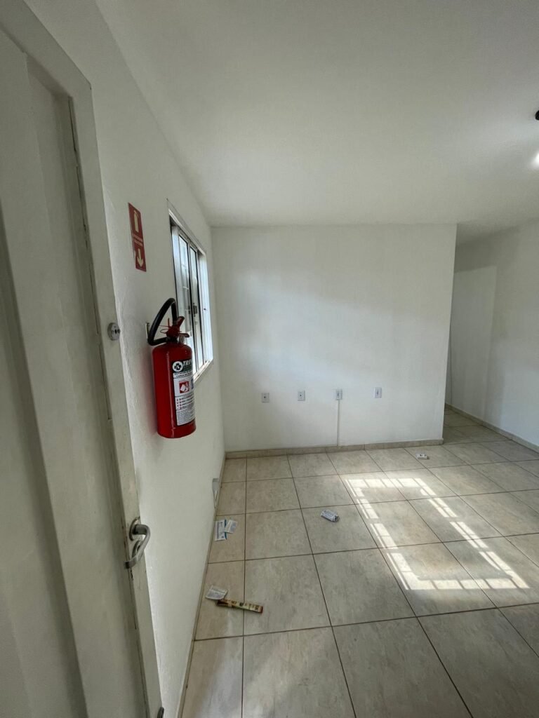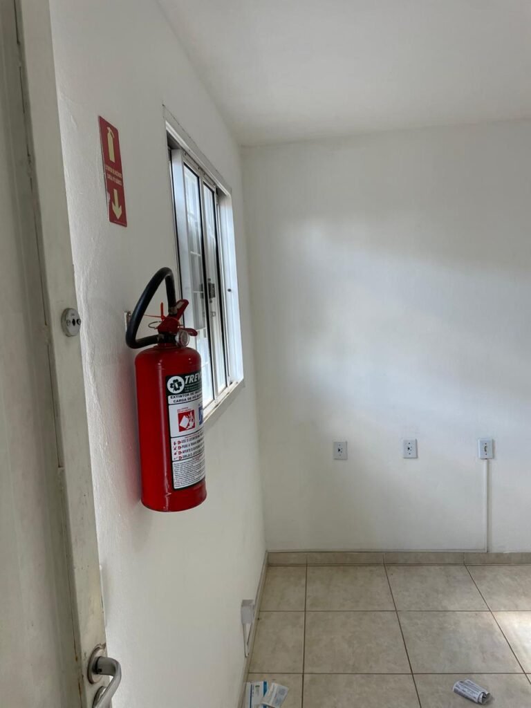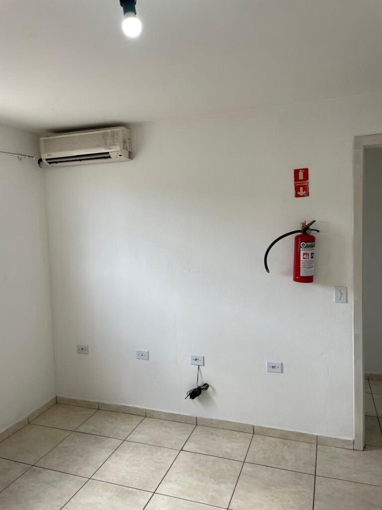 ESCRITÓRIO SUPERIOR-: 01 Porta de madeira com pintura nova na cor branco em ordem, com maçaneta em inox em ordem, com fechadura em ordem marca Aliança, com chave em ordem, pisos e rodapés revestidos de pisos frios cerâmicos em ordem, paredes e teto com pintura na cor branco neve nova e em ordem, 01 interruptor, 03 tomadas, 04 entradas para fio de dados e 01 espelho cego, ambos com espelho de luz em ordem, 01 espelho com fiação aparente e régua com 03 tomadas, 01 extintor de incêndio de pó químico bc 4kg 20-B:C com validade em ordem, 01 aparelho de ar condicionado marca Gree 9000 Btu não testado, com 01 controle sem funcionamento, 01 varão de cortina com acabamento solto e 02 folhas de cortina na cor rosa com desgastes naturais e restante em ordem, janela deslizante com 01 fechadura em ordem, com o 013 para cadeado, congratil de ferro de proteção em ordem, janela com pintura na cor branco em ordem, 01 fiação aparente, 01 bocal com 01 lâmpada em ordem.