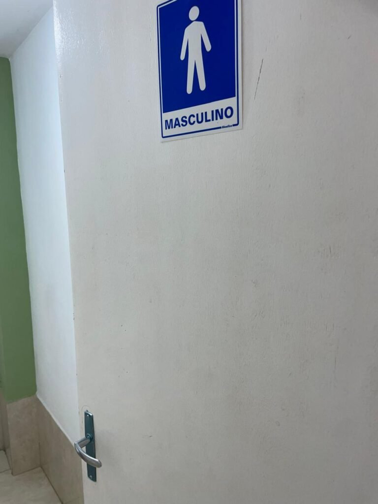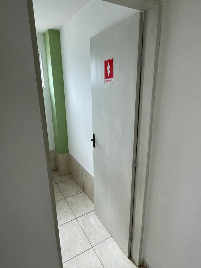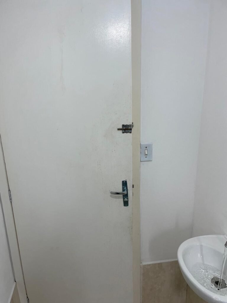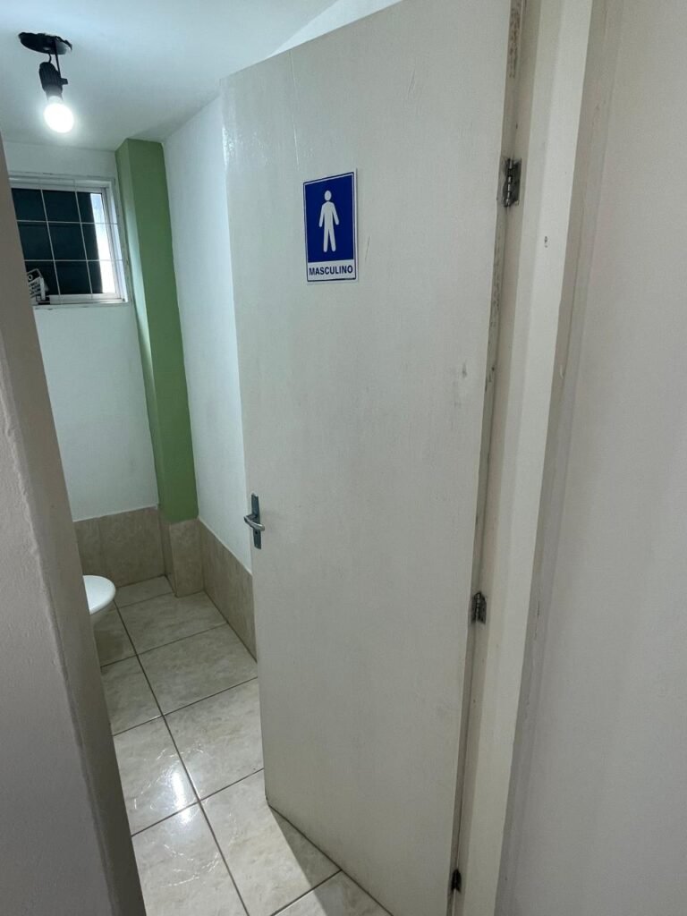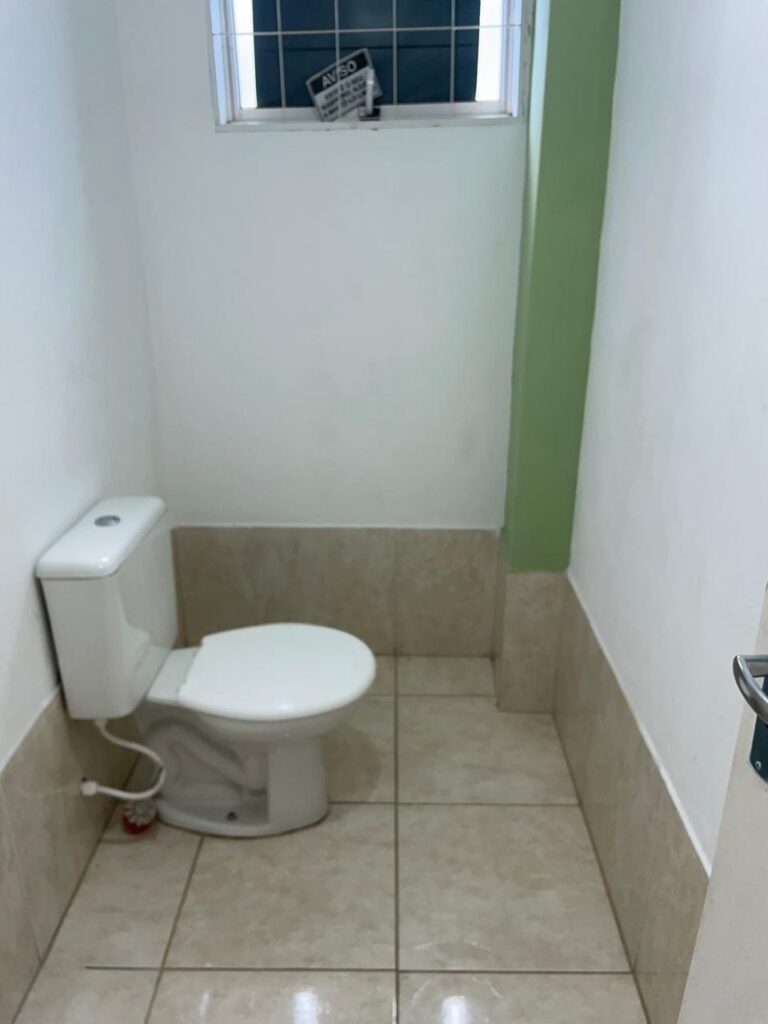WC ESCRITÓRIO SUPERIOR-: 01 Porta de madeira com pintura na cor branco gelo nova e em ordem, com placa de sinalização em ordem, com maçaneta com acabamento solto, com fechadura com chave em ordem, piso e rodapé revestido de pisos frios cerâmicos em ordem, 01 ralo em inox em ordem, conjunto lavatório de cerâmica cor branco, marca Icasa em ordem, 01 sifão sanfonado com vazamento, torneira em inox em ordem, conjunto sanitário de cerâmica cor branco, marca Logasa em ordem, válvula de inox de descarga embutida, descarga em ordem, tampa e assento marca Herc em ordem, restante das paredes e teto com pintura na cor branco neve nova e em ordem, Pilar com pintura na cor verde nova e em ordem, 01 vitrô basculante com fechadura em ordem, com 01 folha de acrílico em ordem e com gradil de proteção em ordem, janela com pintura na cor branco em ordem, 01 bocal com 01 lâmpada LED em ordem, 01 canopla de registro em inox em ordem.