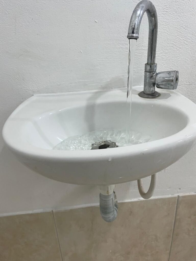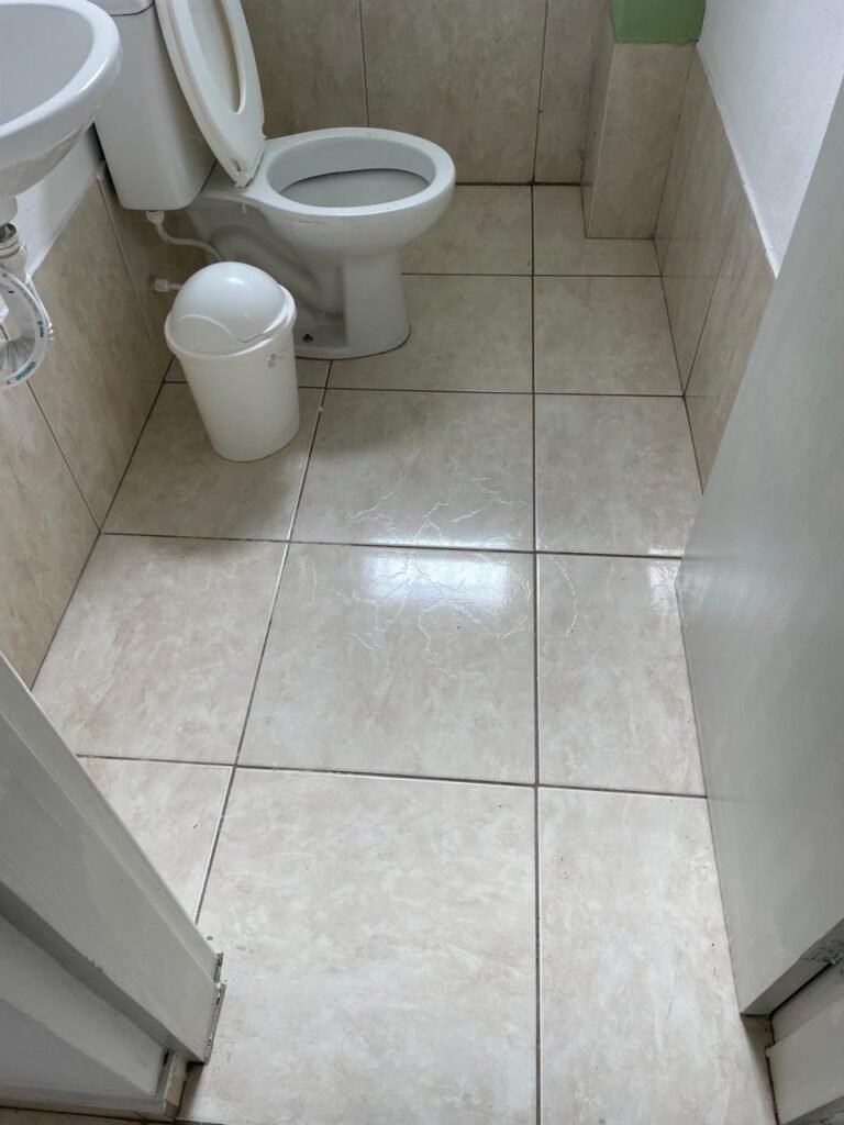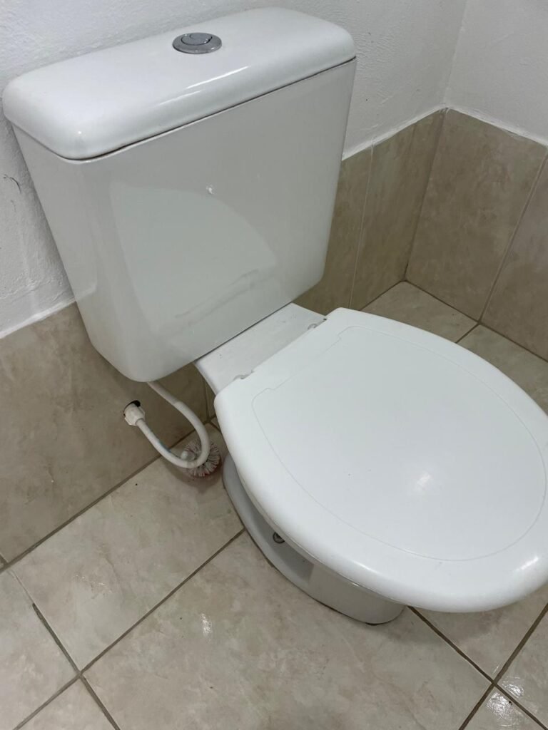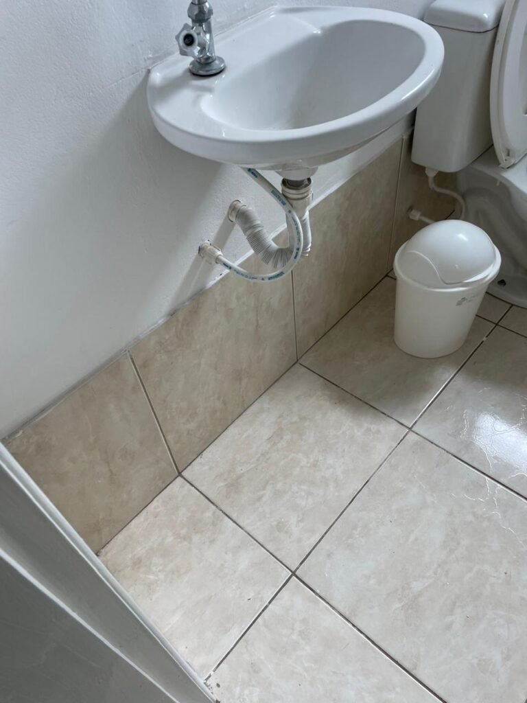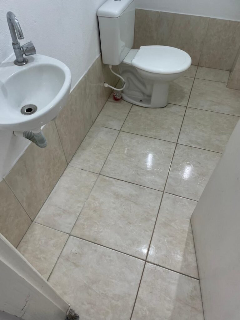 WC ESCRITÓRIO SUPERIOR-: 01 Porta de madeira com pintura na cor branco gelo nova e em ordem, com placa de sinalização em ordem, com maçaneta com acabamento solto, com fechadura com chave em ordem, piso e rodapé revestido de pisos frios cerâmicos em ordem, 01 ralo em inox em ordem, conjunto lavatório de cerâmica cor branco, marca Icasa em ordem, 01 sifão sanfonado com vazamento, torneira em inox em ordem, conjunto sanitário de cerâmica cor branco, marca Logasa em ordem, válvula de inox de descarga embutida, descarga em ordem, tampa e assento marca Herc em ordem, restante das paredes e teto com pintura na cor branco neve nova e em ordem, Pilar com pintura na cor verde nova e em ordem, 01 vitrô basculante com fechadura em ordem, com 01 folha de acrílico em ordem e com gradil de proteção em ordem, janela com pintura na cor branco em ordem, 01 bocal com 01 lâmpada LED em ordem, 01 canopla de registro em inox em ordem.